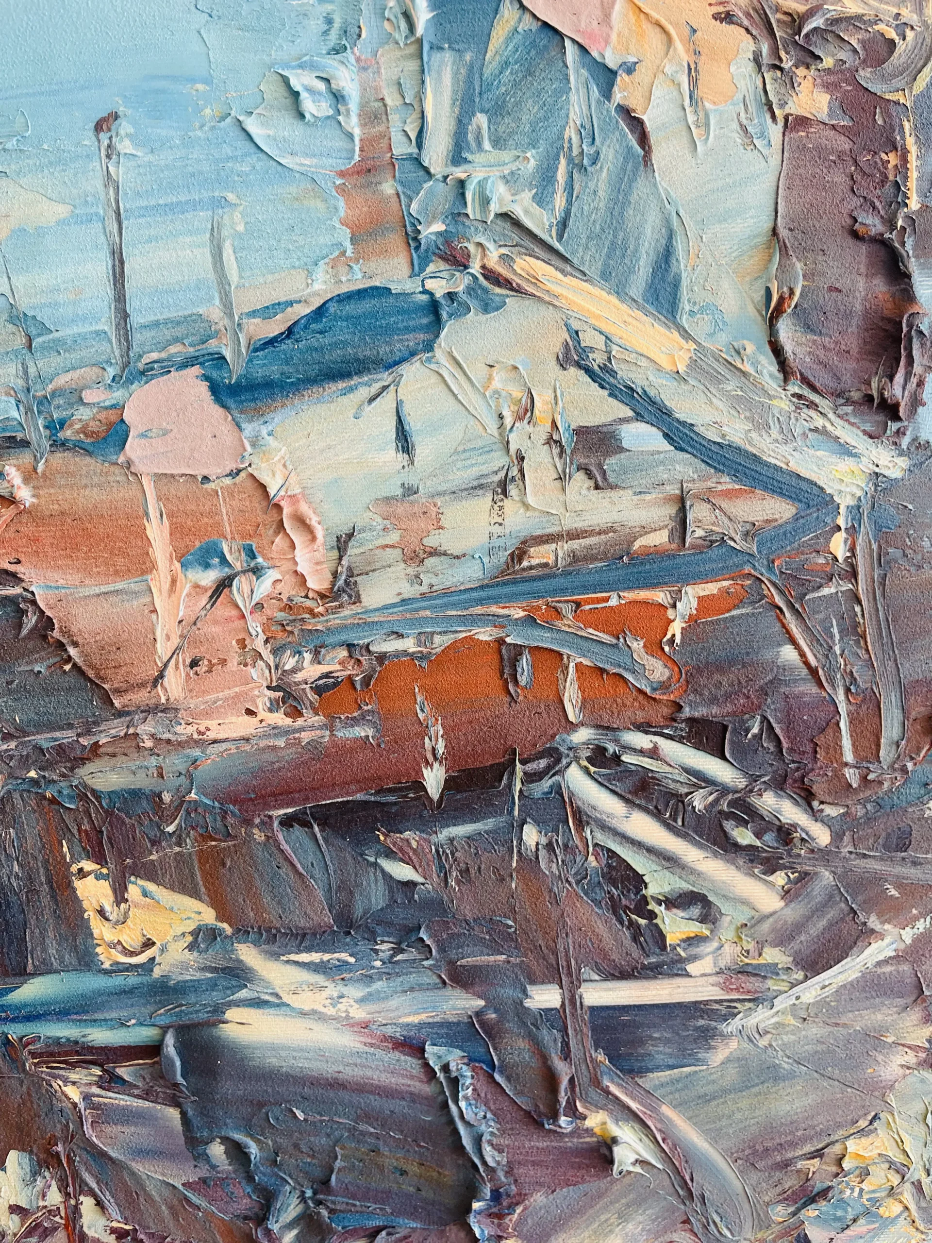 In a square format, the painting takes shape through a textured art approach using the impasto technique with palette knife and brush. Thick oil paint layers interact with light, enhancing surface variation and physical presence. This Amalfi Coast abstract painting adds atmosphere and character to contemporary interiors, studios, and private collections, appealing to collectors drawn to expressive, material-driven coastal art.