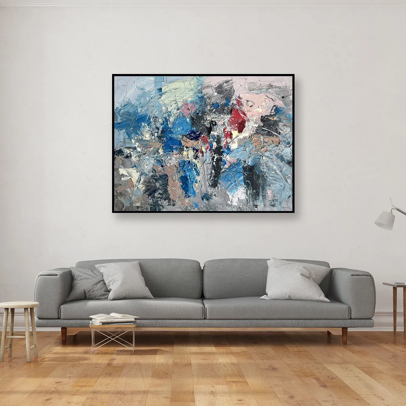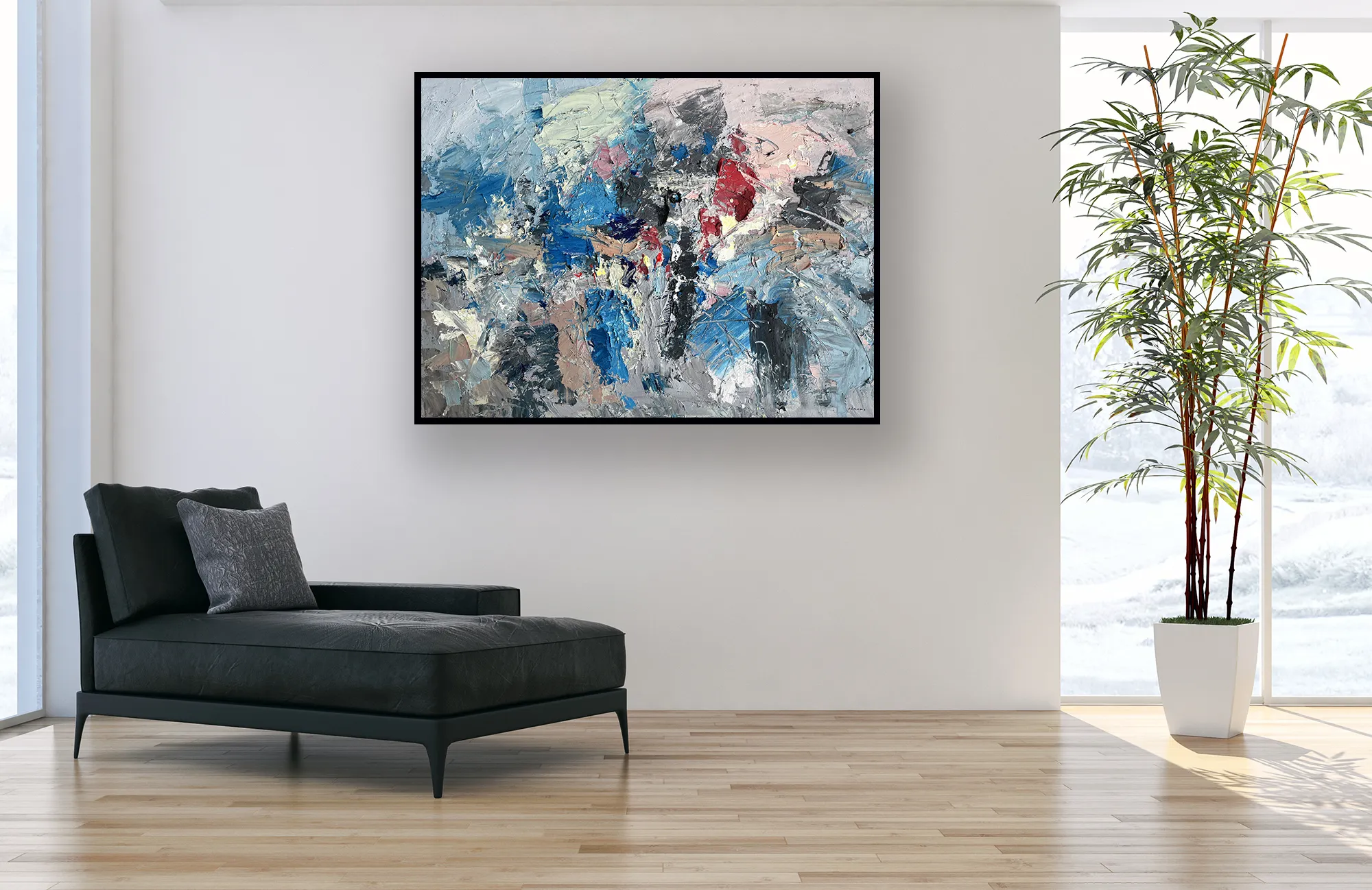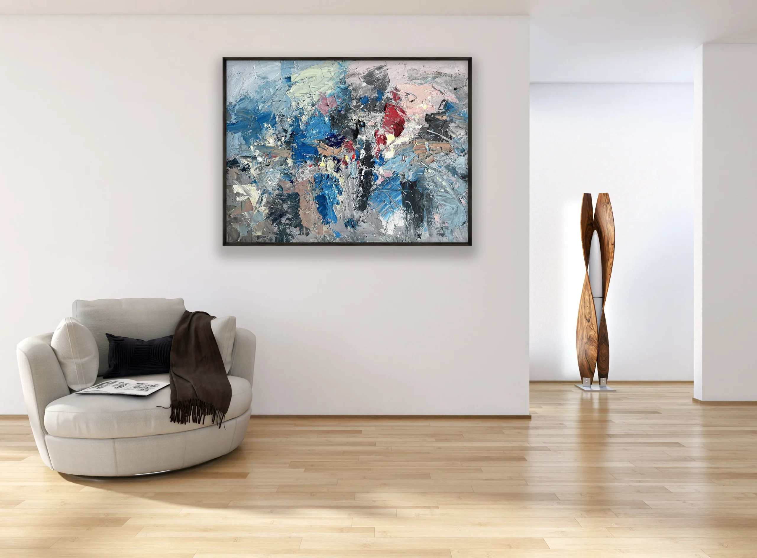 Presented in a large horizontal format, the painting is created using a textured art approach with palette knife and brush. Thick layers of oil paint interact with light, producing depth, dimension, and a tactile surface rich in variation. This gestural abstract painting adds atmosphere and character to interior spaces, making it suitable for refined homes and contemporary art collectors.