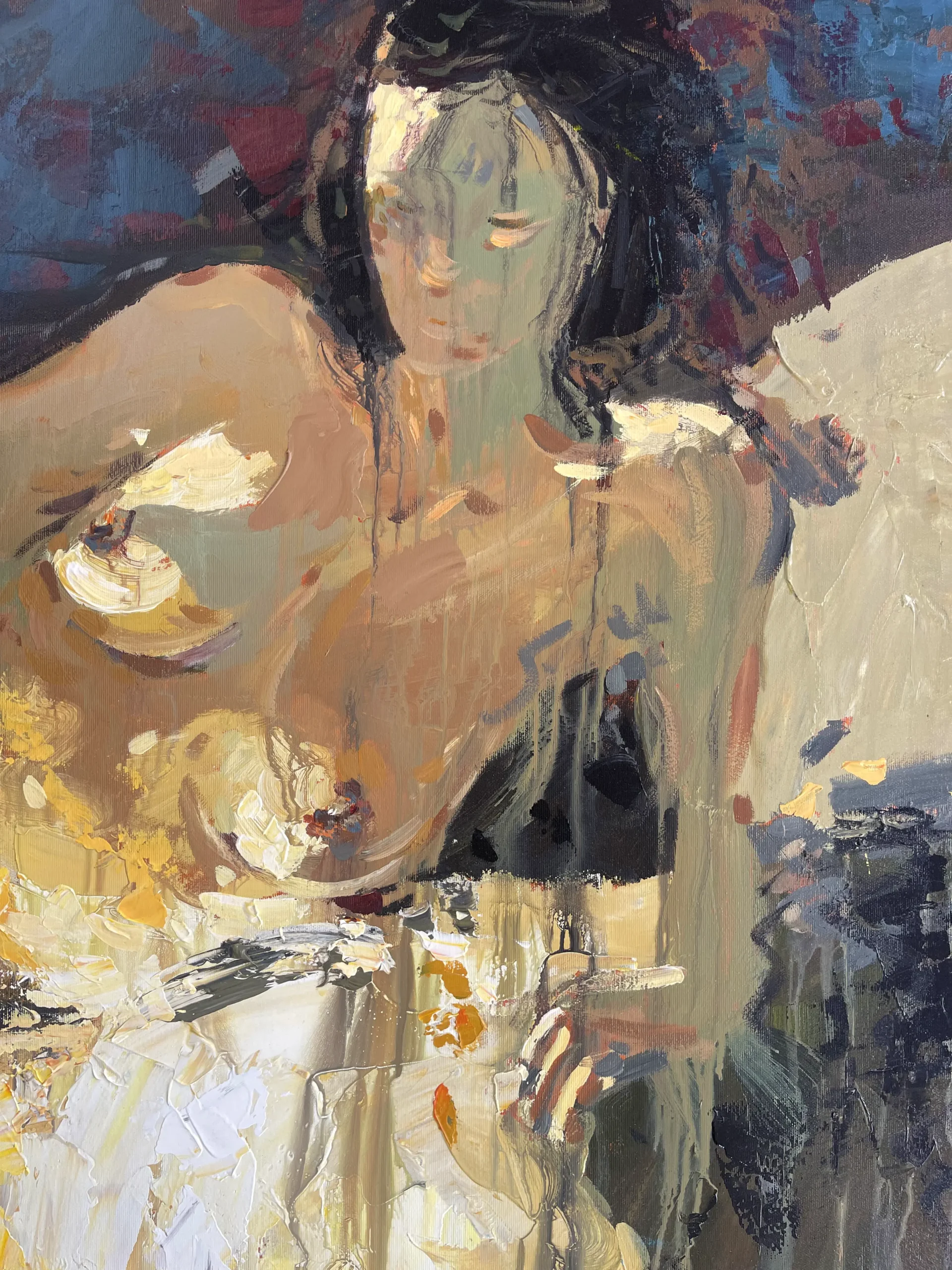 In a horizontal format, the painting takes shape through a textured art approach using the impasto technique with palette knife and brush. Thick layers of oil paint interact with light, enhancing surface variation, volume, and physical presence. This figurative nude painting adds artistic character and elegance to refined interiors, studios, and private art collections.