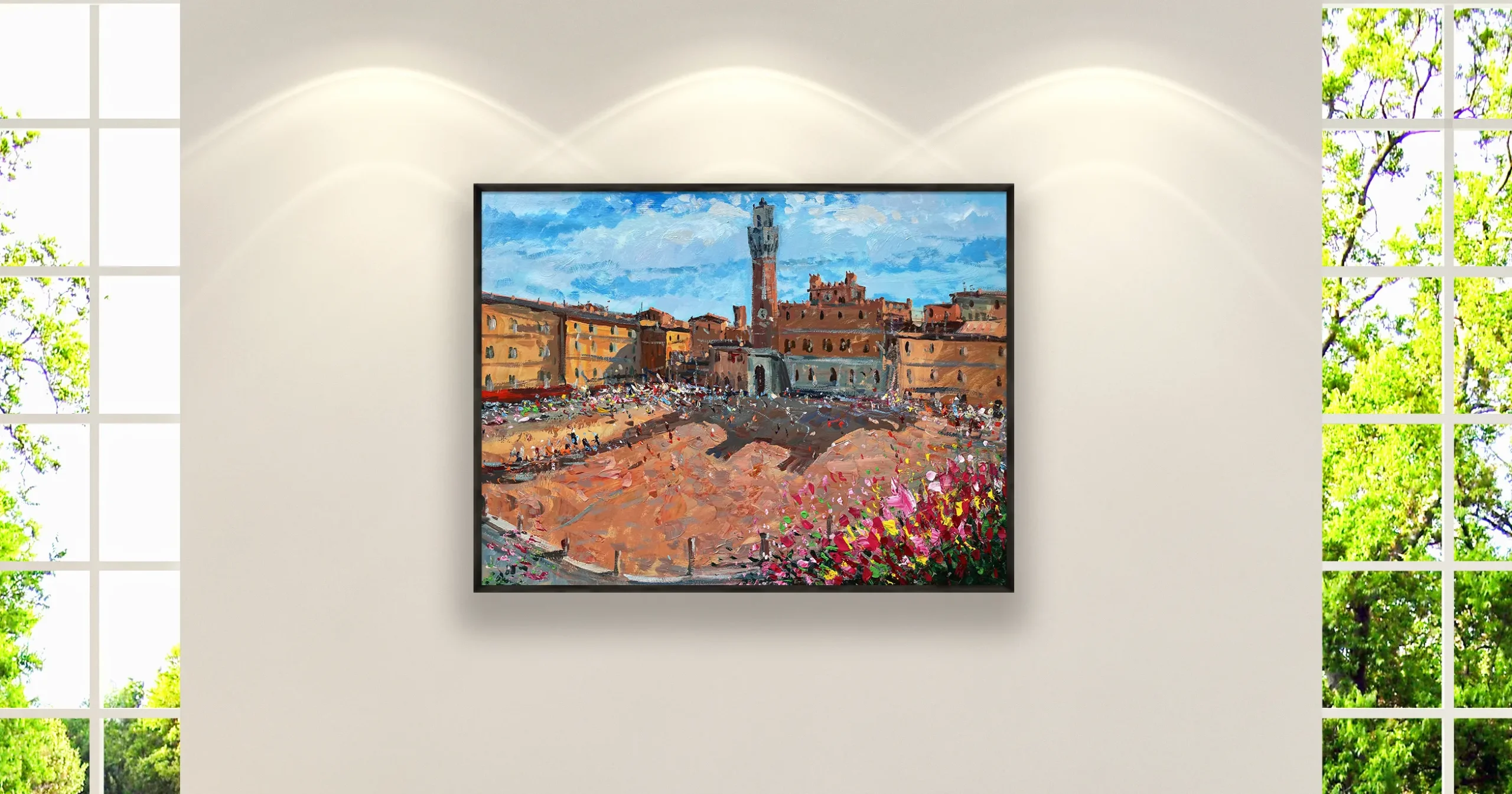In a large horizontal format, the painting takes shape through a textured art approach using the impasto technique with palette knife and brush. Thick layers of paint interact with light to create movement, dimension, and a strong physical presence. This Siena cityscape painting brings character and elegance to interior spaces, making it ideal for collectors who appreciate authentic, handcrafted oil painting.