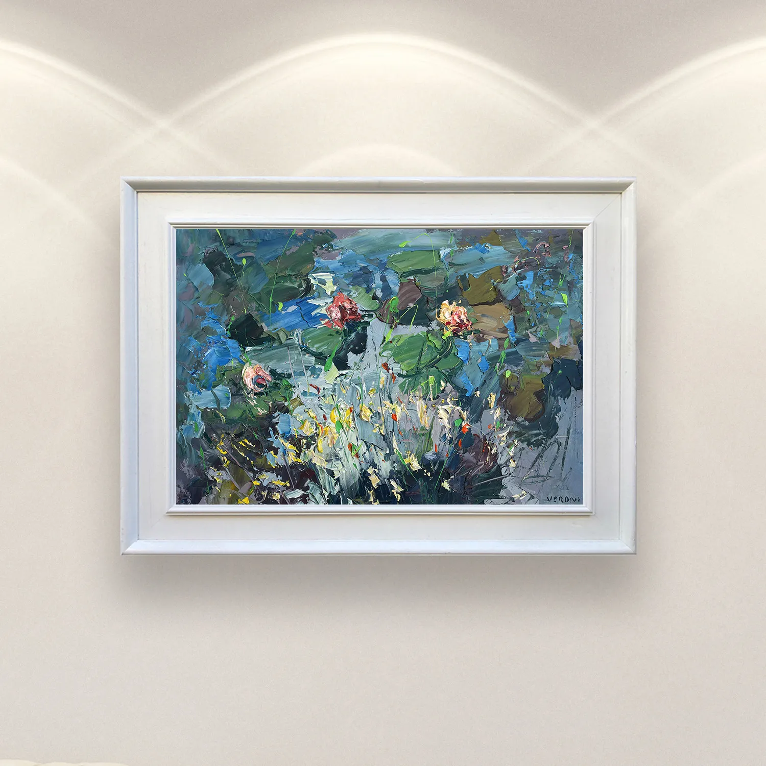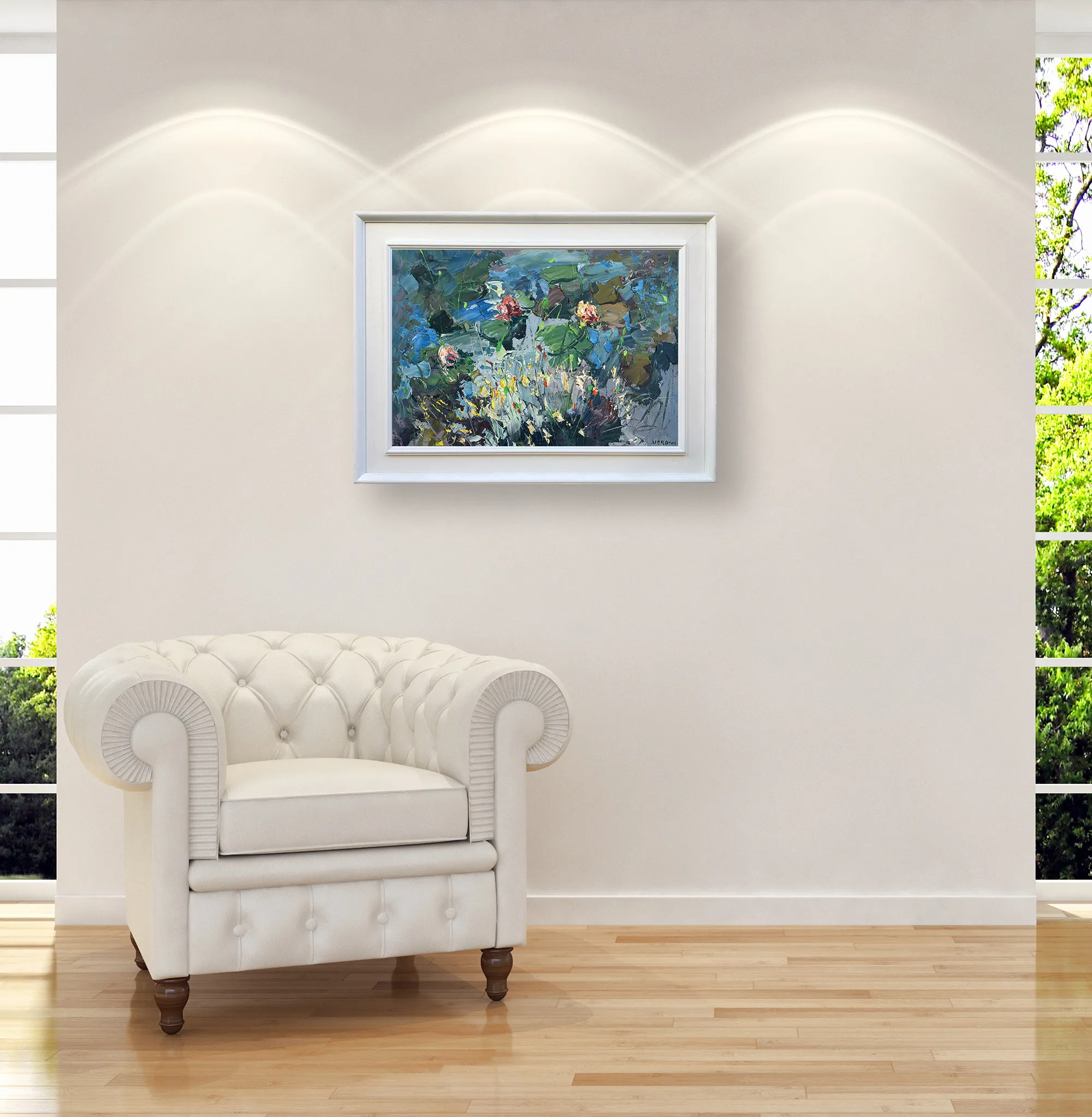 In a horizontal format, the painting is developed through a refined painterly approach using brushwork and subtle texture. Controlled layers of oil paint interact softly with light, creating depth and visual balance. This floral wall art for interiors adds elegance and serenity to living spaces, making it ideal for refined homes and collectors.