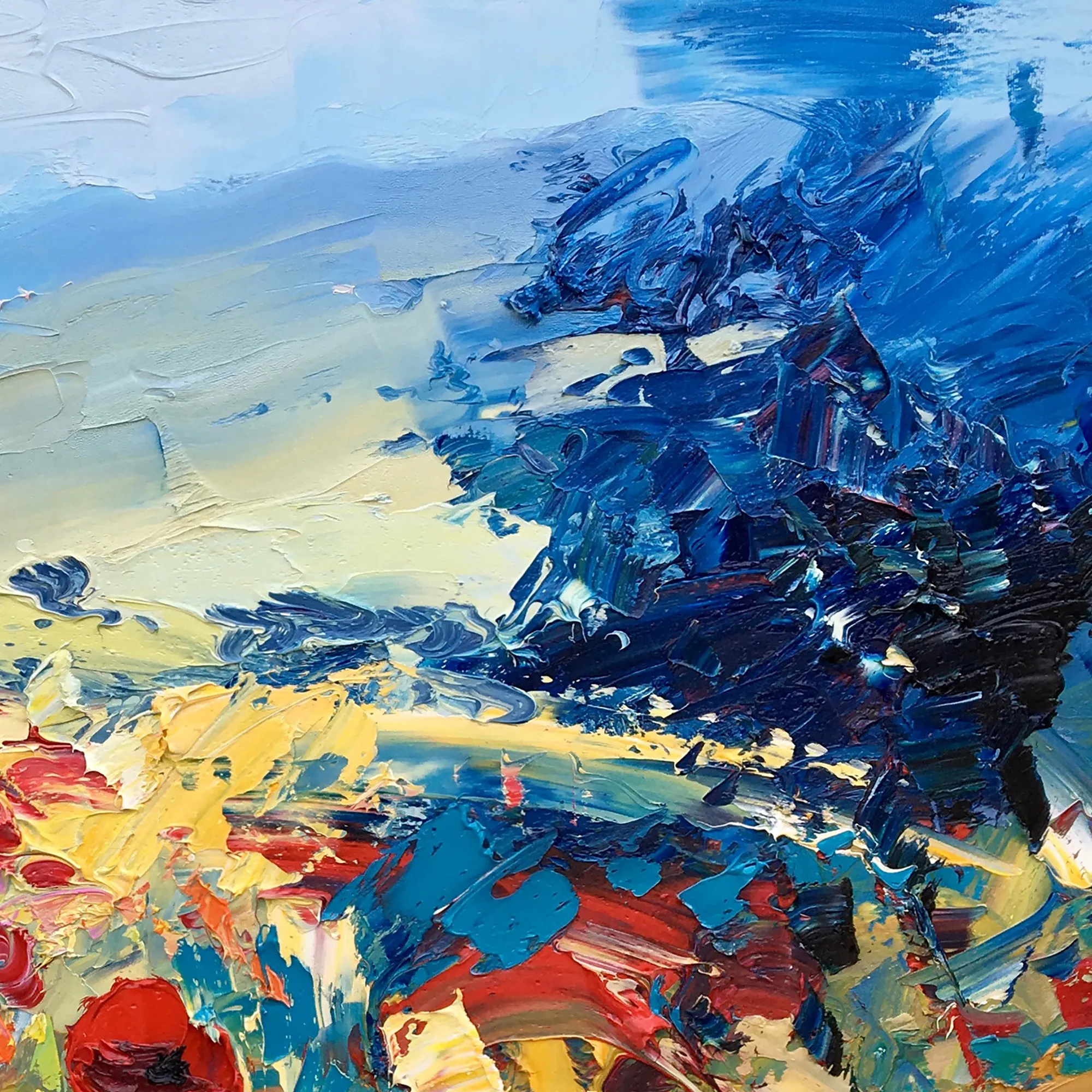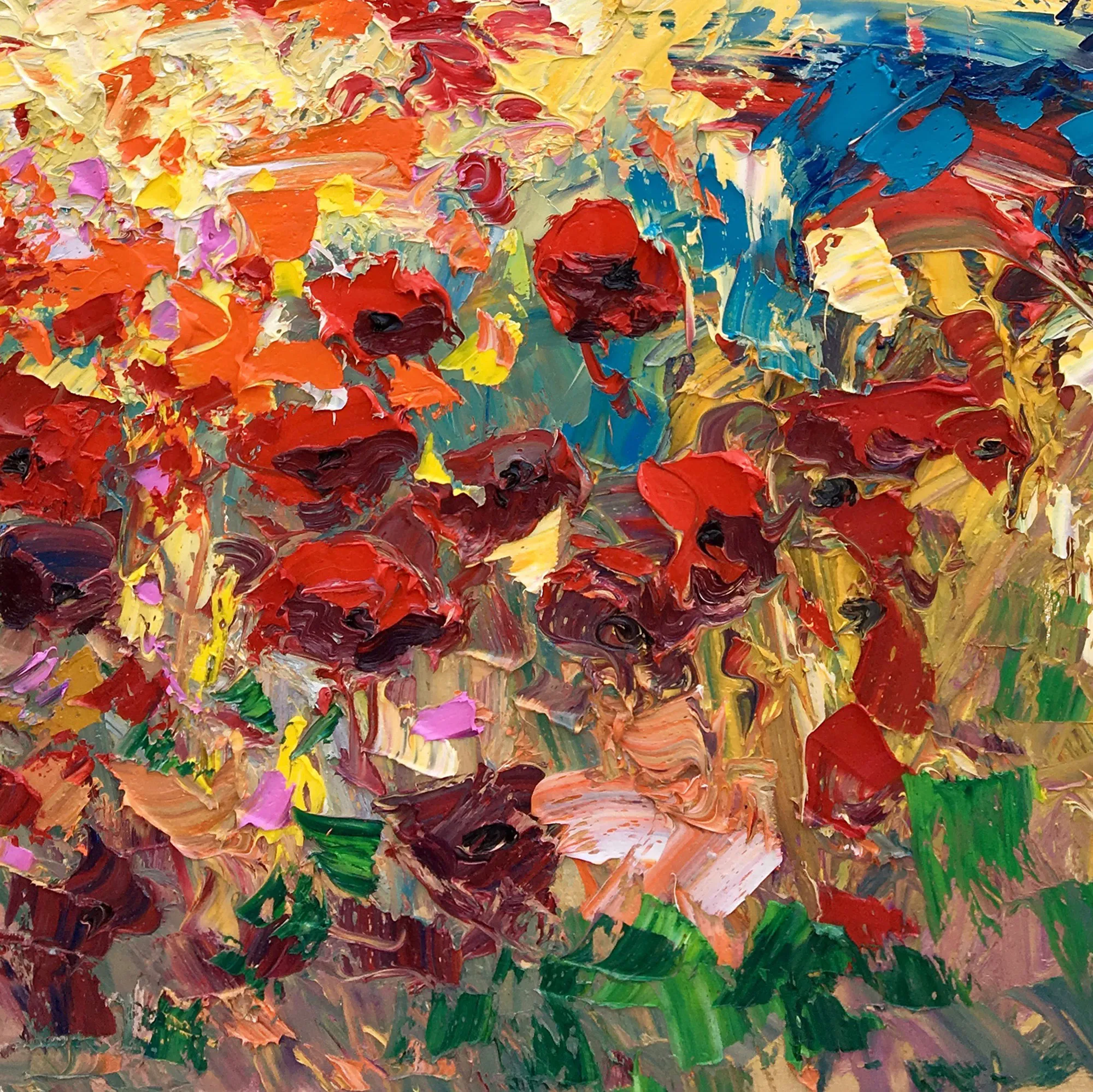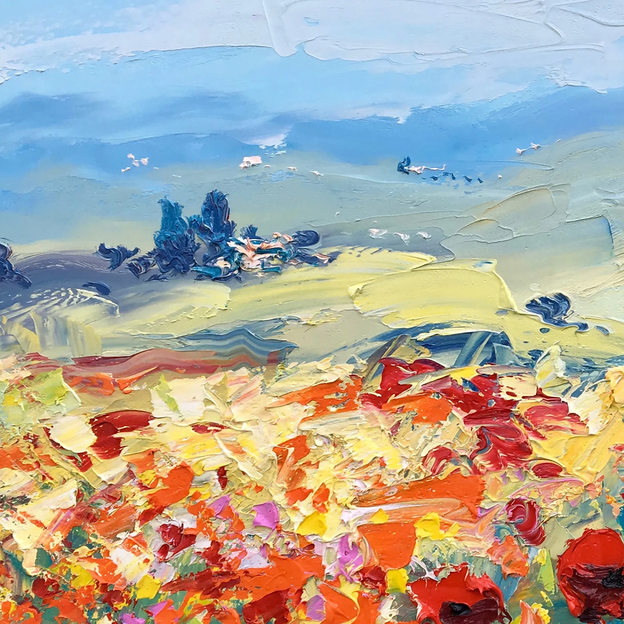 In this original Tuscany landscape oil painting, I captured the joyful energy of a summer meadow. Using a palette knife technique, I applied thick layers of oil paint (heavy impasto) to give life to the red poppies. This modern impressionist style focuses on the contrast between bold reds and deep blues, creating dynamic movement.