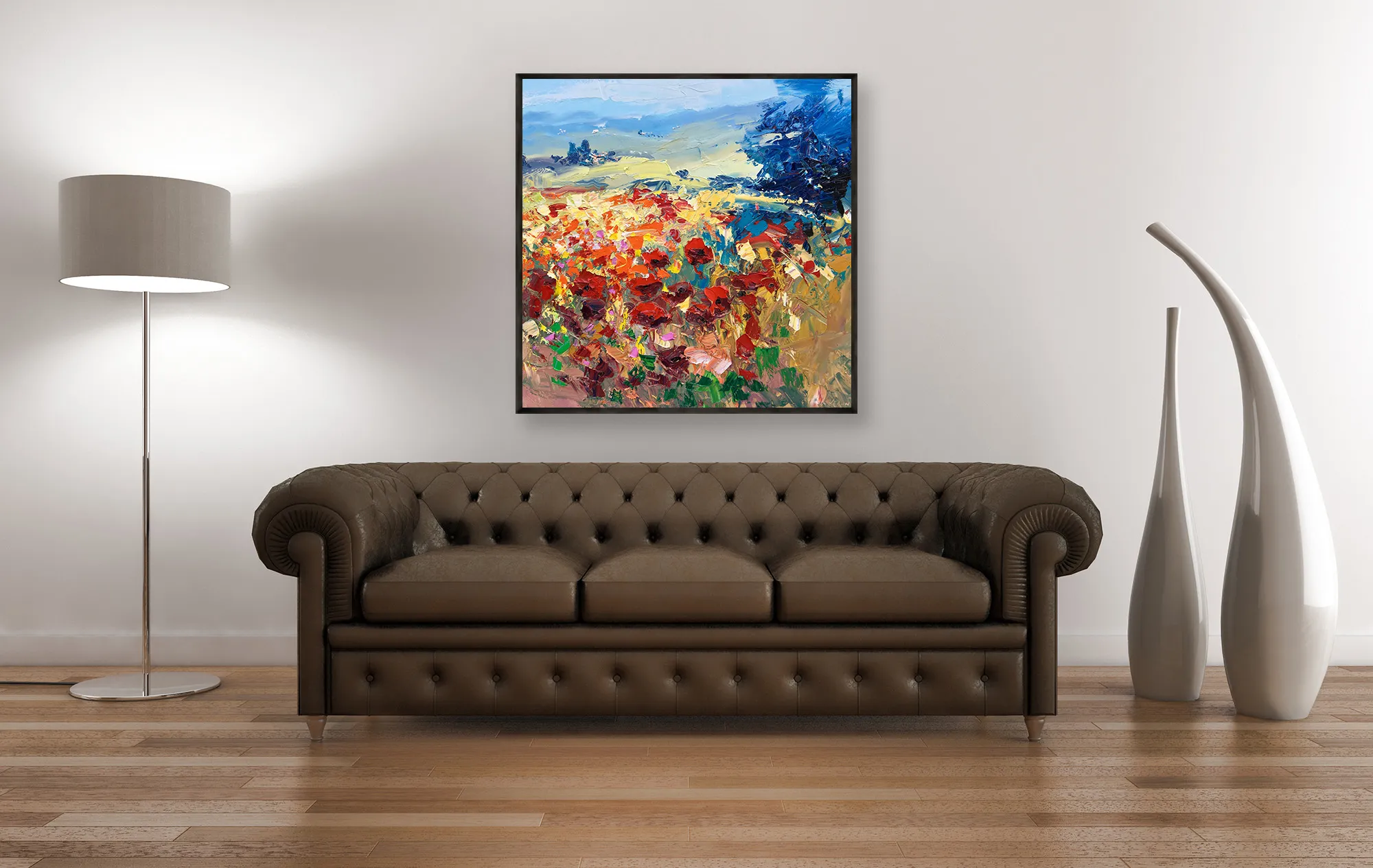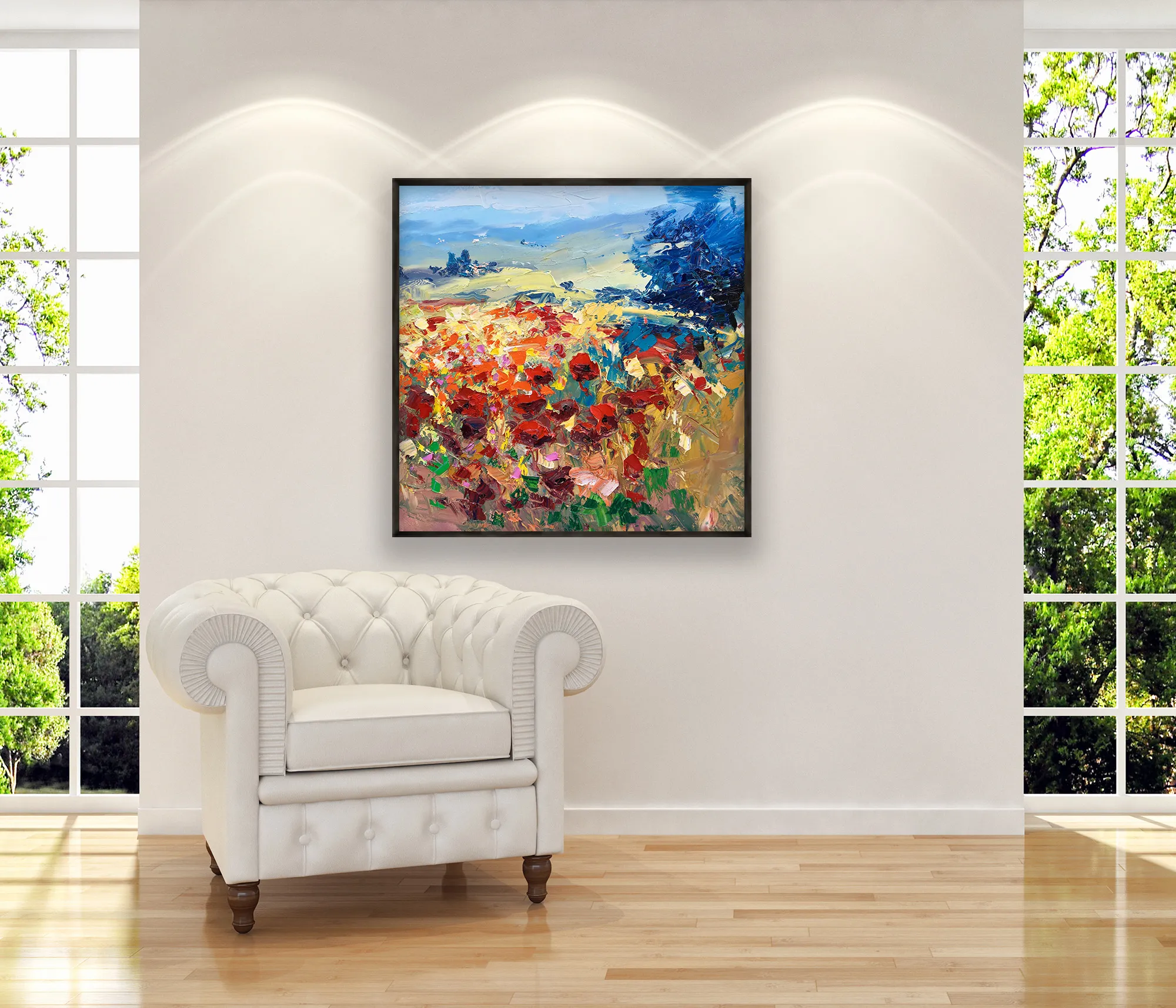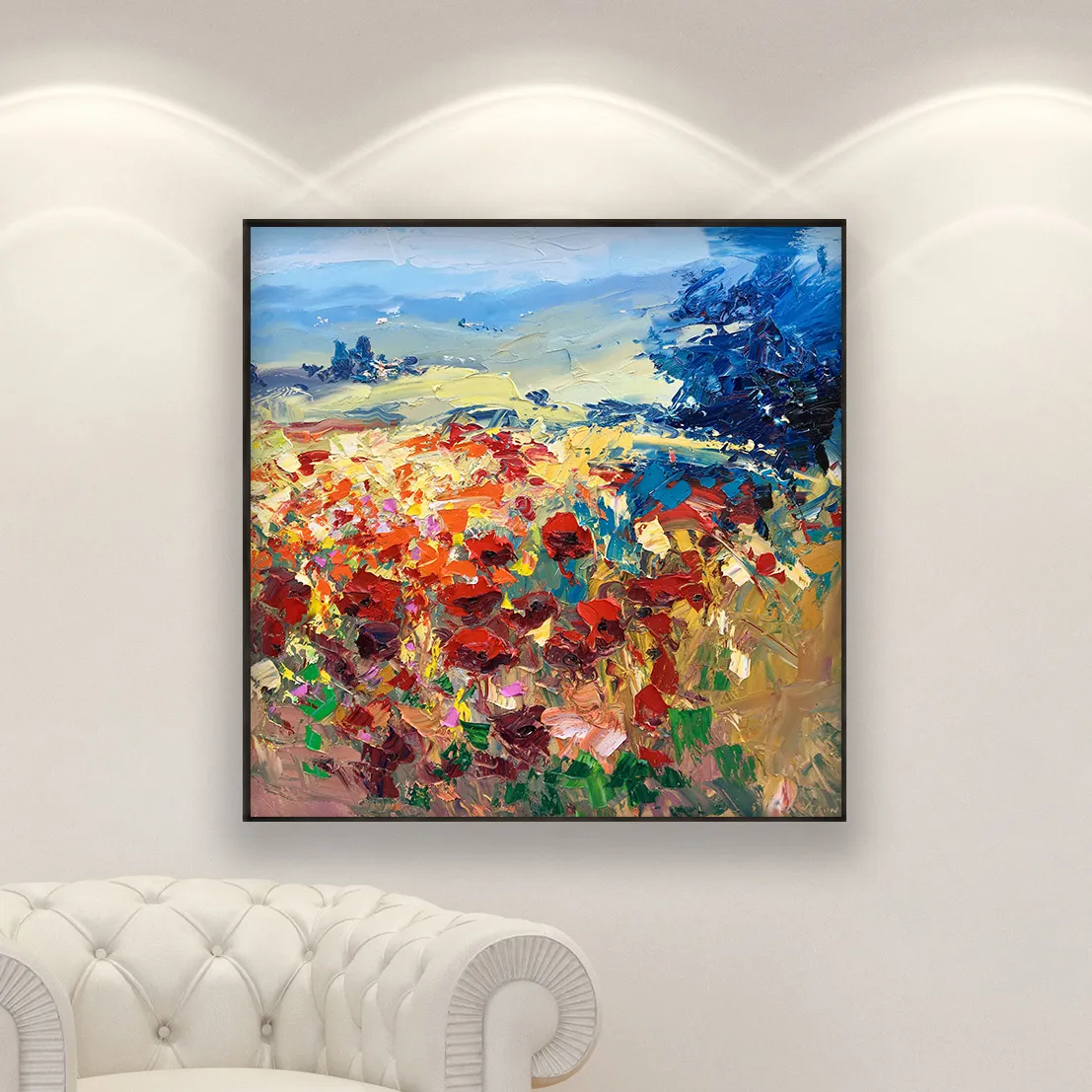 In this original Tuscany landscape oil painting, I captured the joyful energy of a summer meadow. Using a palette knife technique, I applied thick layers of oil paint (heavy impasto) to give life to the red poppies. This modern impressionist style focuses on the contrast between bold reds and deep blues, creating dynamic movement.