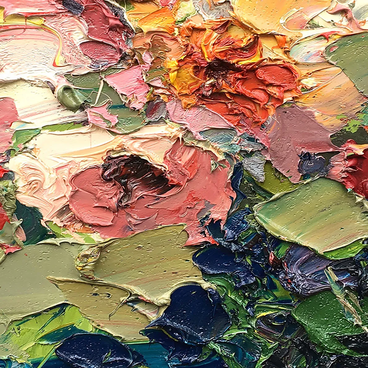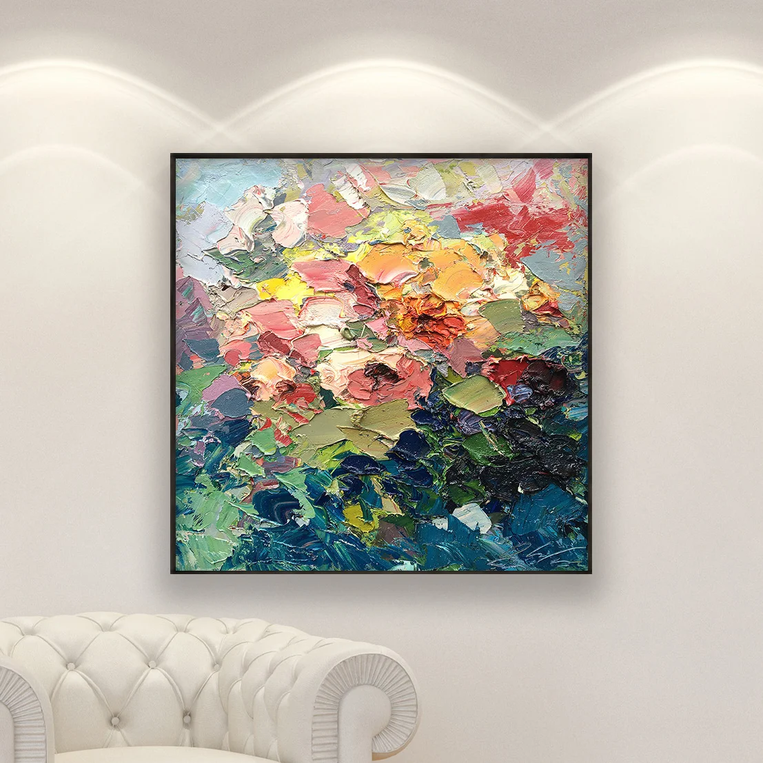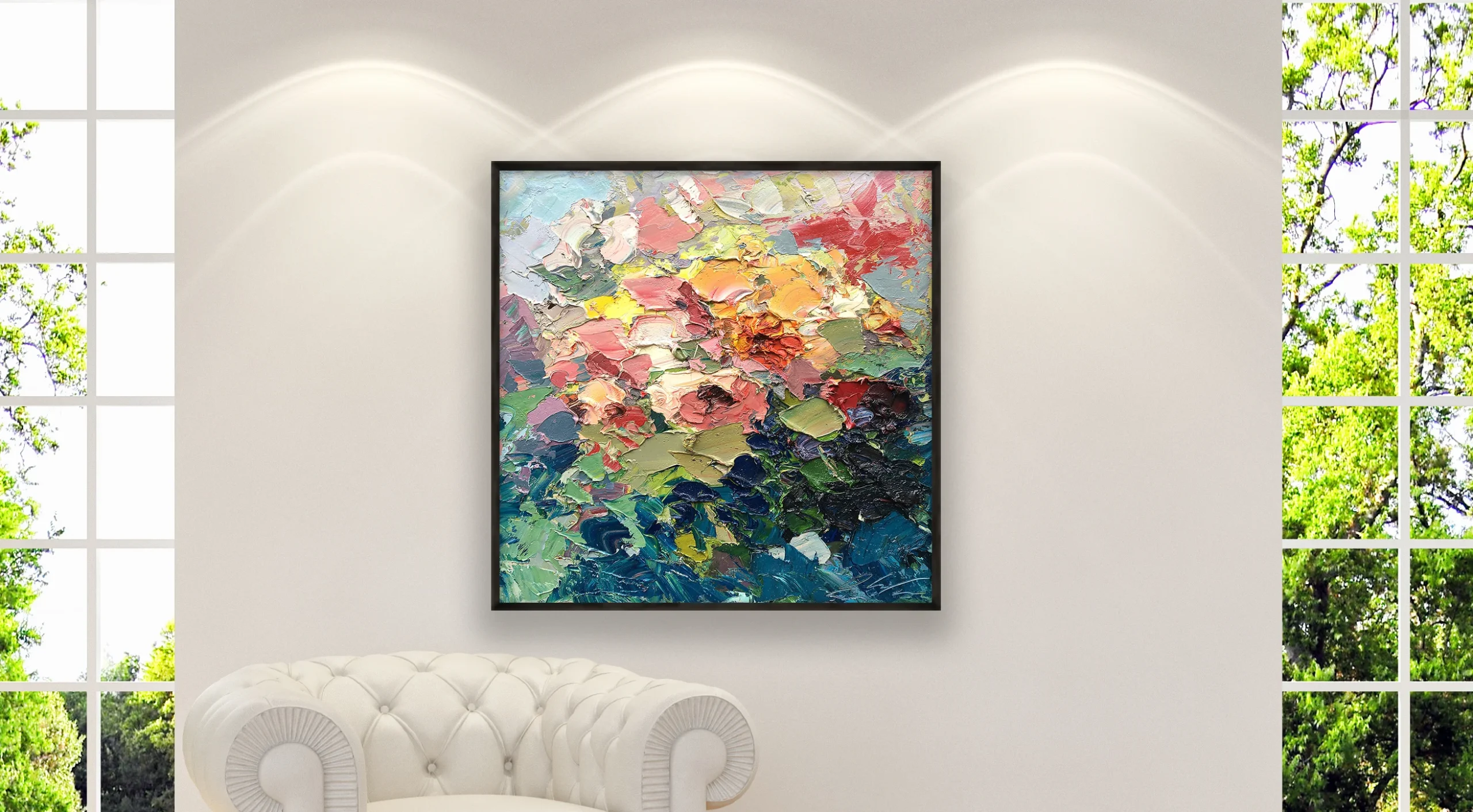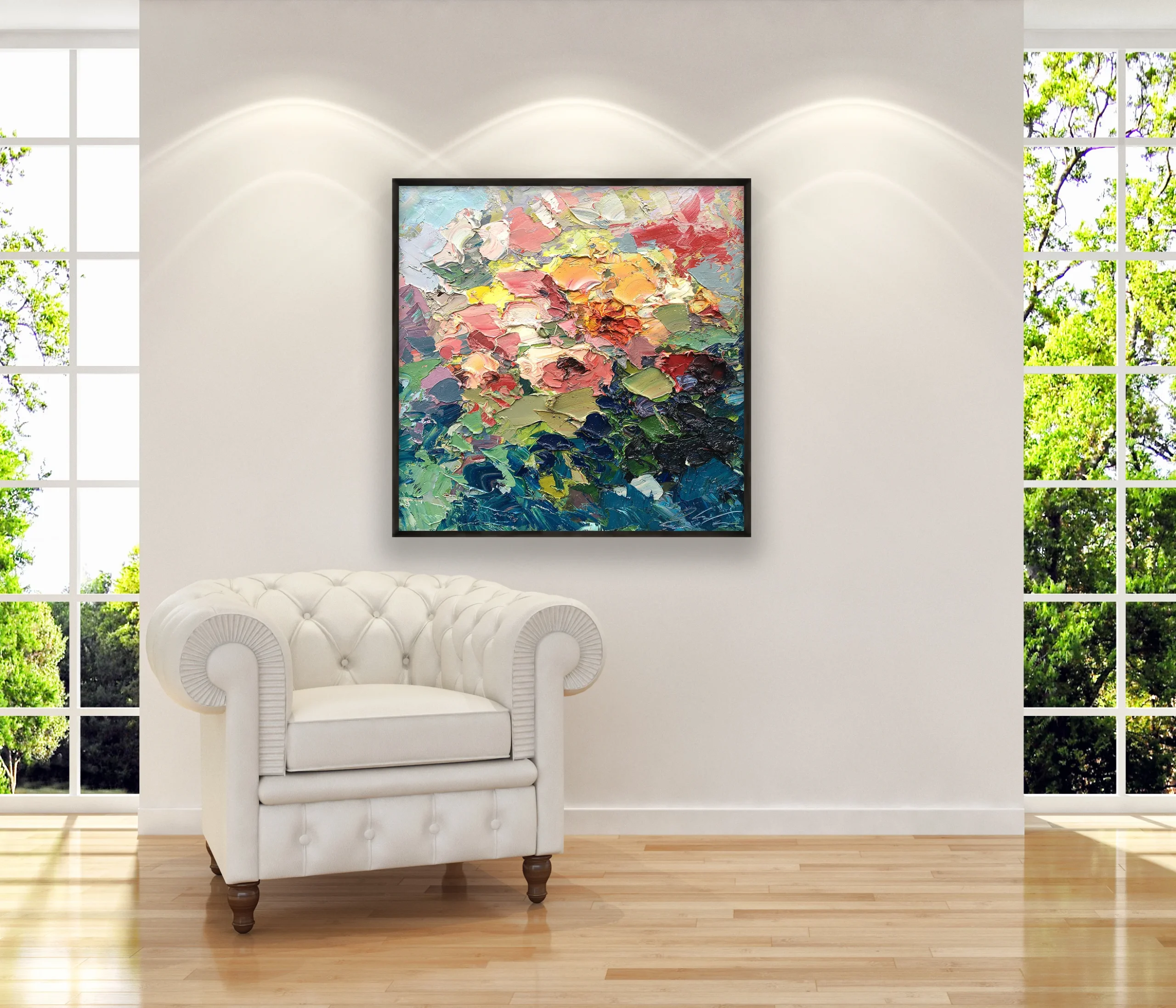 In a large square format, the painting takes shape through a textured art approach using the impasto technique with palette knife and brush. Thick layers of paint to interact with light and create movement, dimension, and a strong physical presence. This floral roses painting brings atmosphere and character to interior spaces, making it ideal for refined homes and collectors.