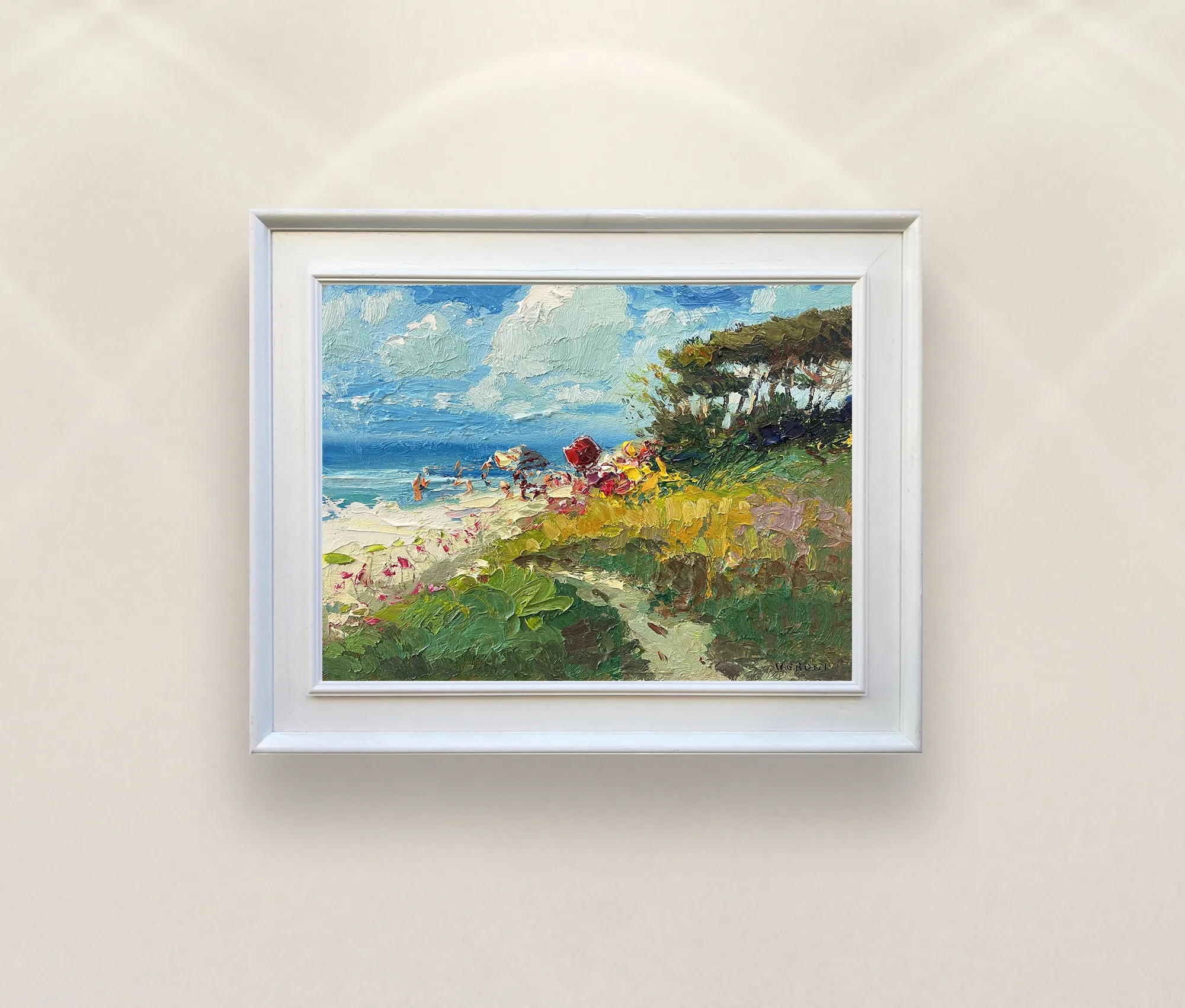 Experience the vibrant energy of the Mediterranean with this original beach oil painting. This artwork captures a bright Italian summer view, featuring golden sands, lush coastal vegetation, and white clouds over a turquoise sea. Hand-painted with a palette knife, the heavy impasto technique creates a stunning 3D texture. A unique coastal masterpiece, perfect for adding a sunny, contemporary touch to your home decor.