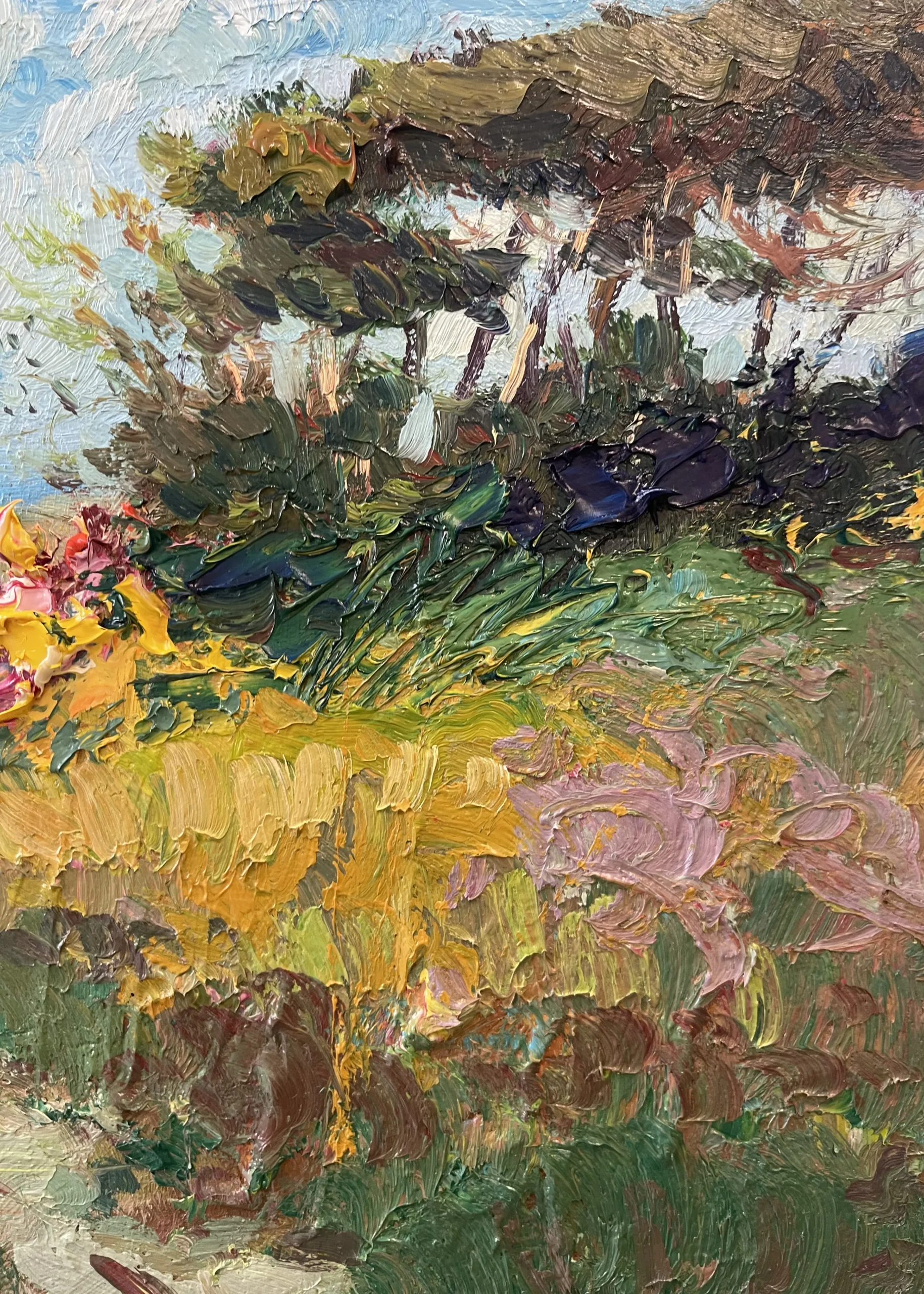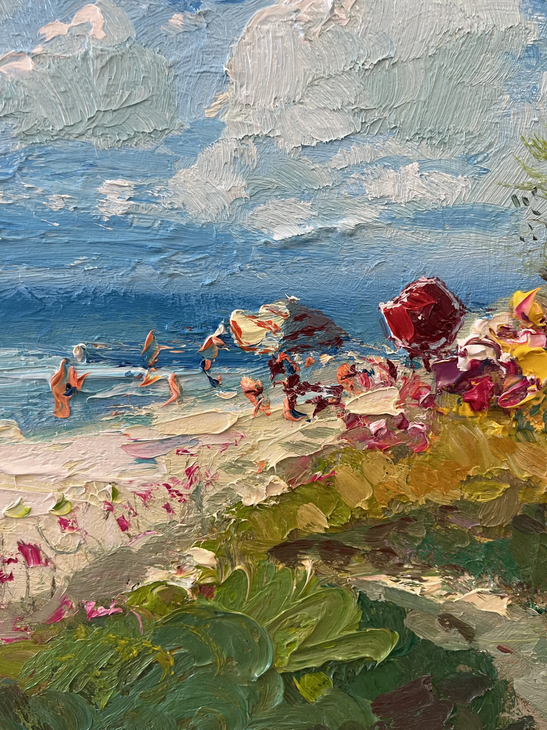 In this original beach oil painting, I used an energetic palette knife technique to build the thick, textured layers of the shore and the sky. The heavy impasto style gives a sense of movement to the waves and the clouds. This modern impressionist work brings the authentic light and warmth of Italy to any wall.