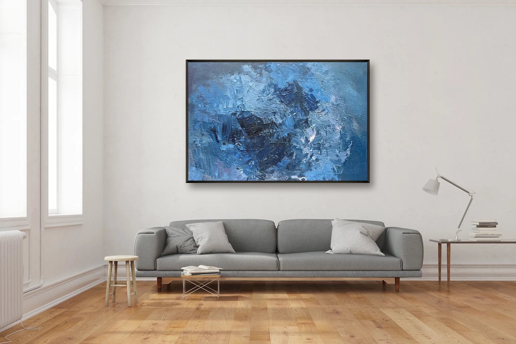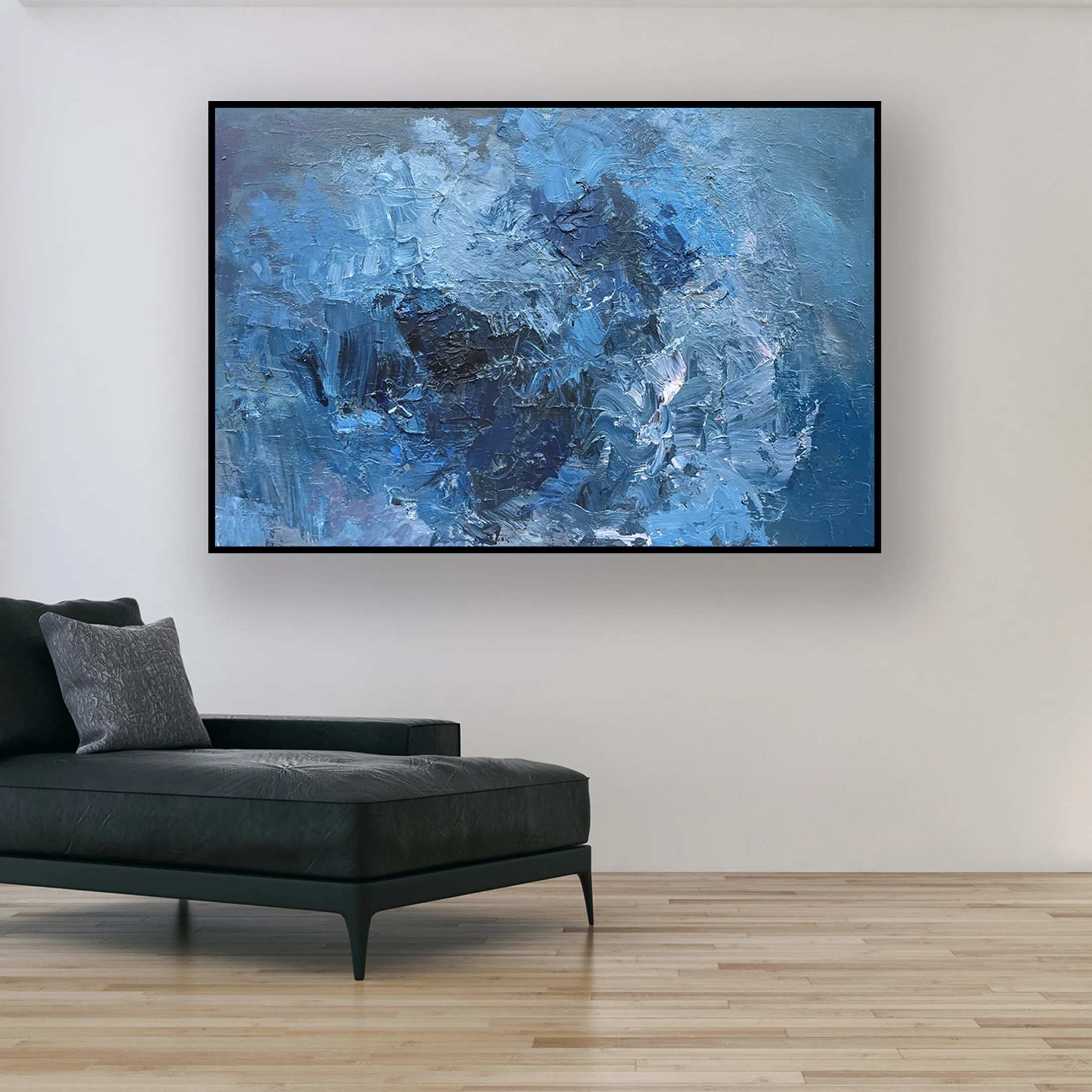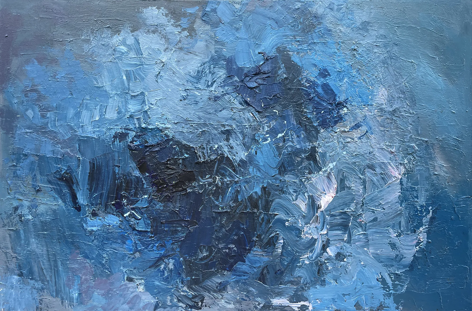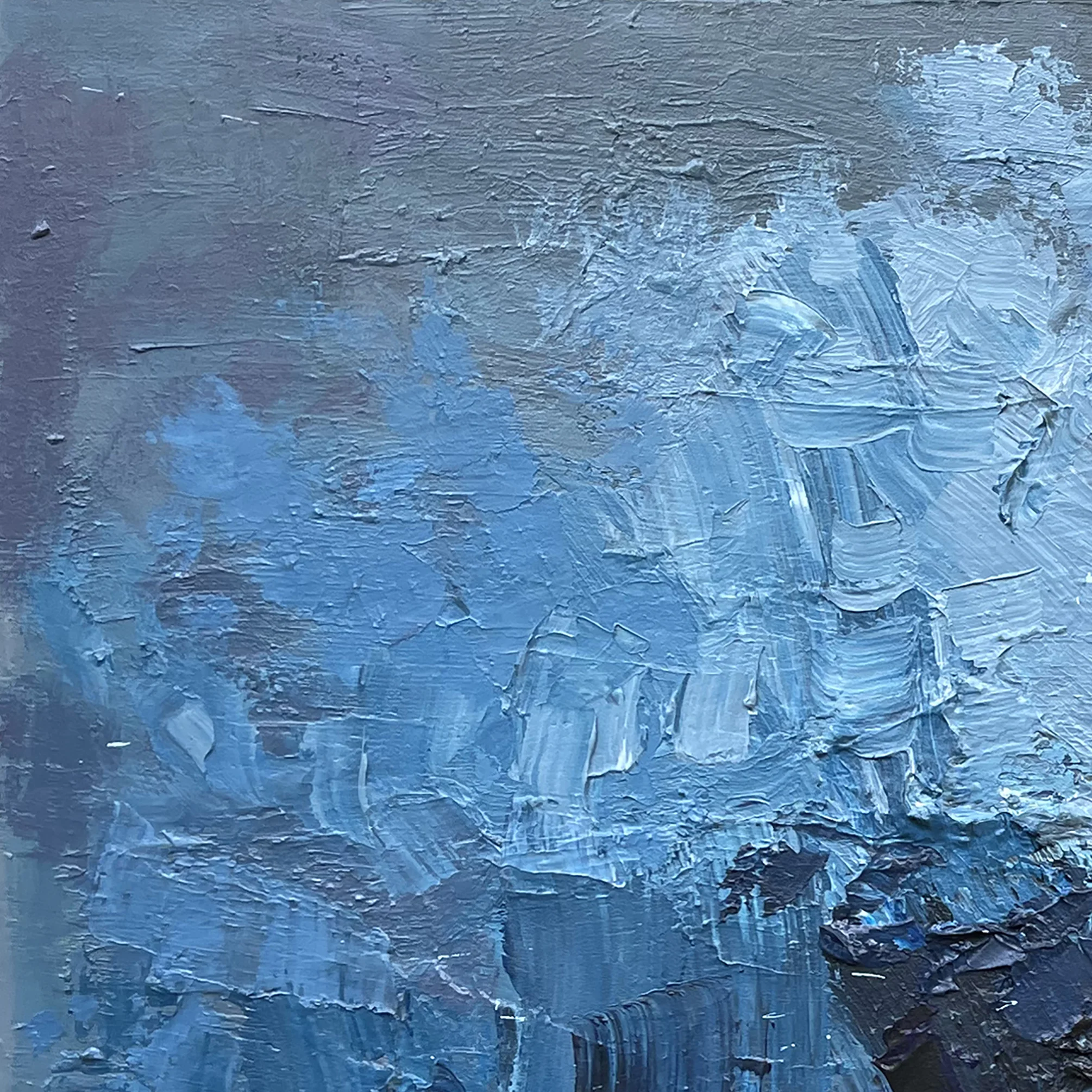 In this original blue abstract painting, I focused on the emotional power of color. Using a palette knife technique, I applied thick layers of oil paint (heavy impasto) to create a rugged, organic surface. This method allows for a rich interplay of shades and shadows, giving the canvas a sculptural quality that emphasizes the physical presence of the medium and its expressive energy.