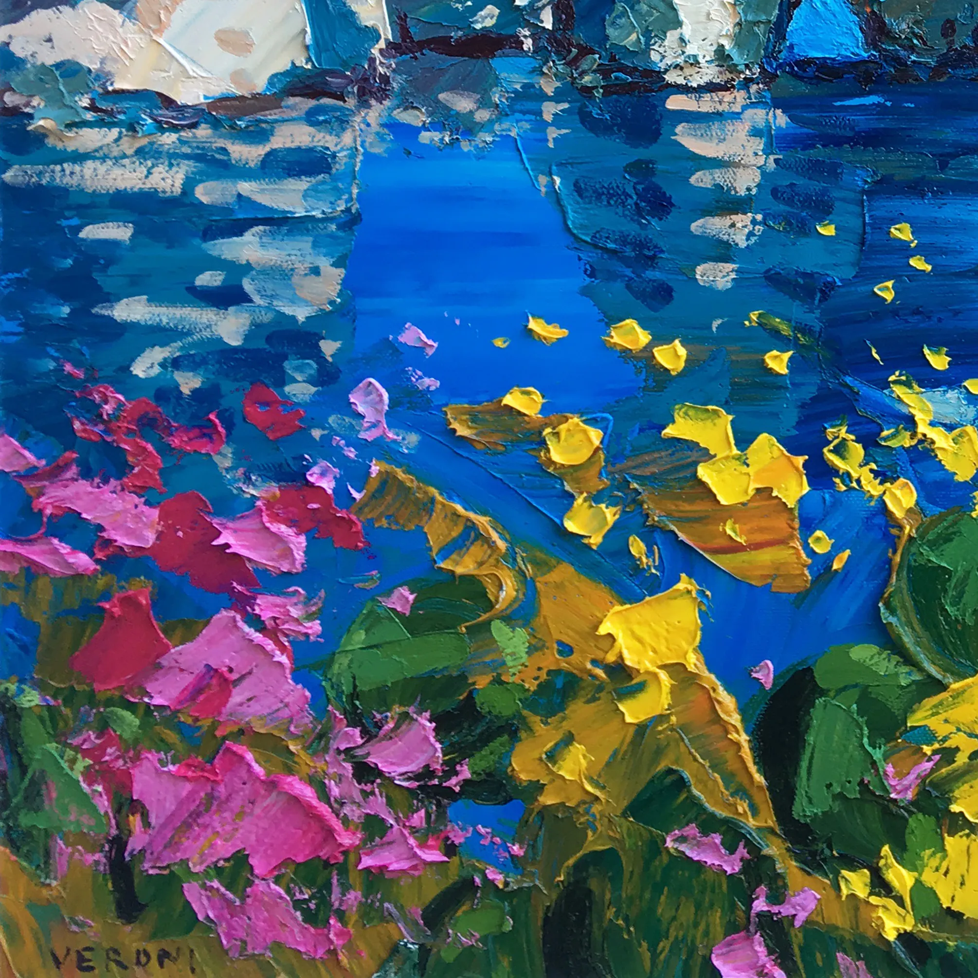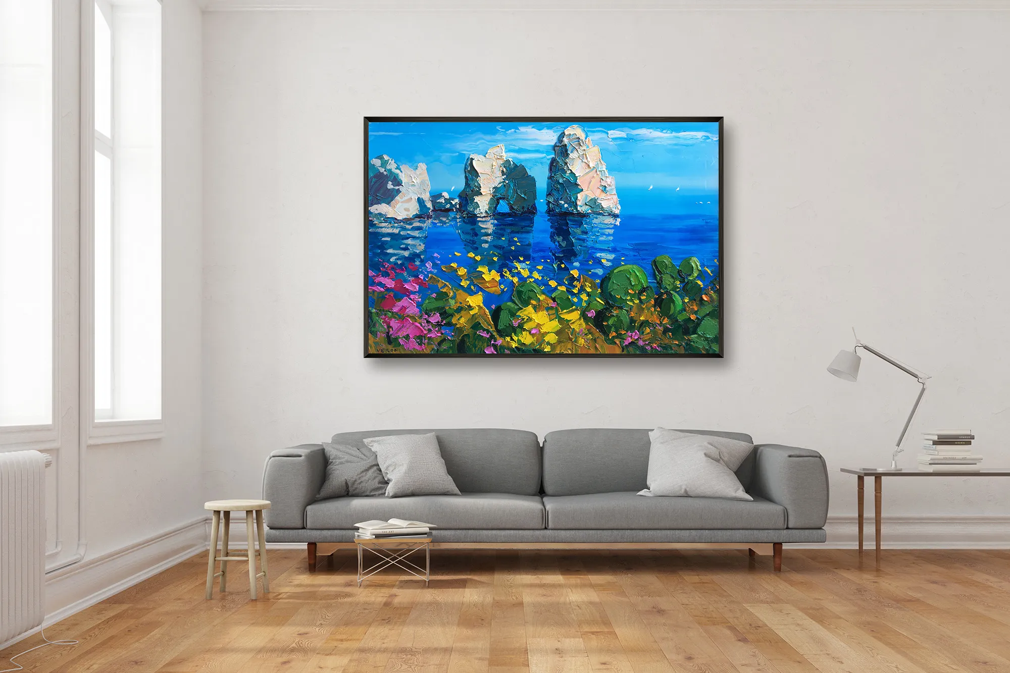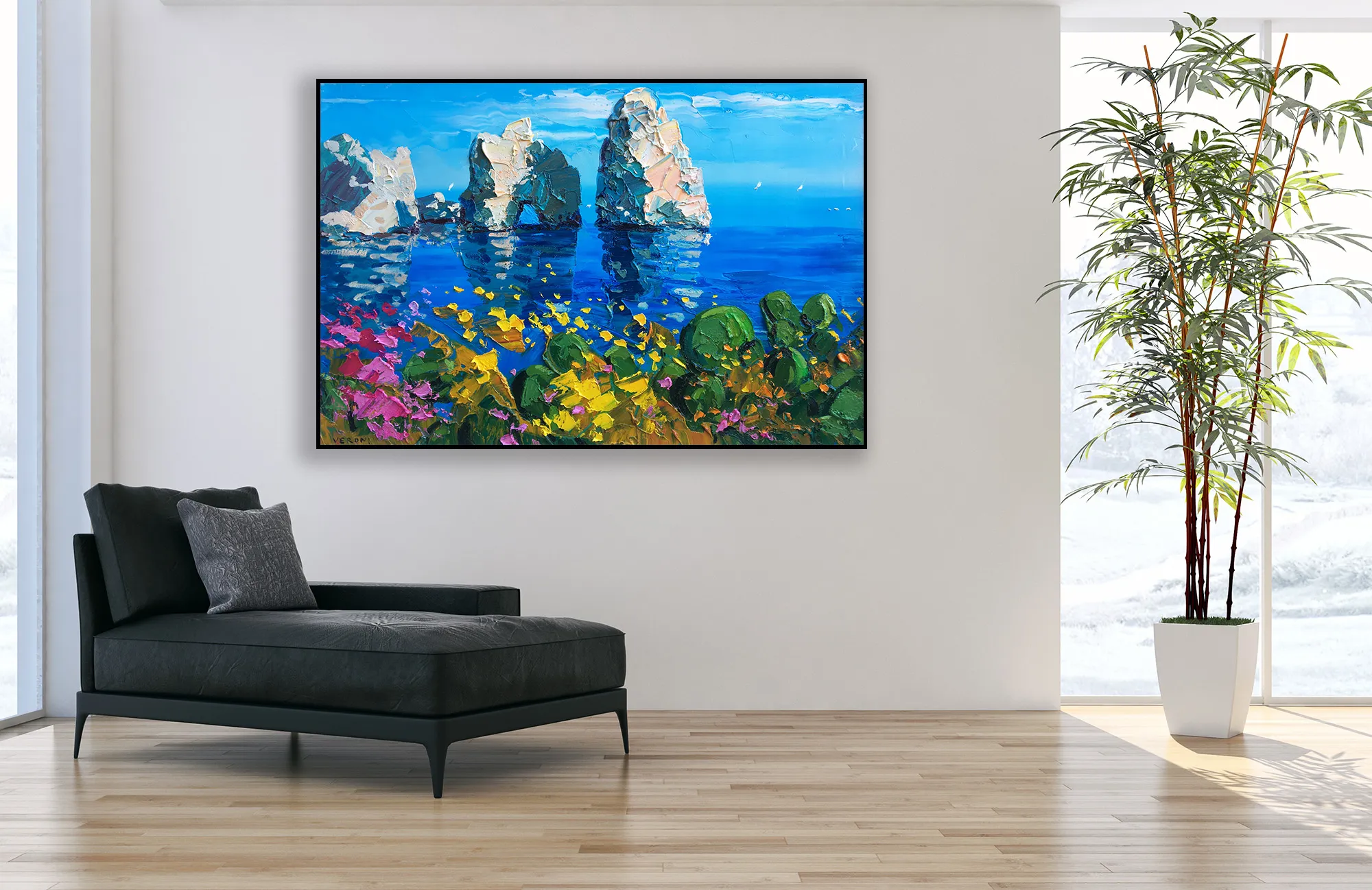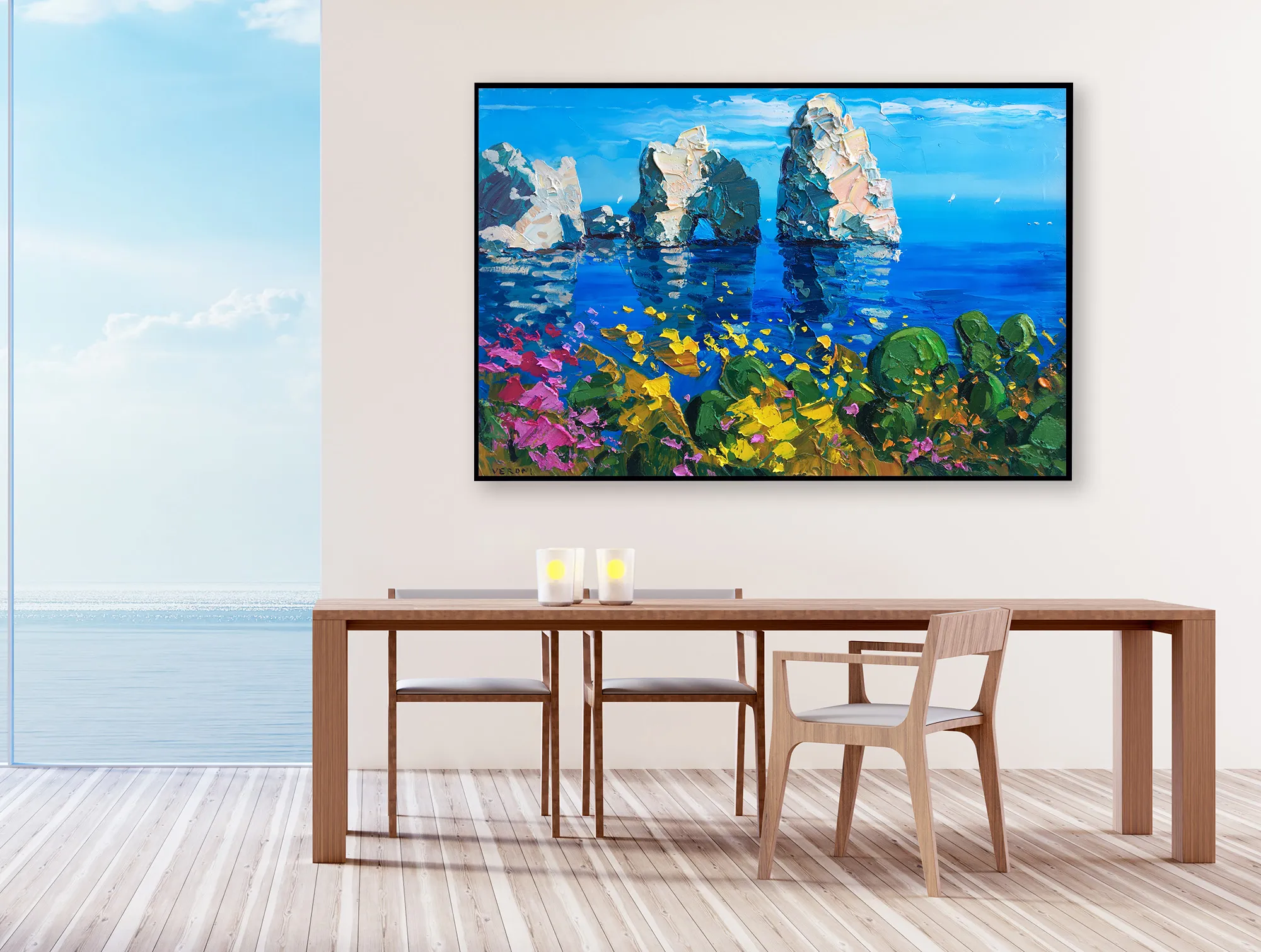 This original Capri painting is created in a Modern Impressionist style. I utilized a palette knife technique to build up thick, sculptural layers of oil paint (heavy impasto). This method allows for a rich interplay of turquoise and emerald tones, creating a tactile experience that reflects the rugged beauty of the rocks and the transparency of the sea.
