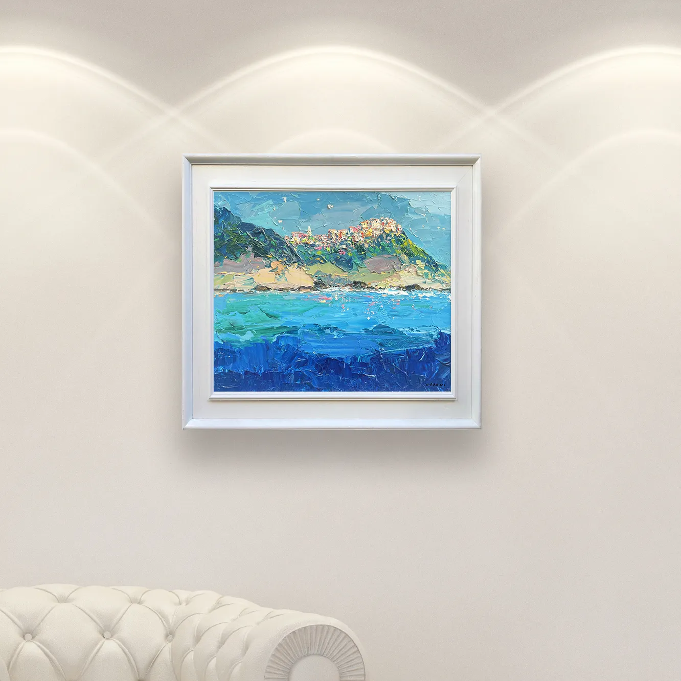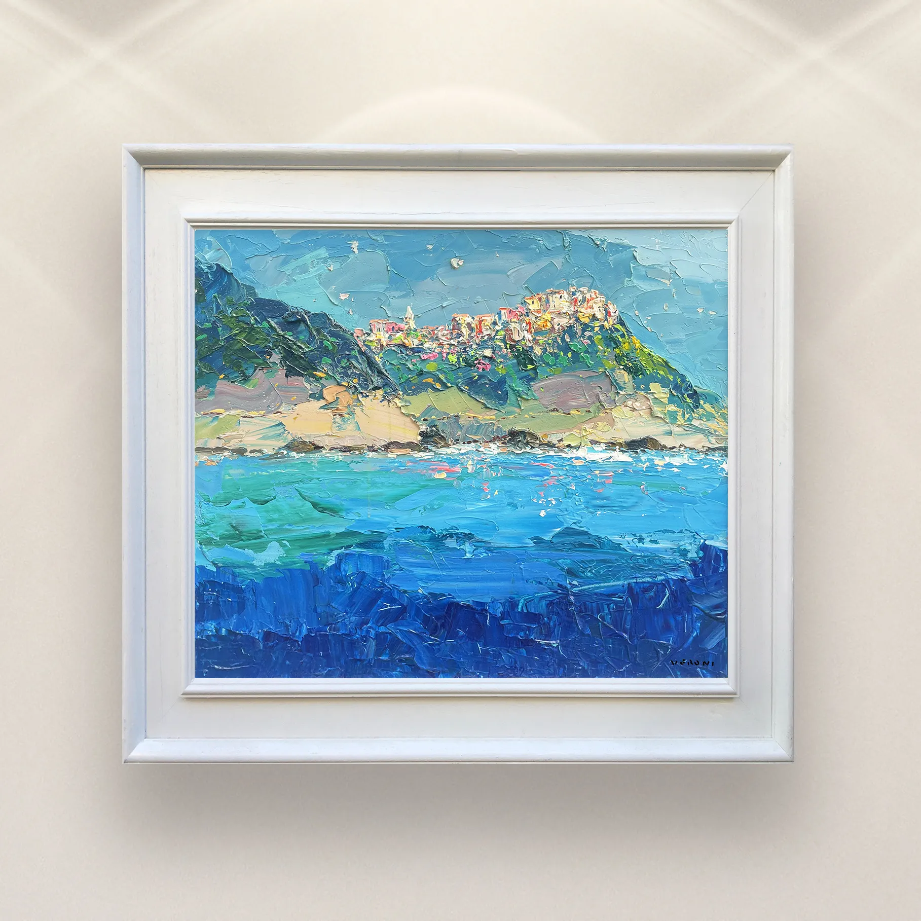 Experience the rugged beauty of the Italian Riviera with this original Corniglia oil painting. This artwork captures the colorful village perched high above the Ligurian Sea, surrounded by lush terraced vineyards. Using a palette knife, I created a heavy impasto texture that brings the turquoise waves and sun-drenched cliffs to life. This authentic Mediterranean seascape is a perfect statement piece for your coastal home decor.
