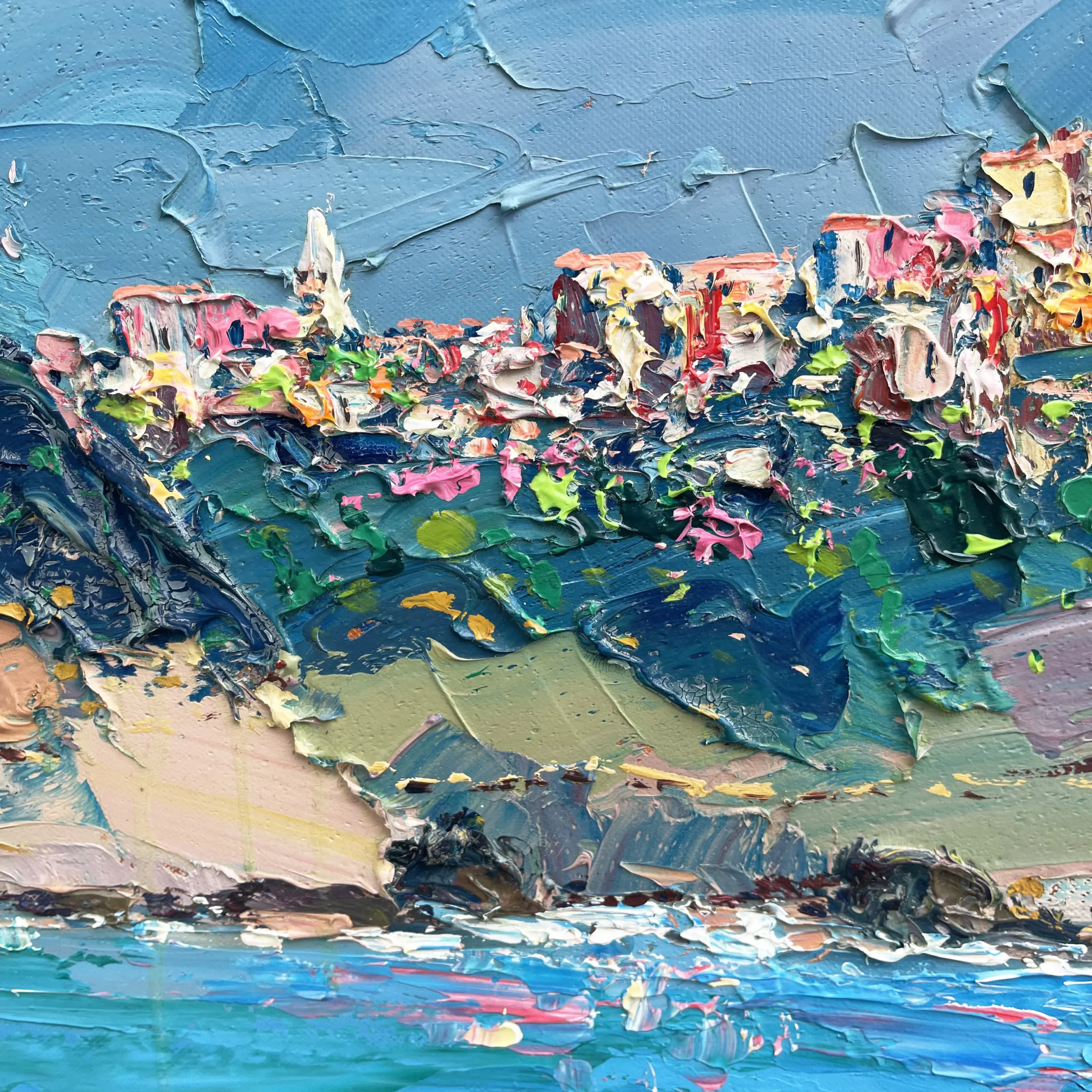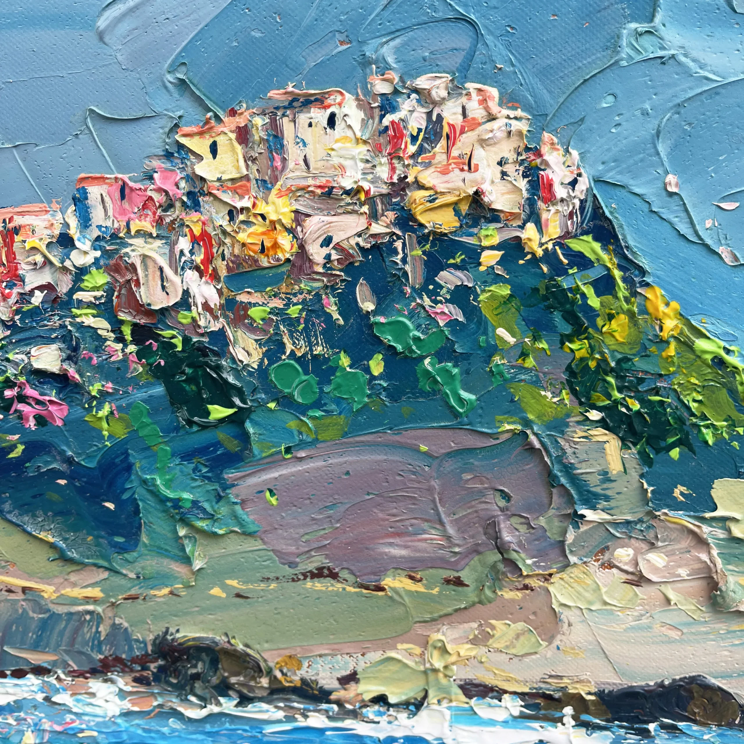 In this original Corniglia painting, I used a Modern Impressionist style to capture the unique vertical perspective of this Cinque Terre village. Through a palette knife technique, I applied thick layers of oil paint (heavy impasto) to “sculpt” the rocky coastline and the vibrant architecture. This creates a dynamic, tactile surface that reflects the intense Mediterranean light and the wild energy of the sea.