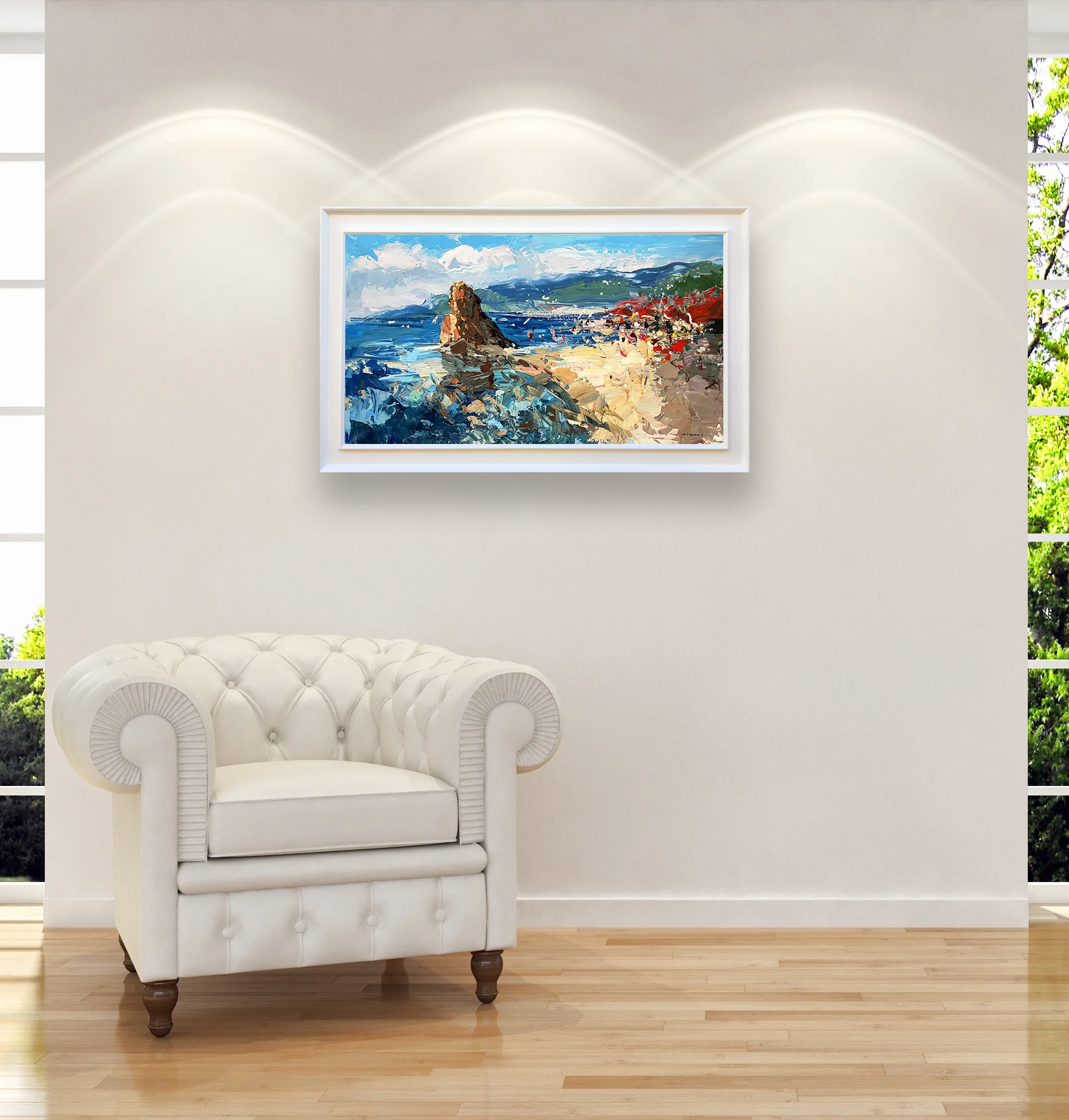 In this original Monterosso oil painting, I captured the vibrant energy of the Cinque Terre shoreline. Using my signature Modern Impressionist style, I applied thick layers of paint with a palette knife to create a heavy impastotexture. This approach brings the colorful beach umbrellas and the crystal-clear turquoise water to life, capturing the radiant Mediterranean light and the lively summer atmosphere.