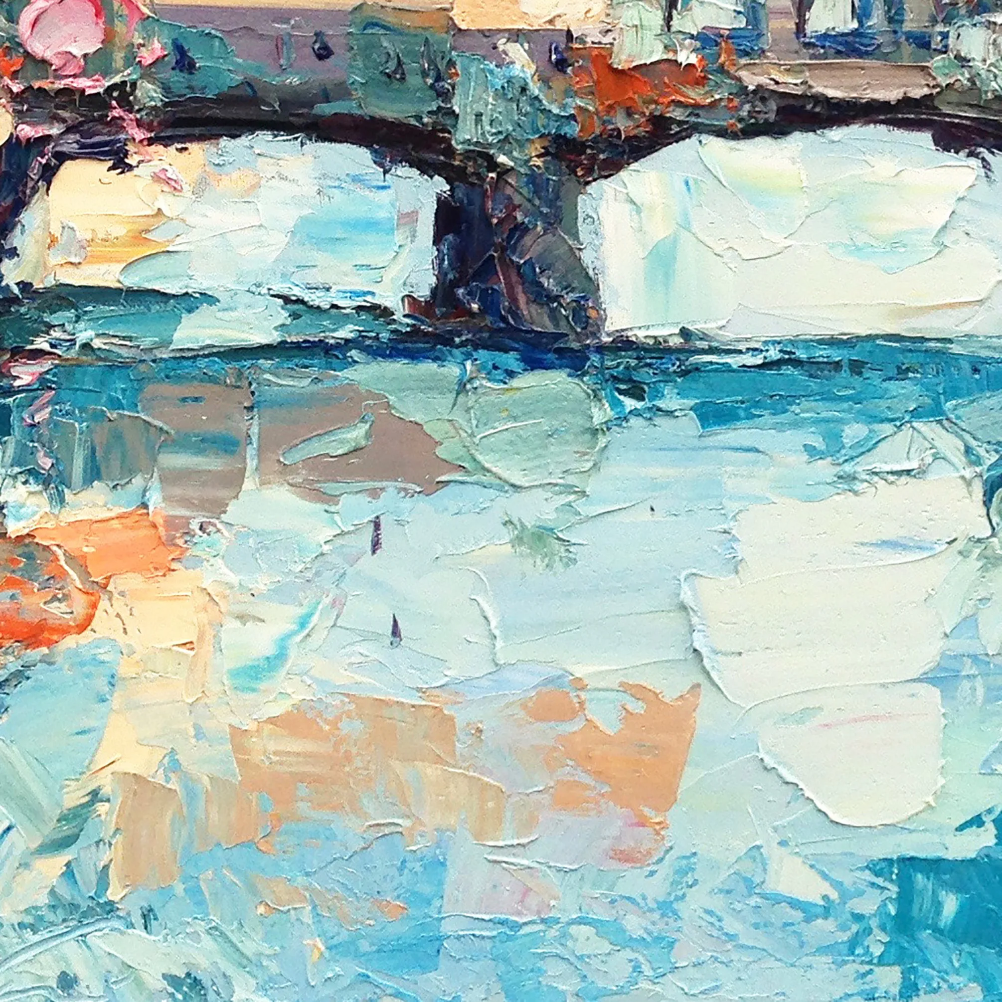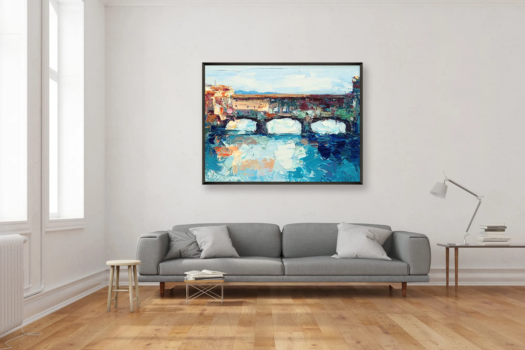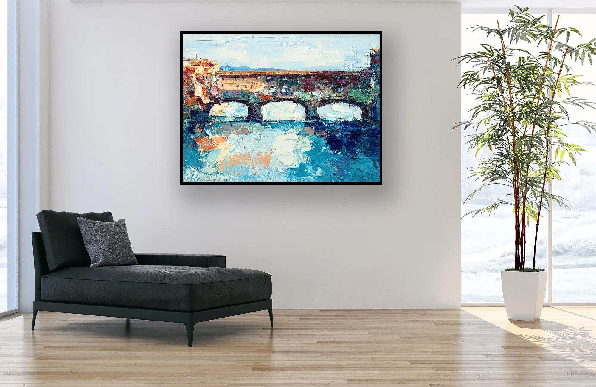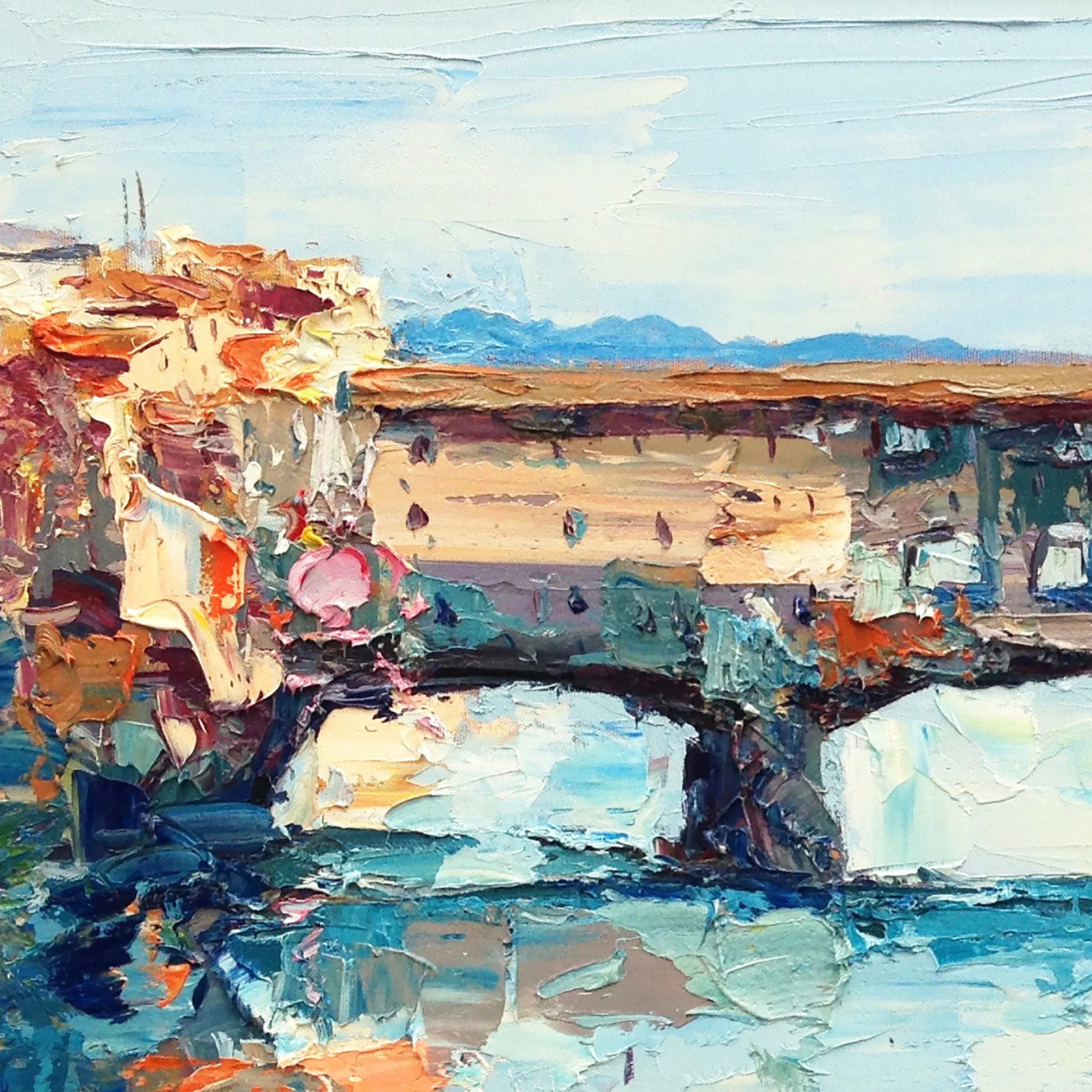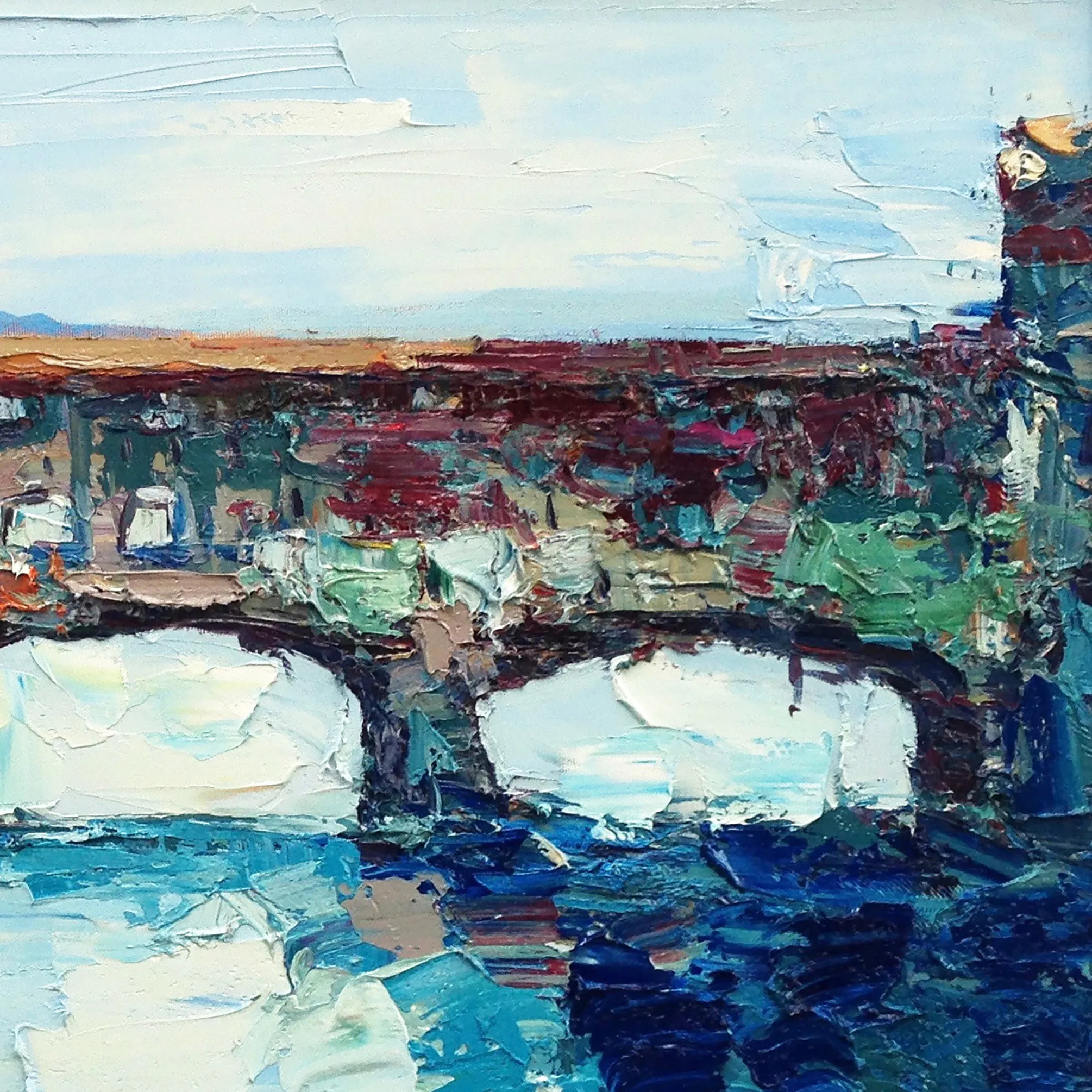In this original Ponte Vecchio painting, I explored the interplay of light and ancient stone using a Modern Impressionist style. Through the palette knife technique, I applied thick layers of oil paint (heavy impasto) to build the structural charm of the bridge. This approach gives the cityscape a rhythmic energy, making the historic Florence atmosphere feel contemporary and alive on the canvas.
