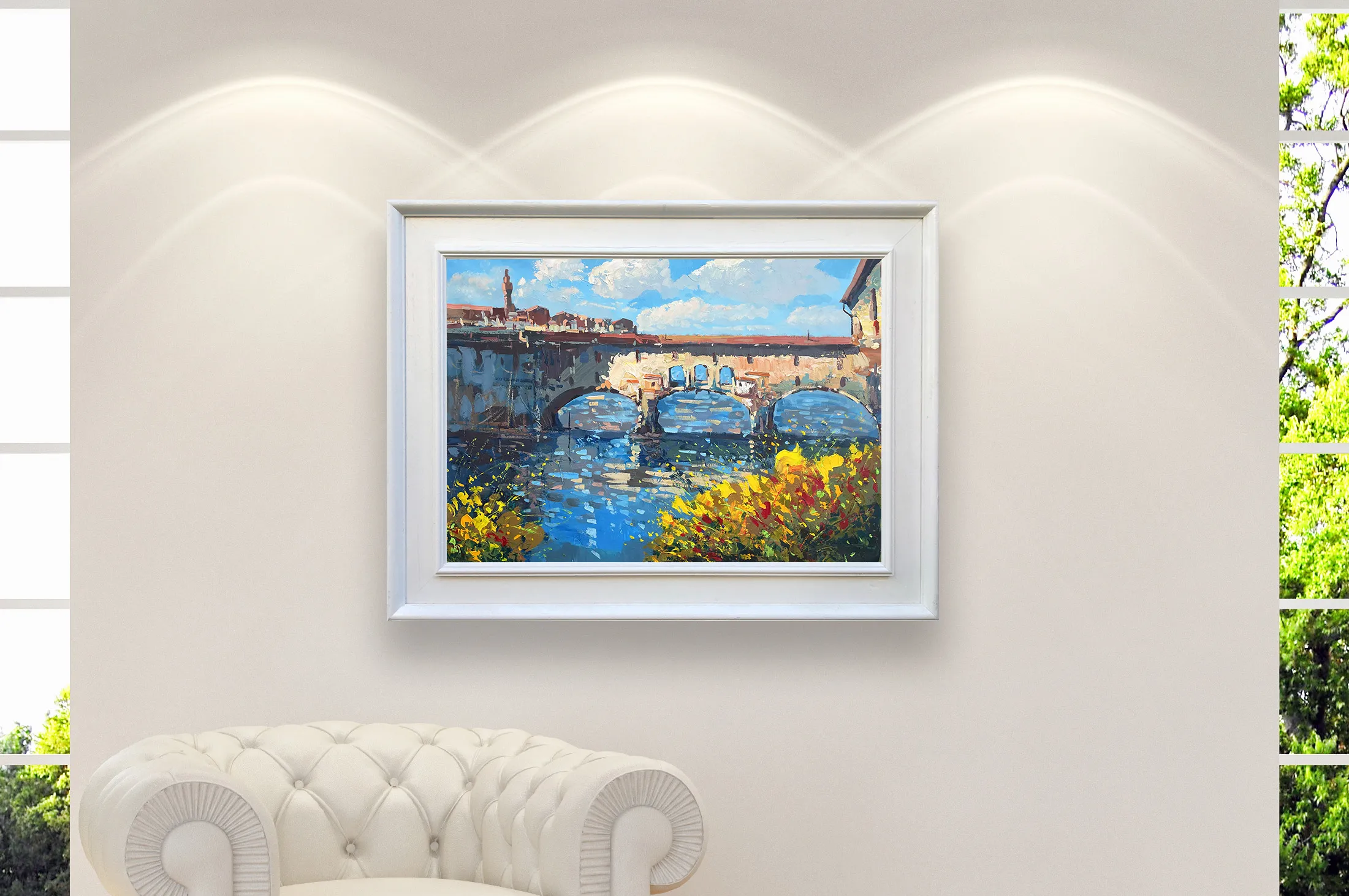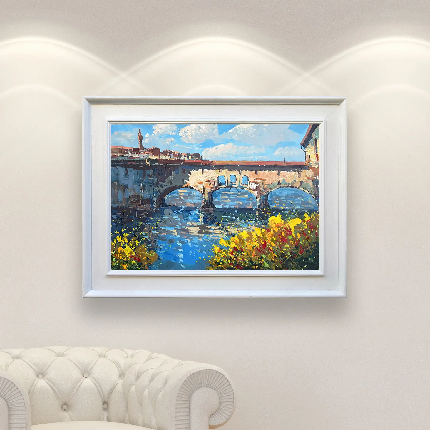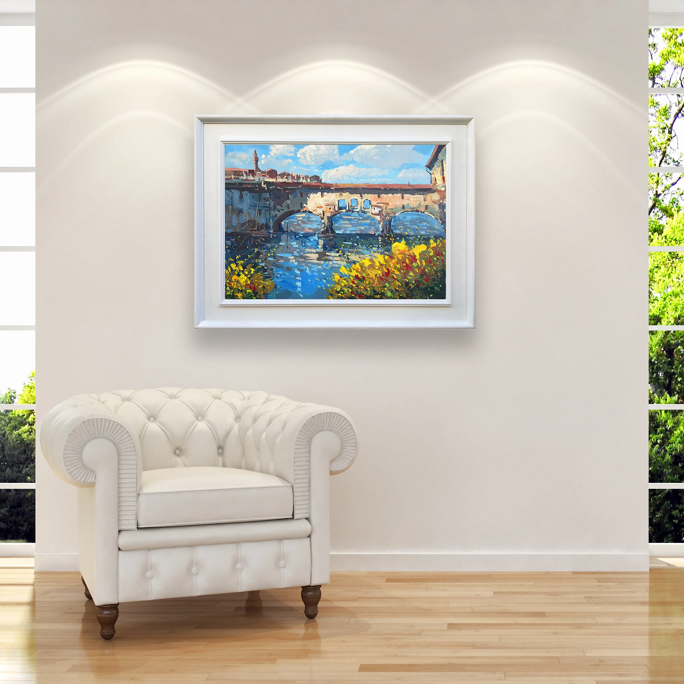 Bring the heart of Tuscany home with this original Ponte Vecchio oil painting. This artwork captures the iconic Florence bridge reflected in the Arno River, framed by vibrant wildflowers. Using a palette knife, the heavy impasto technique creates a rich, sculptural texture that brings the historic architecture to life. This horizontal canvas is ready to ship for your luxury Italian art collection.
