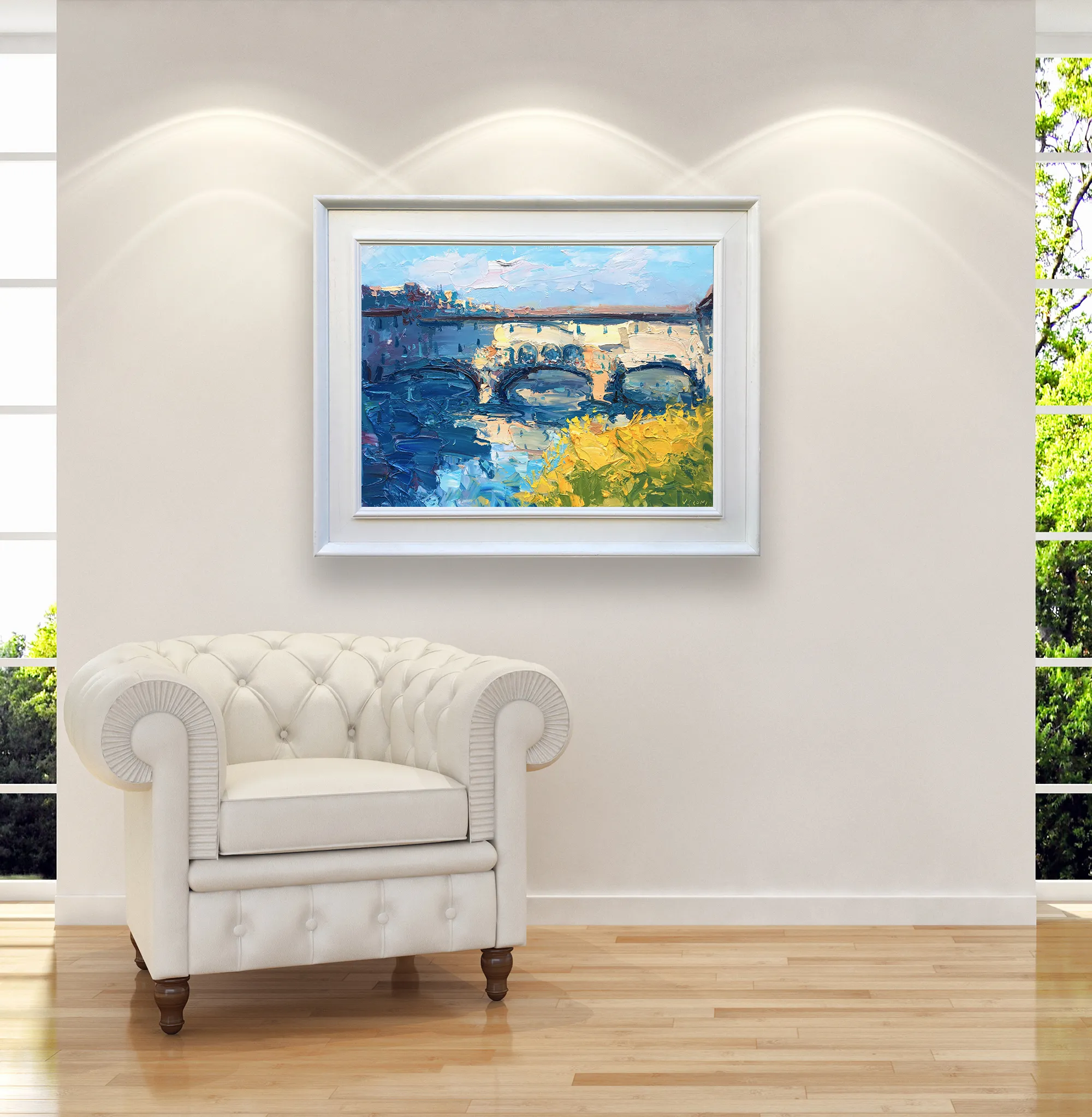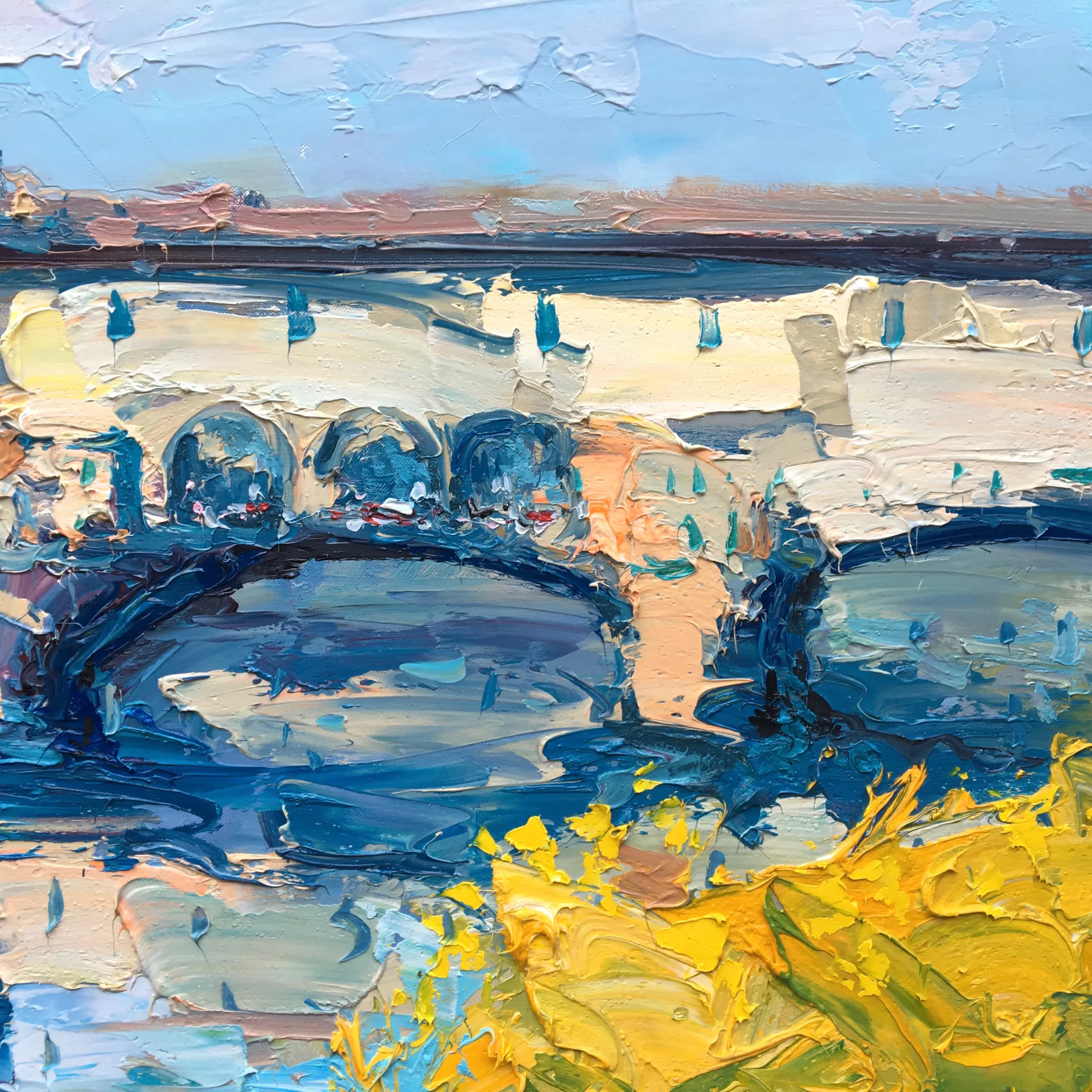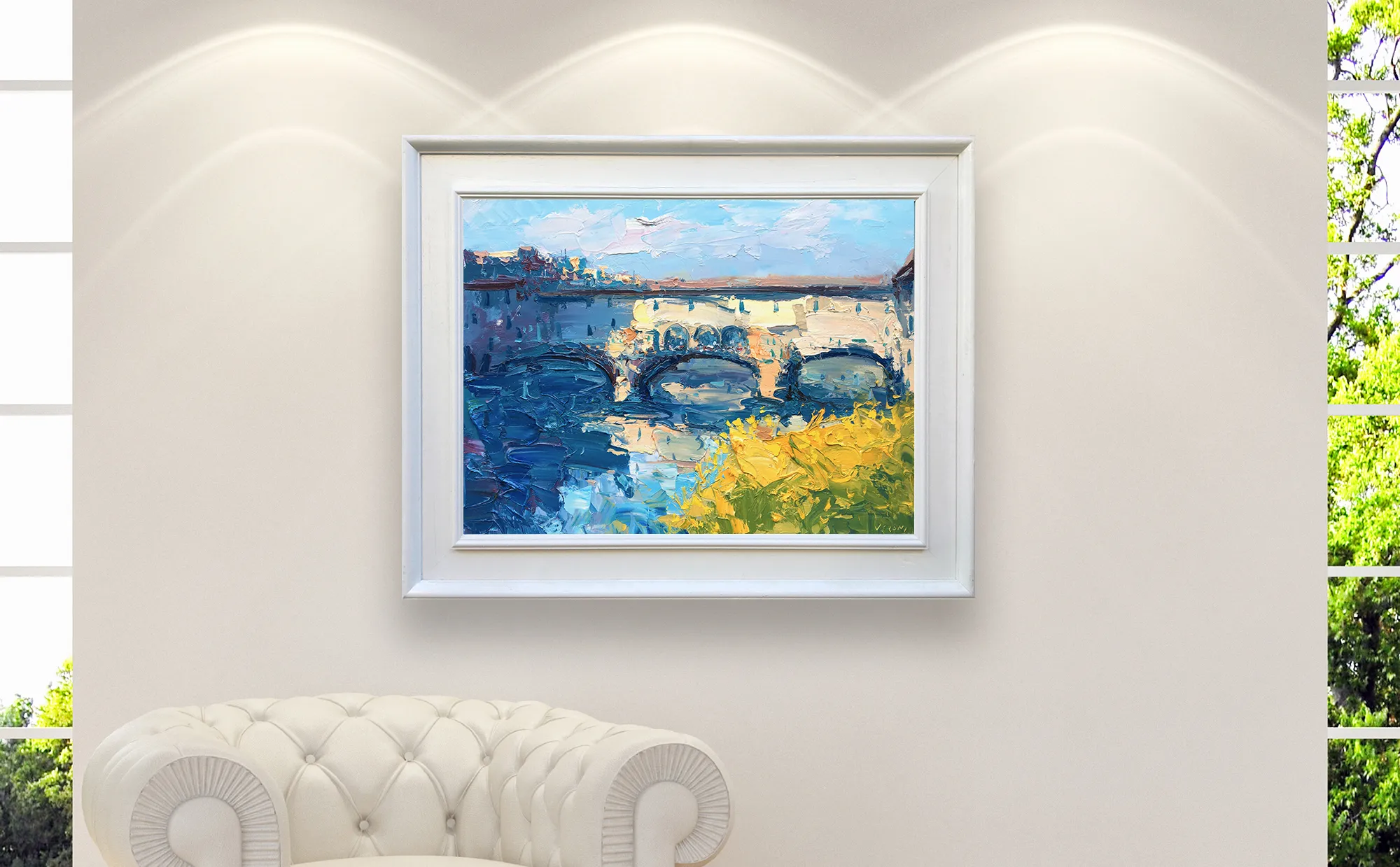 In this original Florence cityscape, I focused on the vibrant contrast between the architecture and the water. Using a palette knife technique, I applied thick layers of oil paint (heavy impasto) to create a rhythmic, textured surface. This modern impressionist style allows the light to play across the canvas, highlighting the bold yellow and deep blue tones that define this iconic view of the Ponte Vecchio.