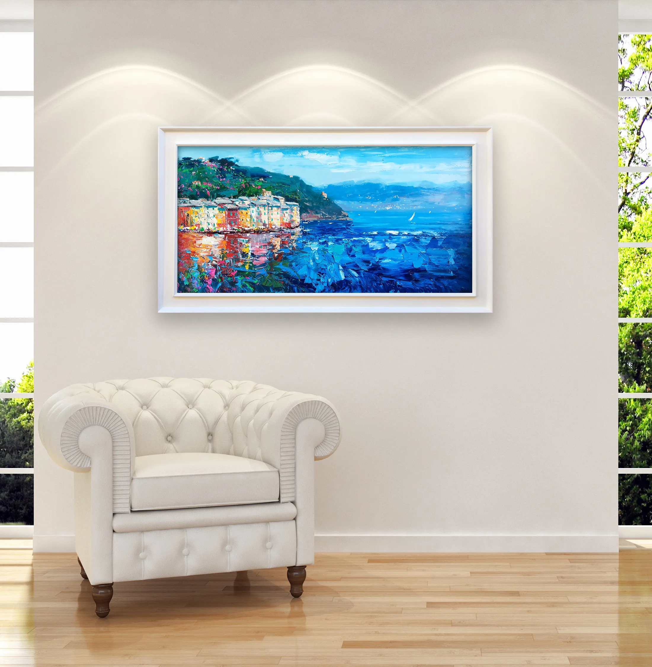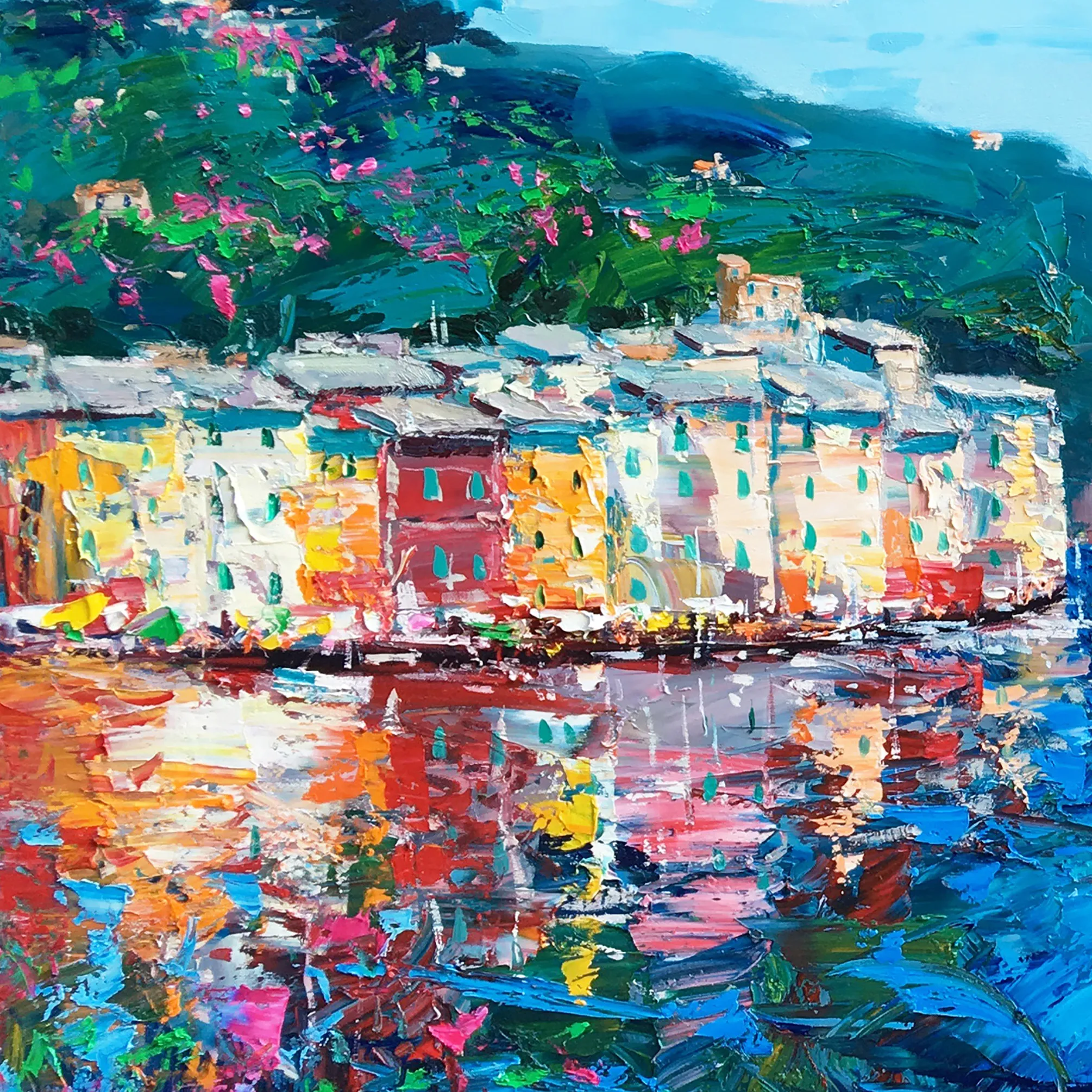In this original Portofino oil painting, I wanted to celebrate the Mediterranean light. Using a palette knife technique, I applied thick, sculpted layers of oil paint (heavy impasto) to recreate the movement of the waves and the vivid reflections of the village. This modern impressionist style captures the romantic atmosphere of the Liguria.