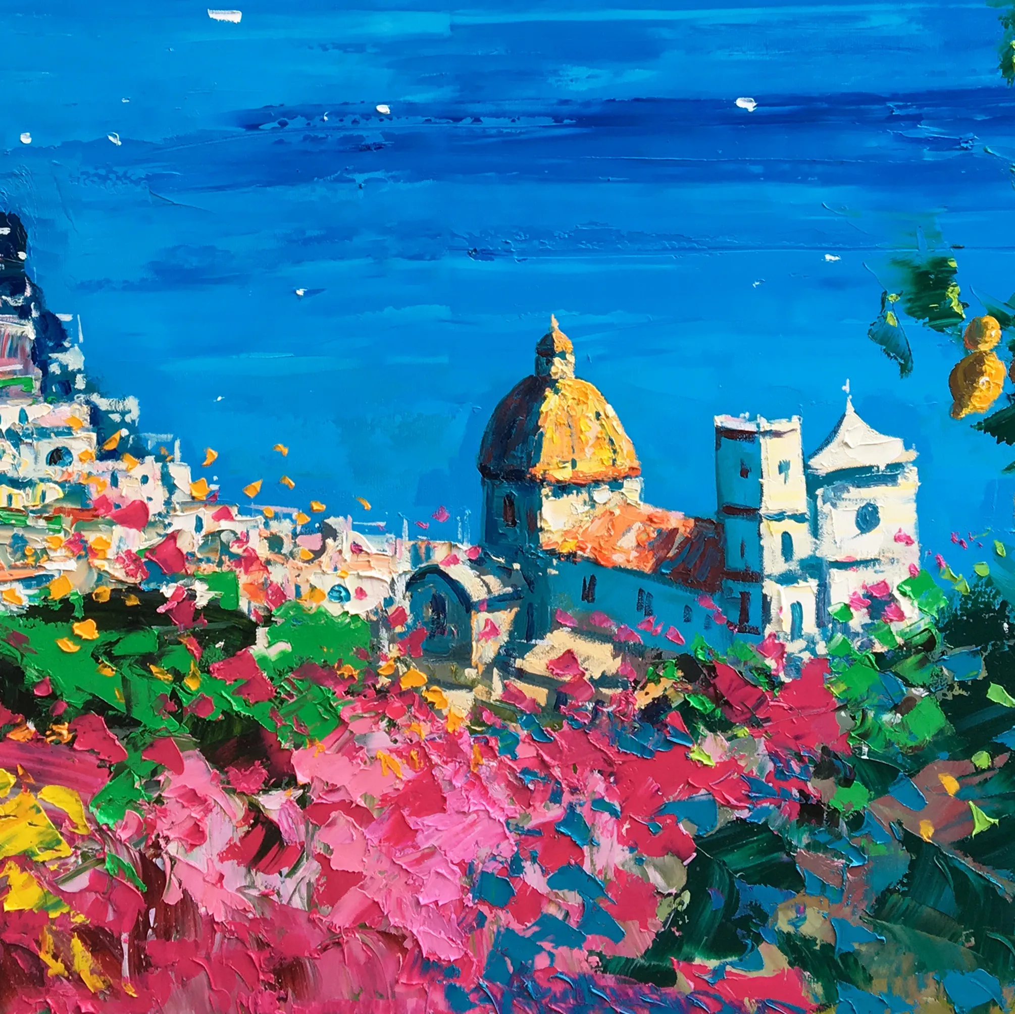 Celebrate the Italian summer with this original Positano oil painting. I used a dynamic palette knife technique to paint a terrace with yellow lemons and bright pink flowers. The scene overlooks the turquoise sea and the iconic golden church dome. Bold heavy impasto textures capture the vibrant coastal light and the lush Mediterranean vegetation with expressive, textured strokes.