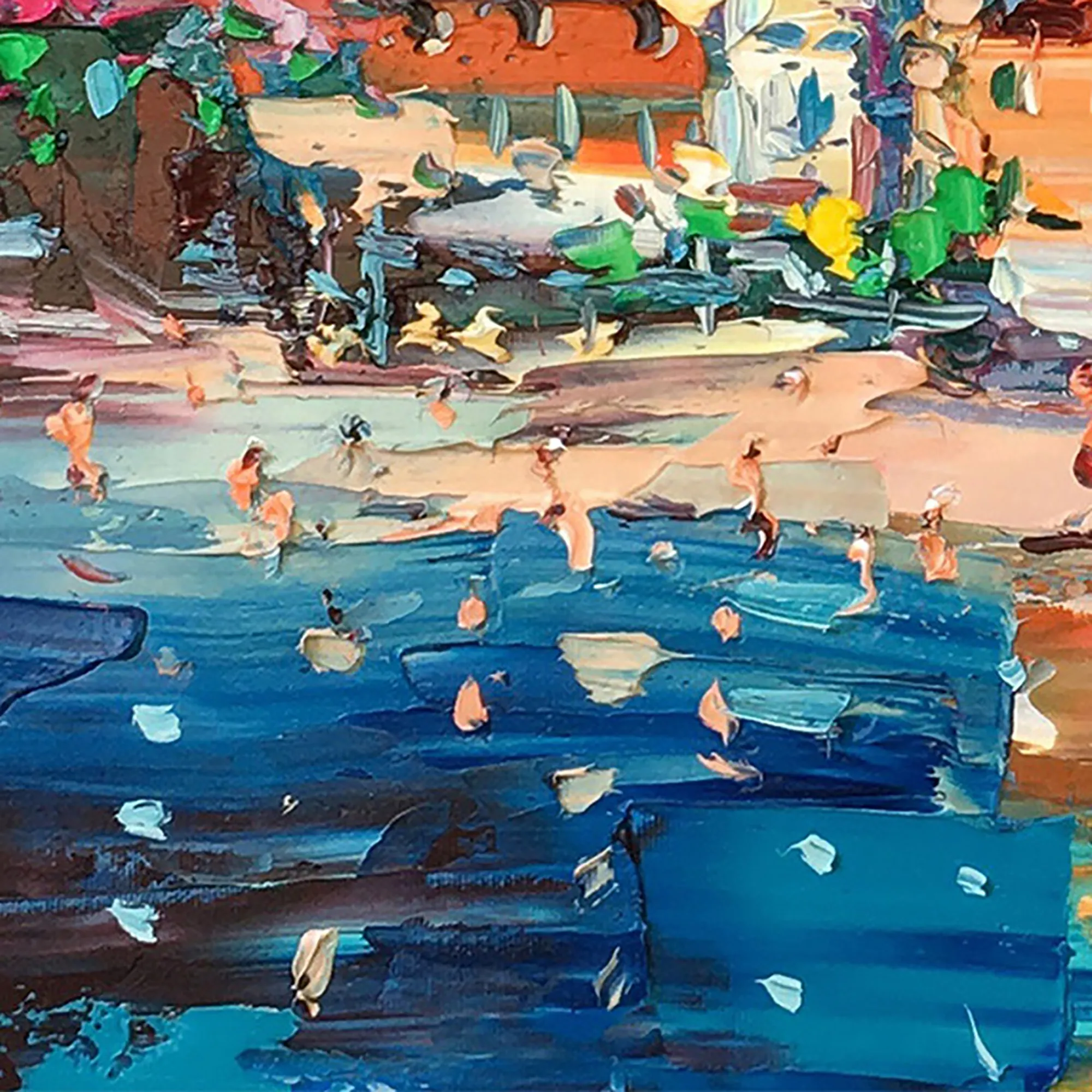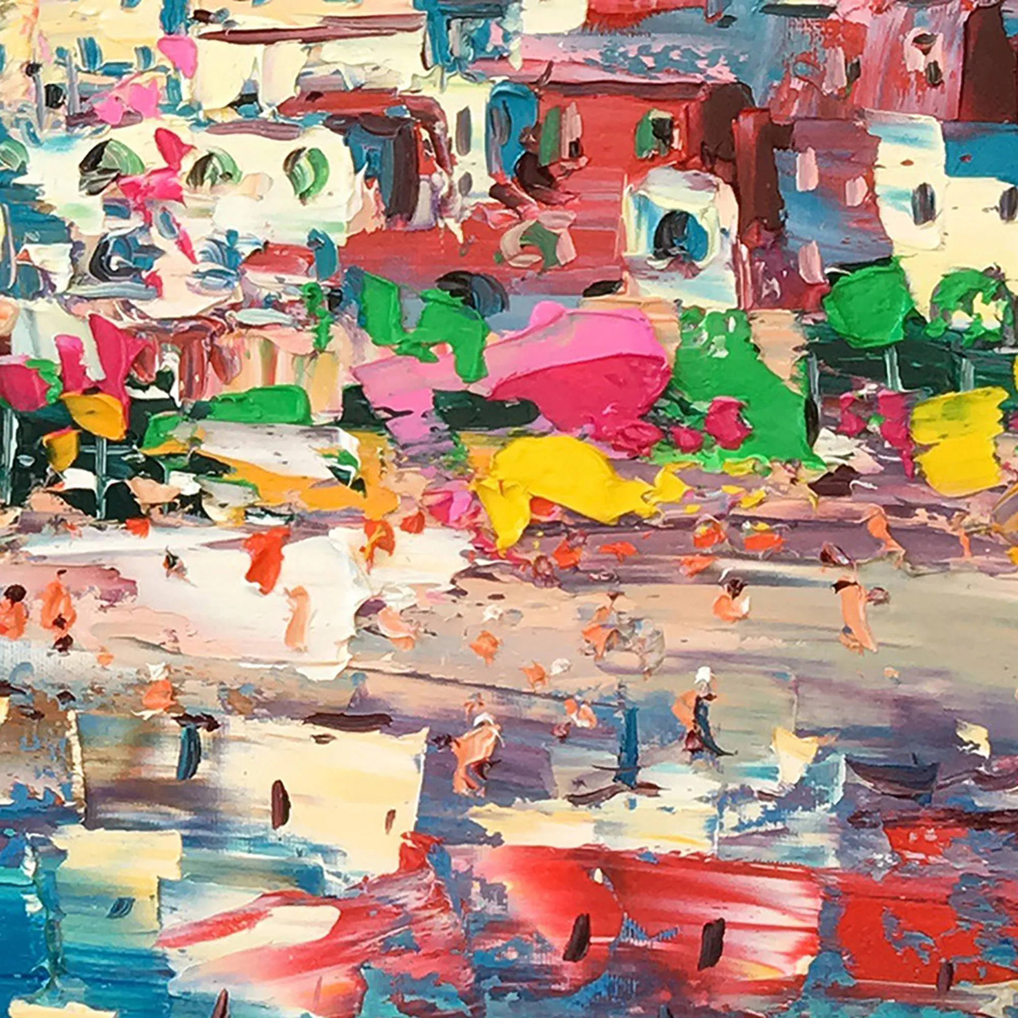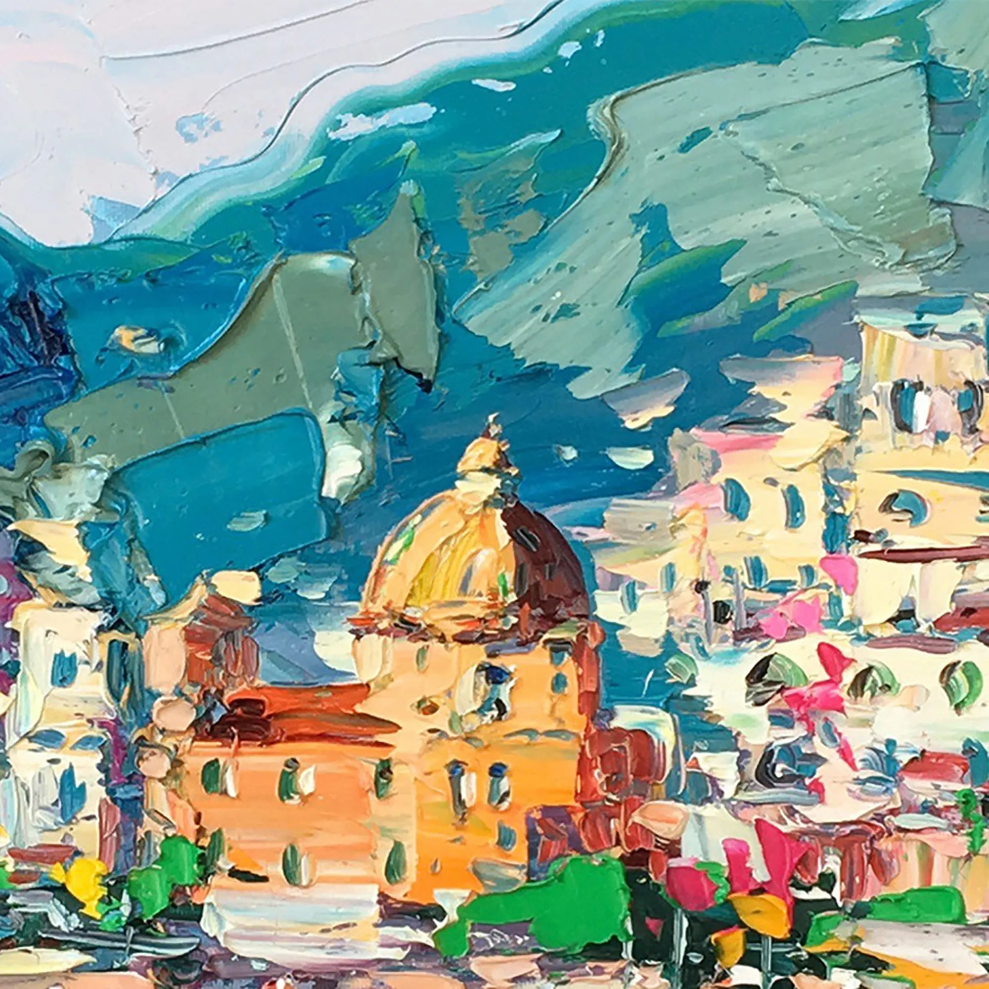 Bring the vibrant energy of the Amalfi Coast into your home with this original Positano oil painting. This panoramic scene highlights the colorful houses and the iconic church dome using a bold palette knife technique. The turquoise sea and sun-drenched beach are rendered with heavy impasto strokes, creating a rich, tactile surface that captures the lively atmosphere of an Italian summer.