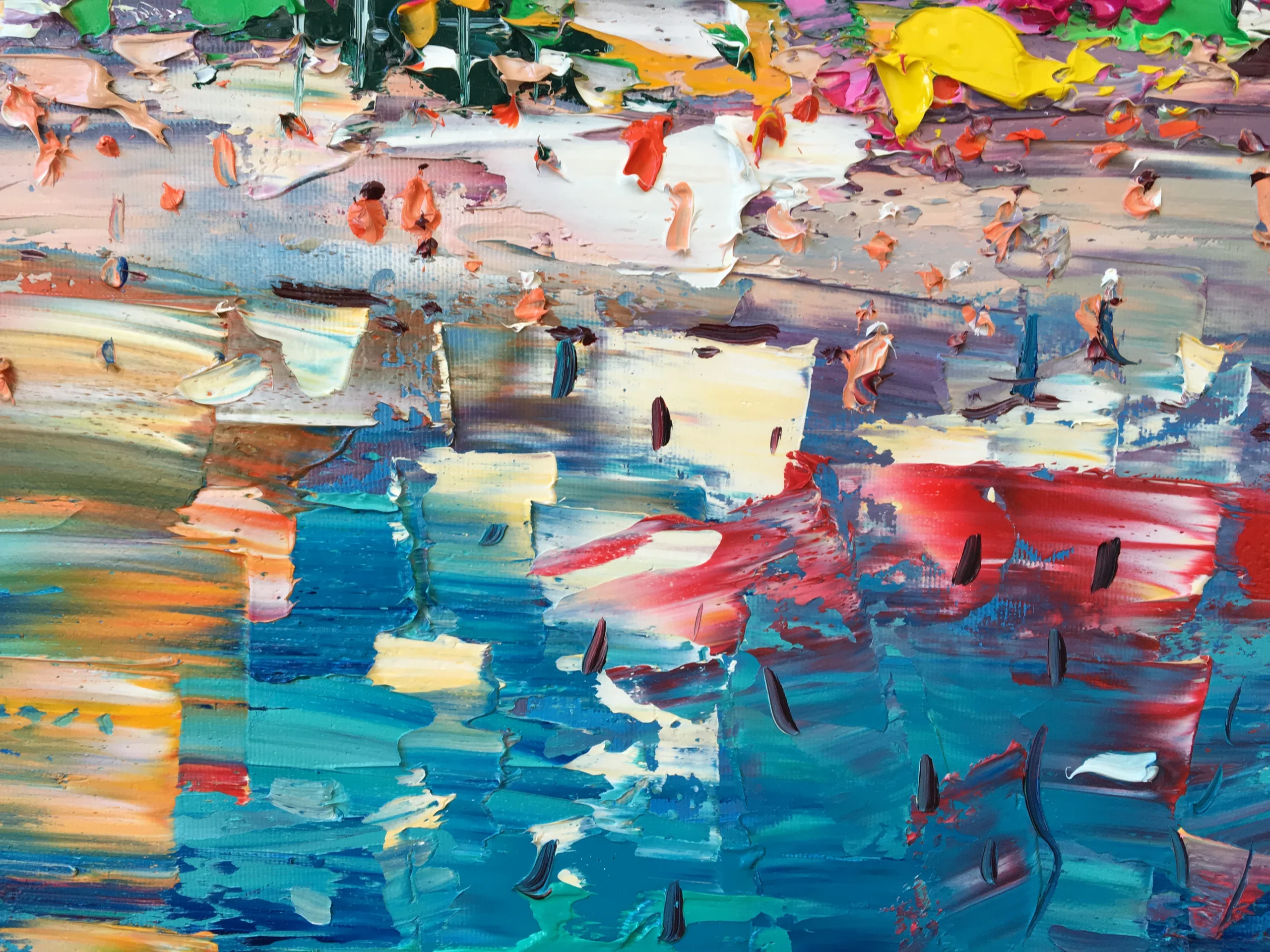 Feel the Italian summer energy with this original Positano oil painting. I used a professional palette knife technique to capture a white sailboat near the sun-drenched beach. The scene features the iconic golden church dome and colorful hillside houses. Bold heavy impasto textures bring the vibrant Mediterranean sea and lively coastal atmosphere to life on canvas.