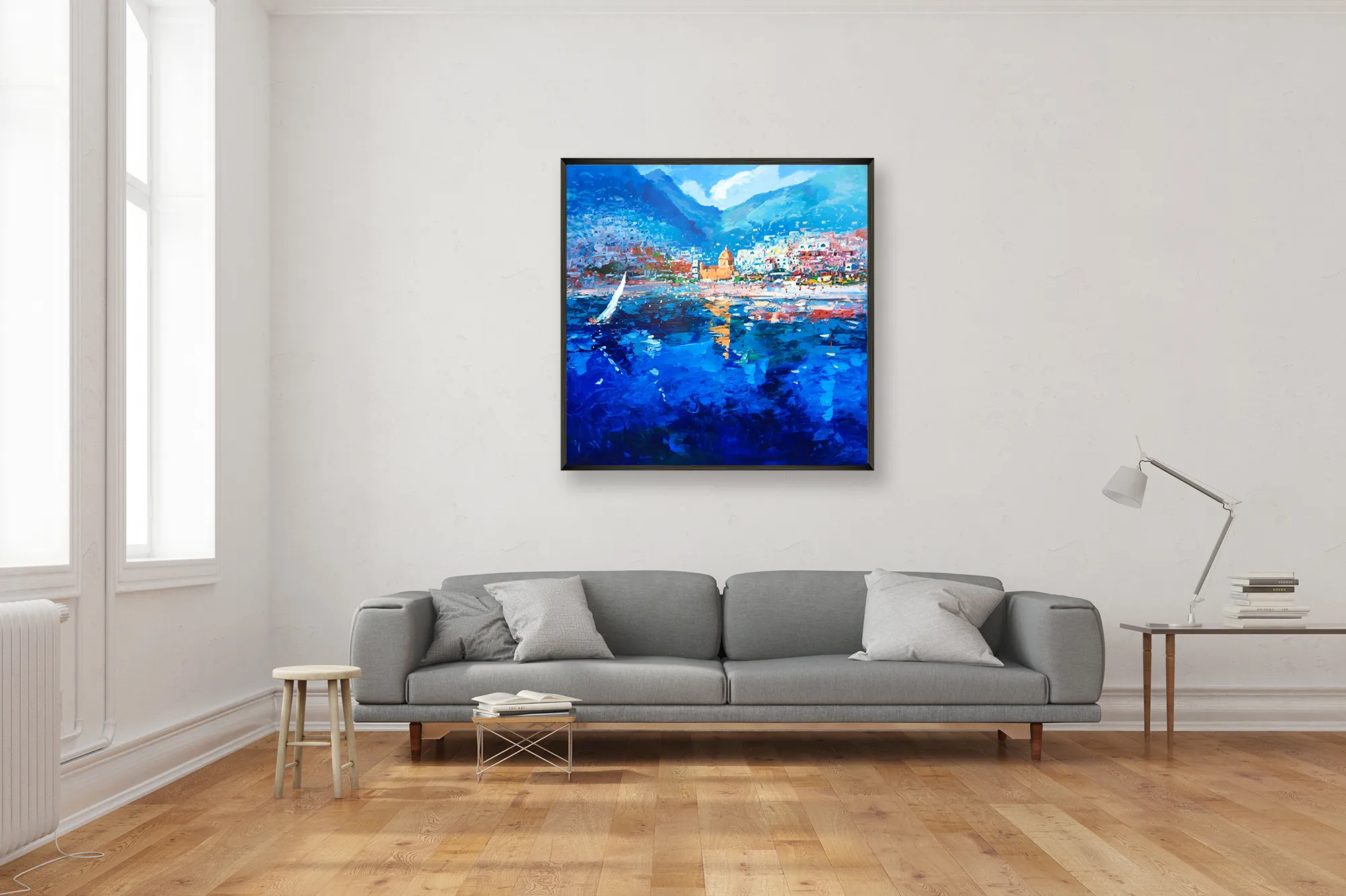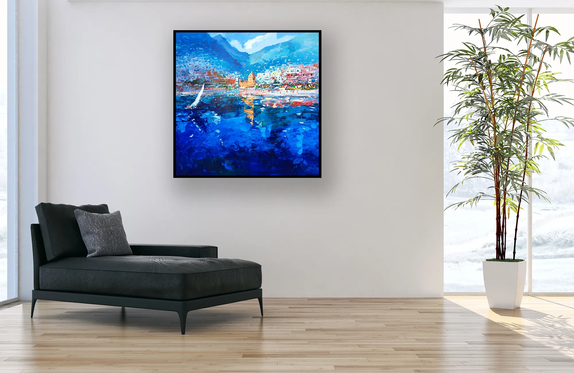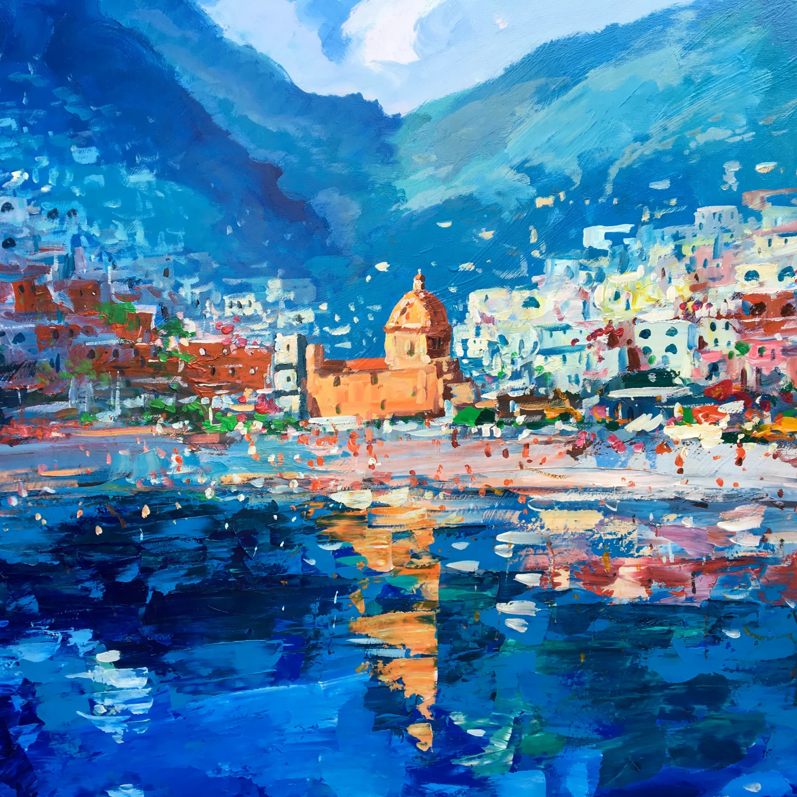 Experience the Mediterranean breeze with this original Positano oil painting. I used a vigorous palette knife techniqueto create the deep blue sea and a white sailboat. The hillside town glows under the sunlight. Rich heavy impasto textures capture the water’s movement and the iconic church reflections. This vibrant canvas brings a fresh, coastal energy to your home.