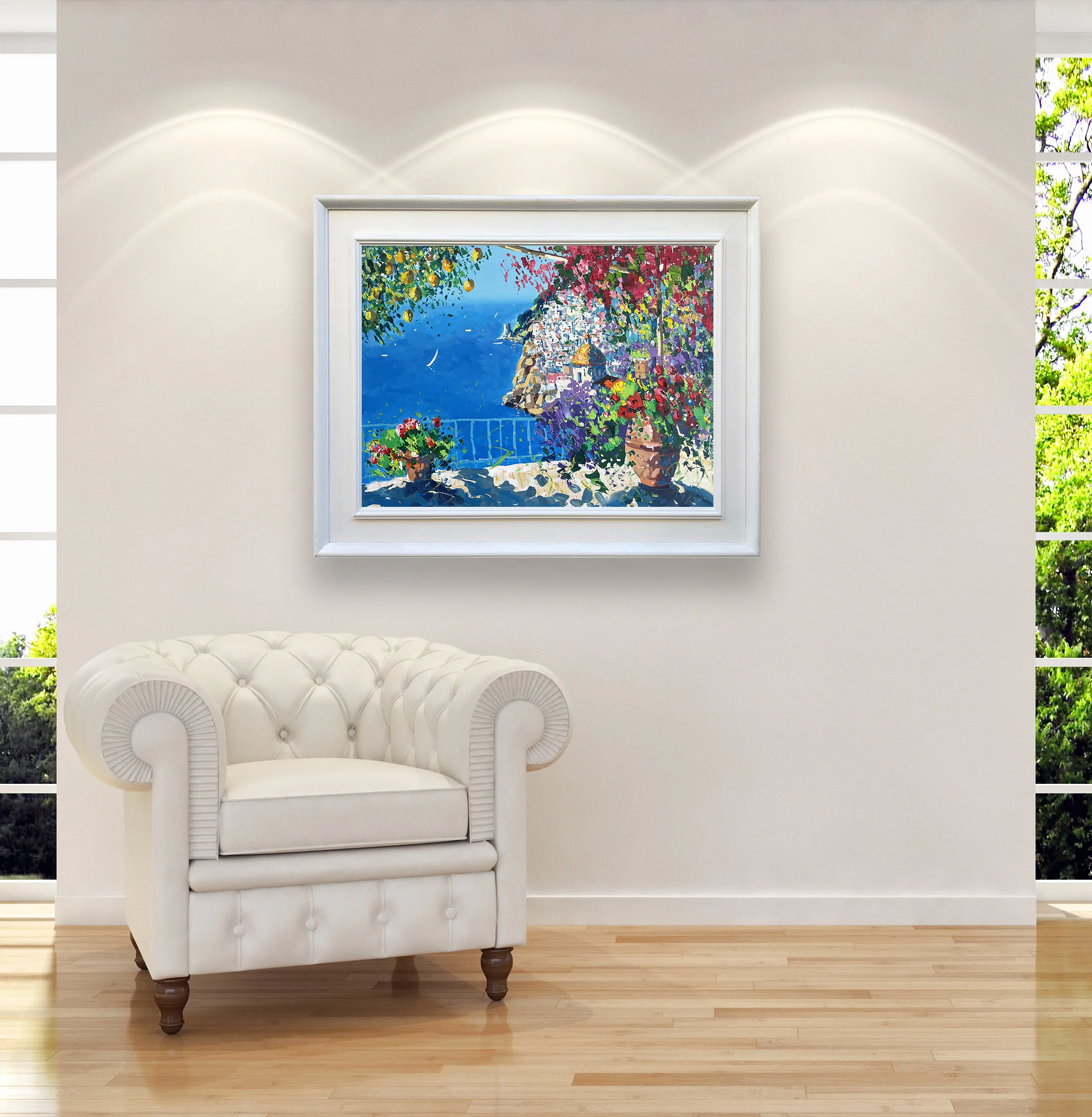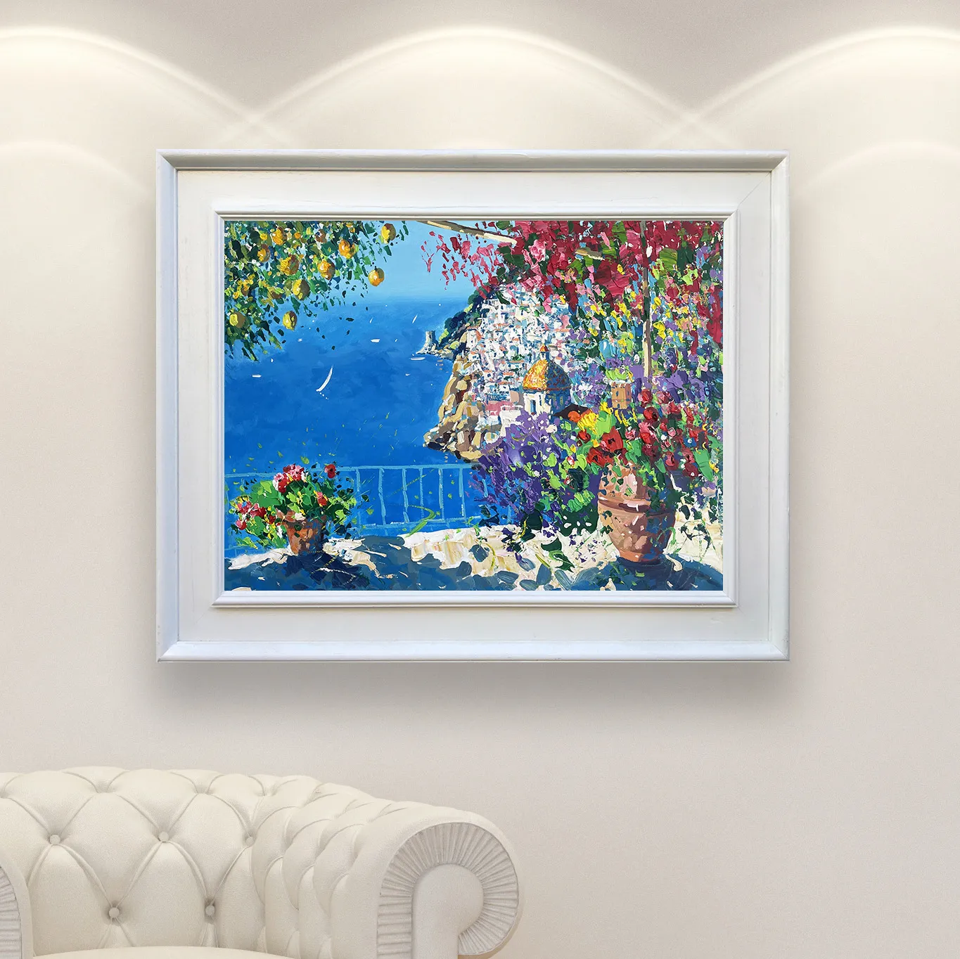 Experience the vibrant soul of the Amalfi Coast with this original Positano oil painting. I used a palette knife techniqueto build rich, tactile layers of color, focusing on the bright yellow lemons and cascading bougainvillea that frame the iconic coastal view. The deep blue sea and white sailboats are rendered with heavy impasto strokes, capturing the intense Mediterranean light and the atmosphere of a sun-drenched Italian terrace.