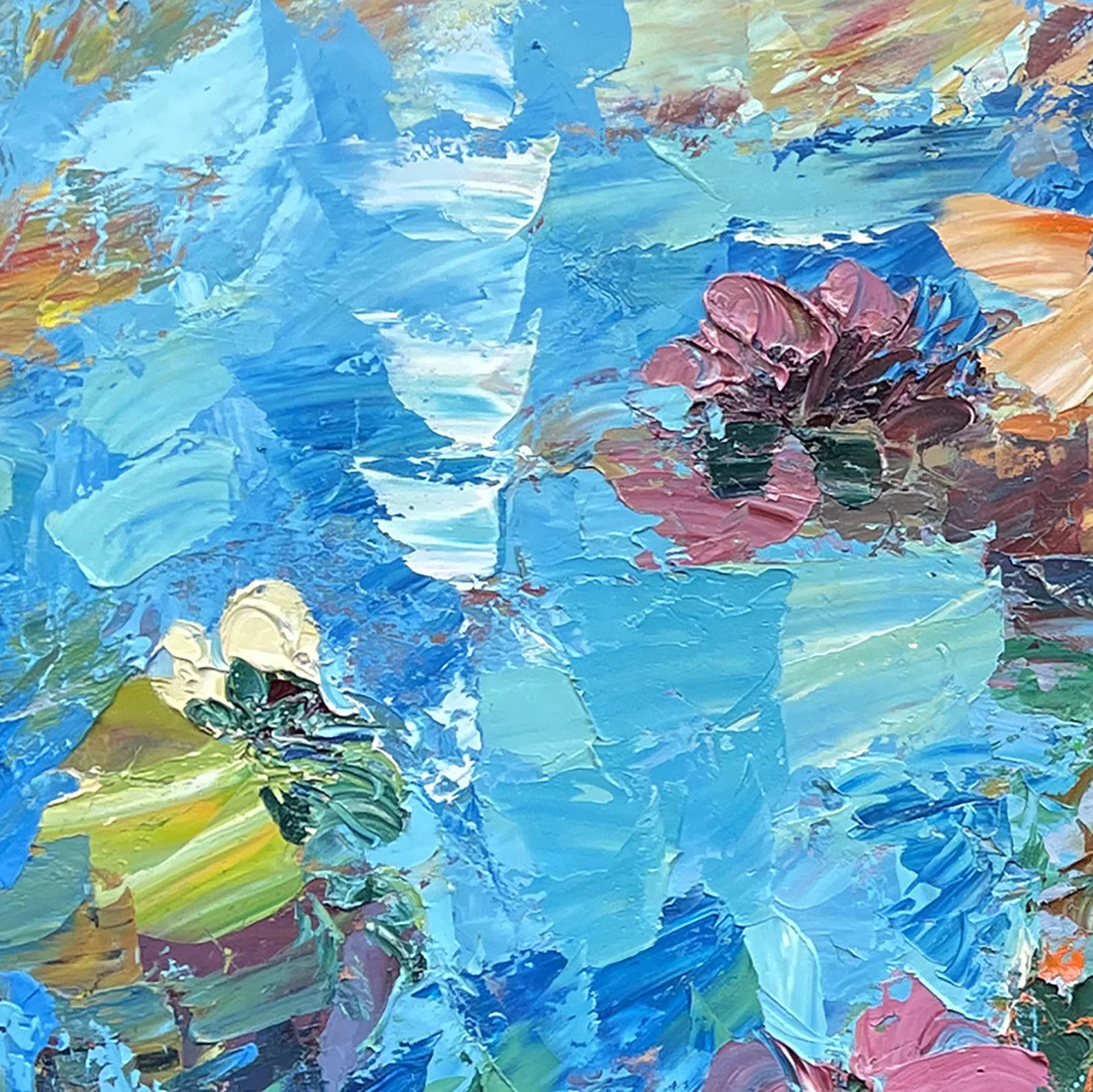This original water lilies painting is created in a Modern Impressionist style. I utilized a palette knife technique to build up thick, sculptural layers of oil paint (heavy impasto). This method allows for a rich interplay of colors—from deep blues to bright floral accents—creating a tactile experience that reflects the ever-changing light on a garden pond.