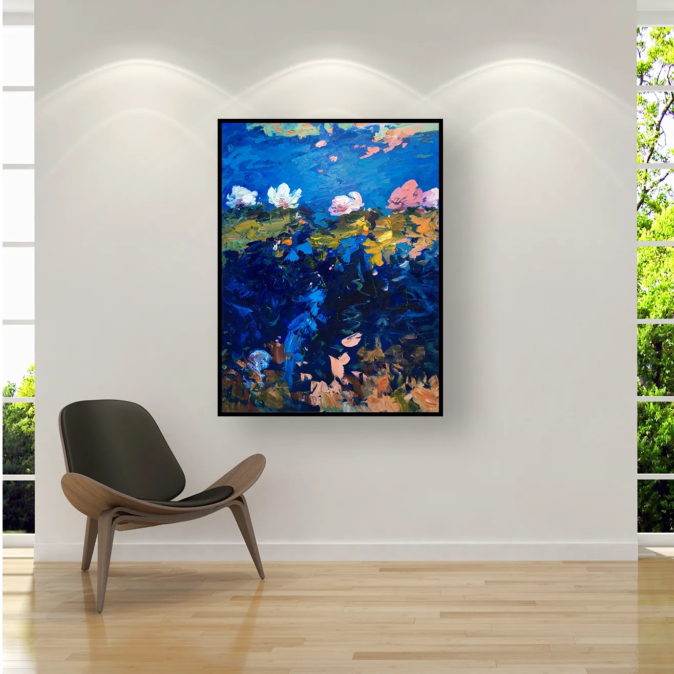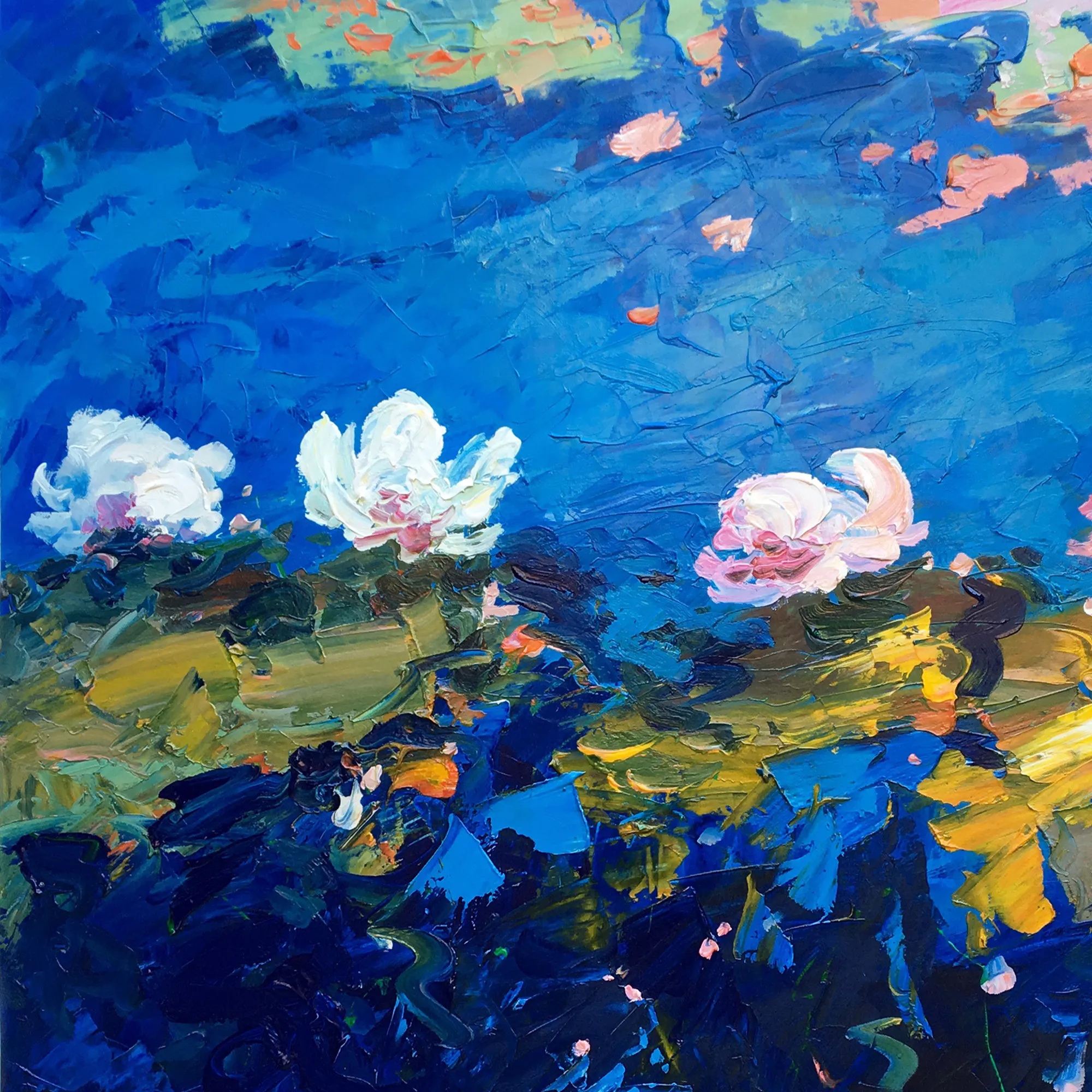 This painting is a modern interpretation of the classic Water Lilies theme. In my Textured Modern Impressionismstyle, I used deep blues and vibrant pinks to represent the depth of the water, while the thick layers of oil paint on the lilies create a striking contrast. The palette knife allowed me to “sculpt” the light on the surface of the pond, giving the entire scene an energetic and tactile feel..