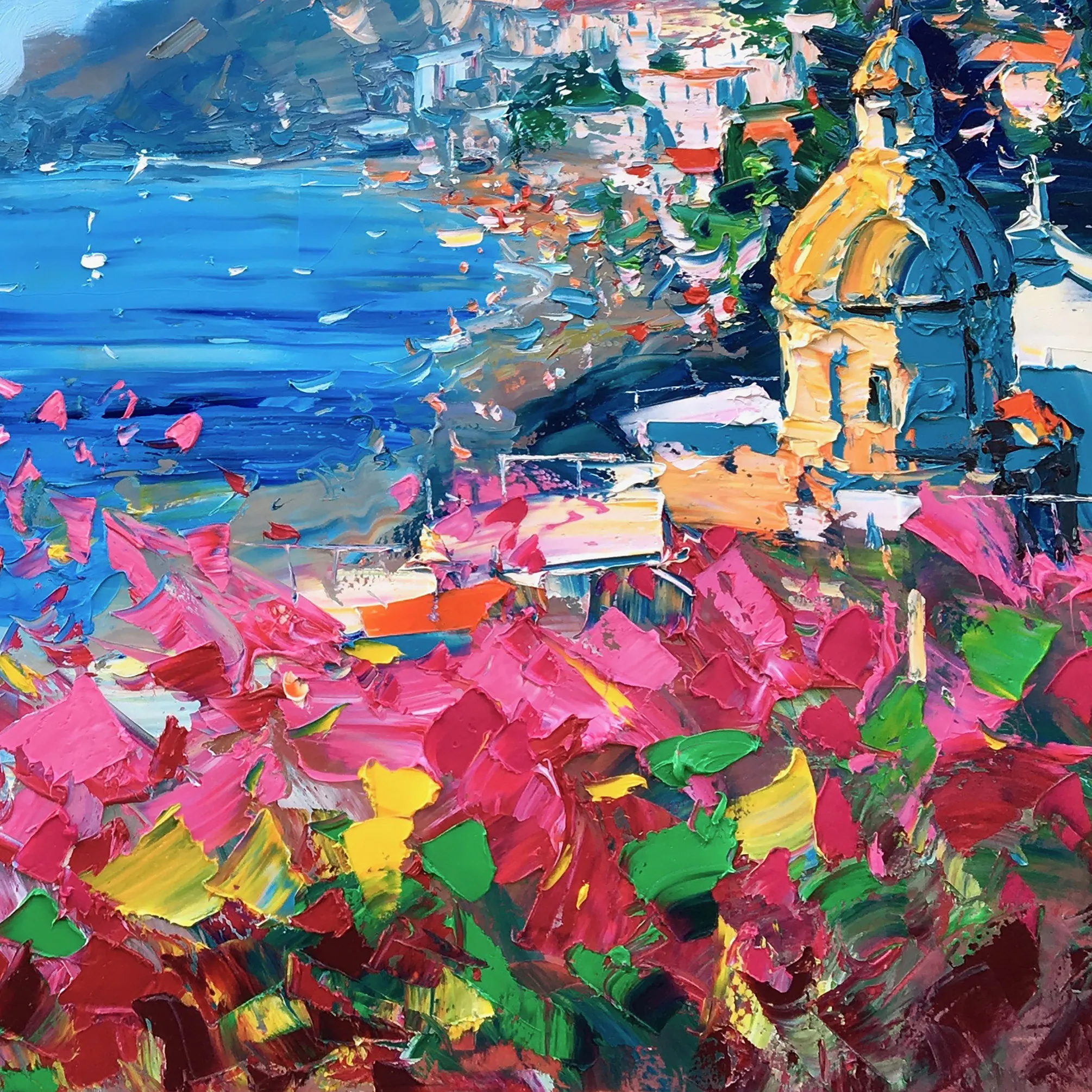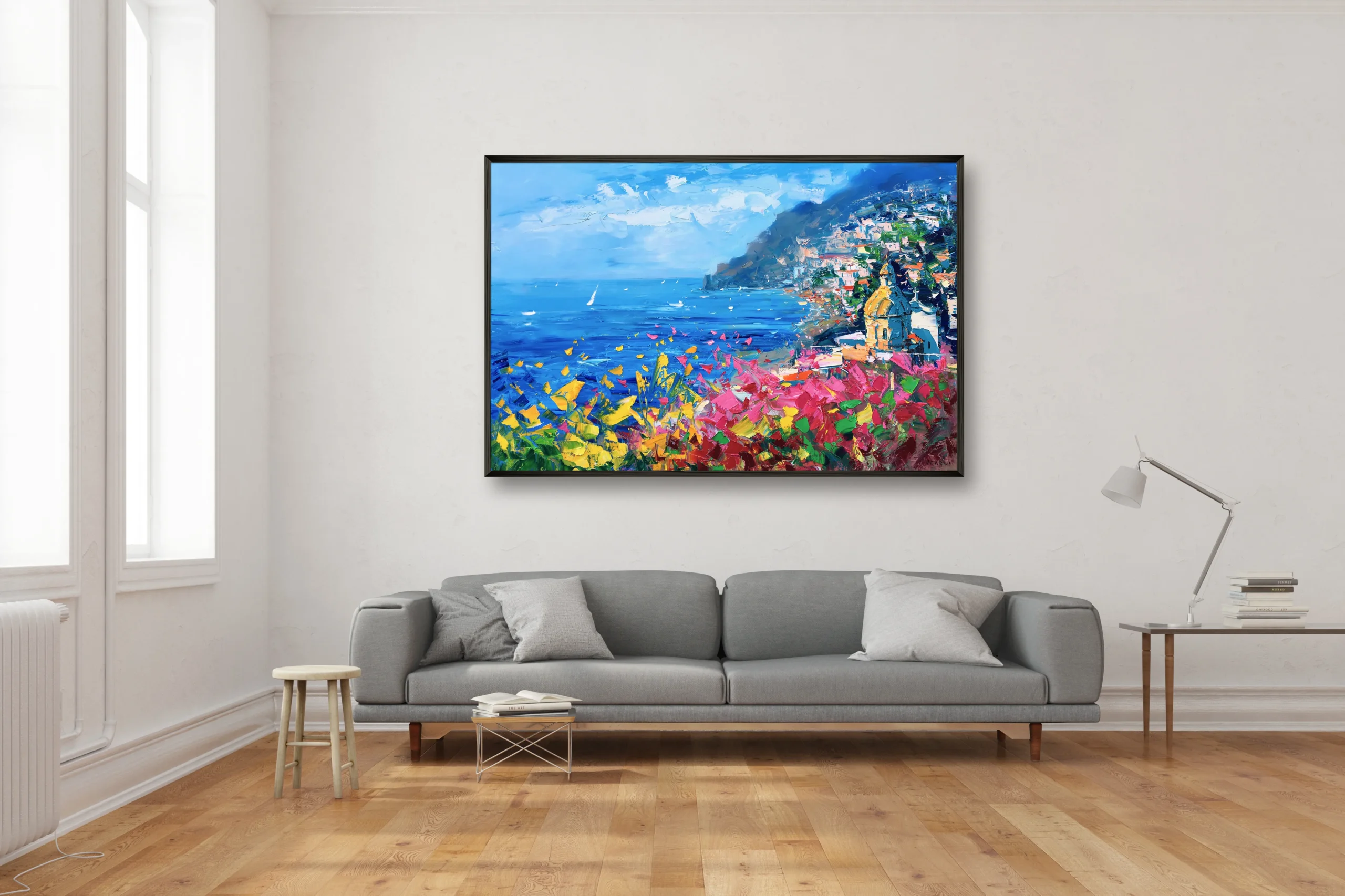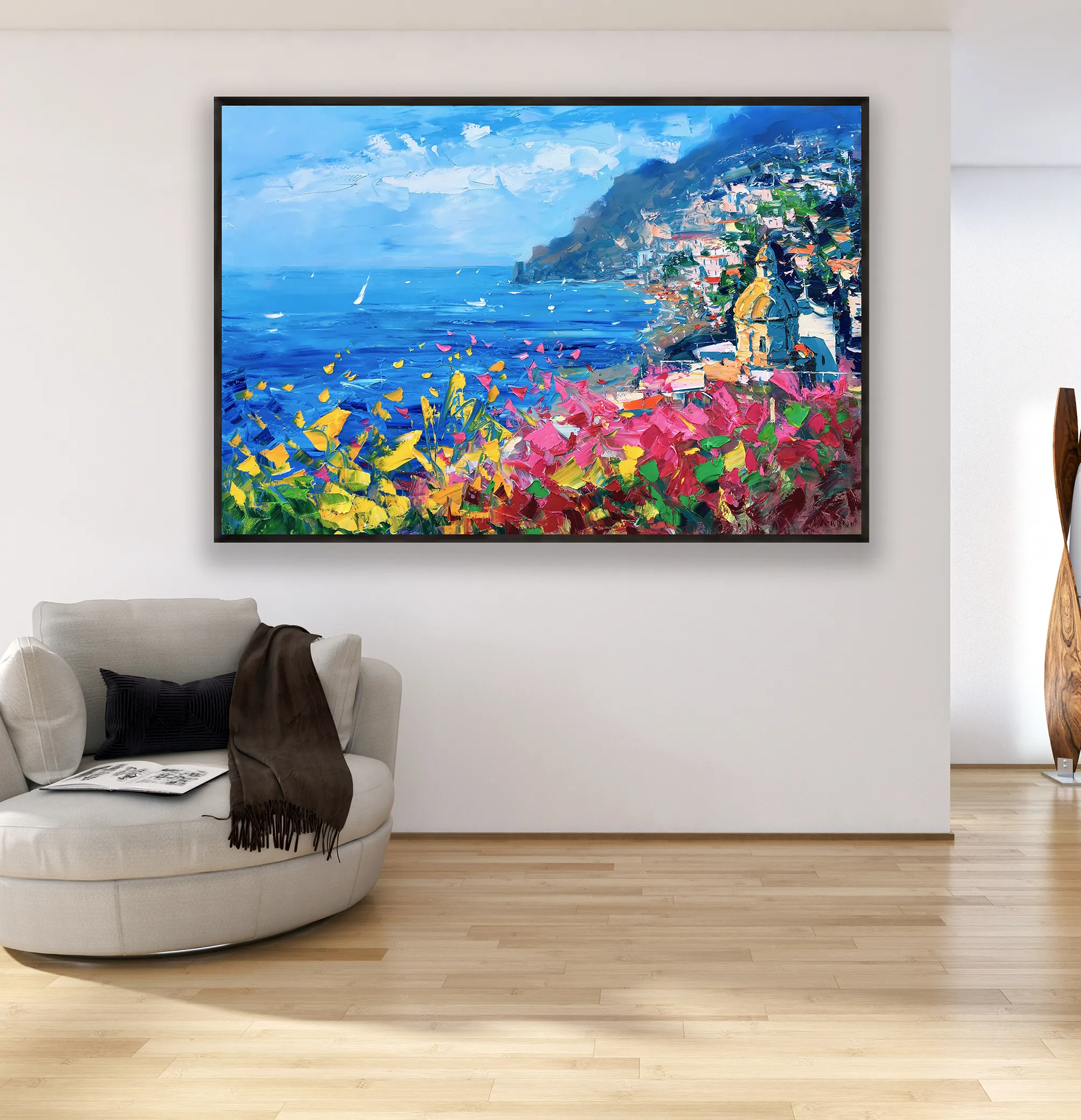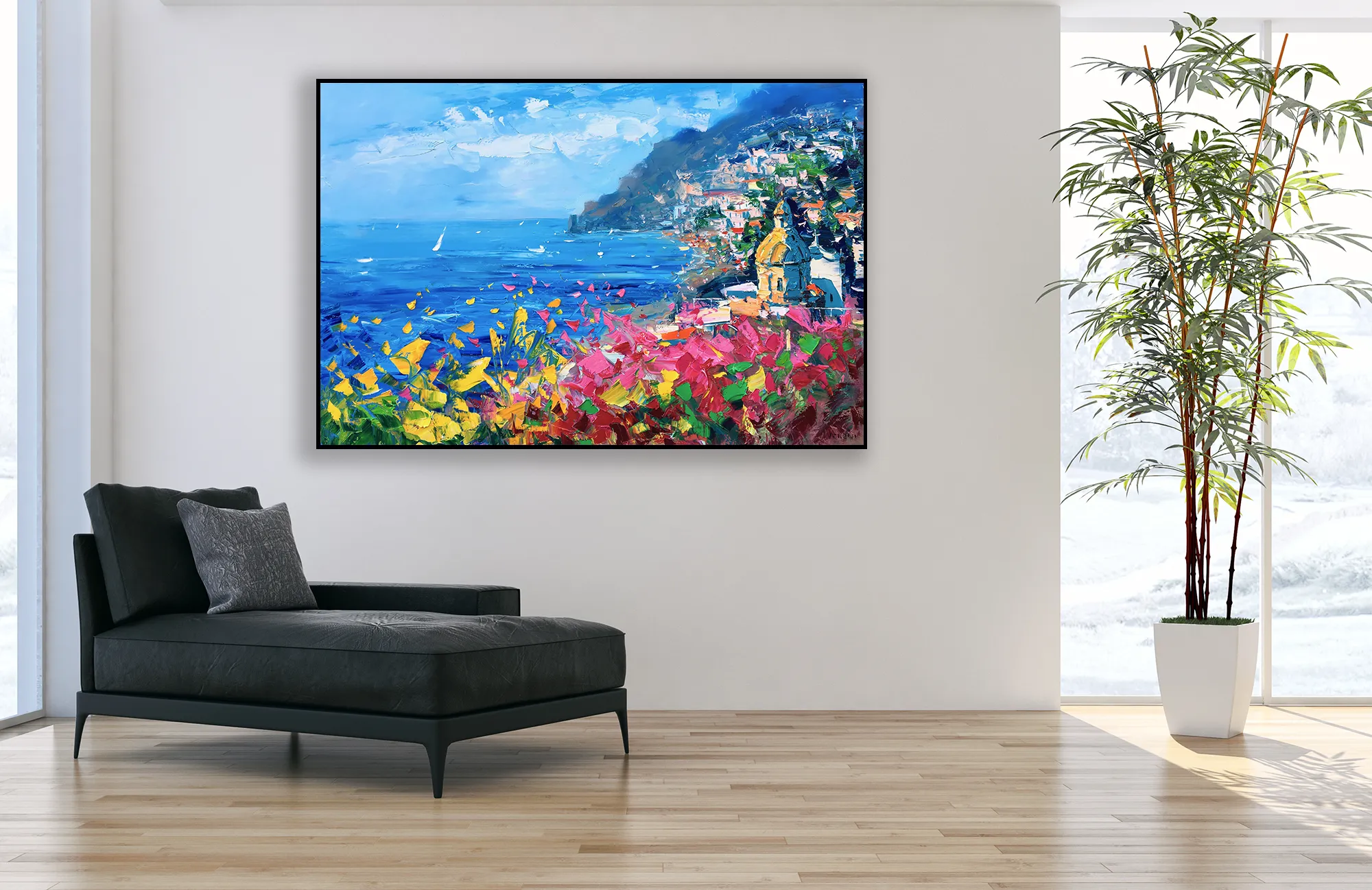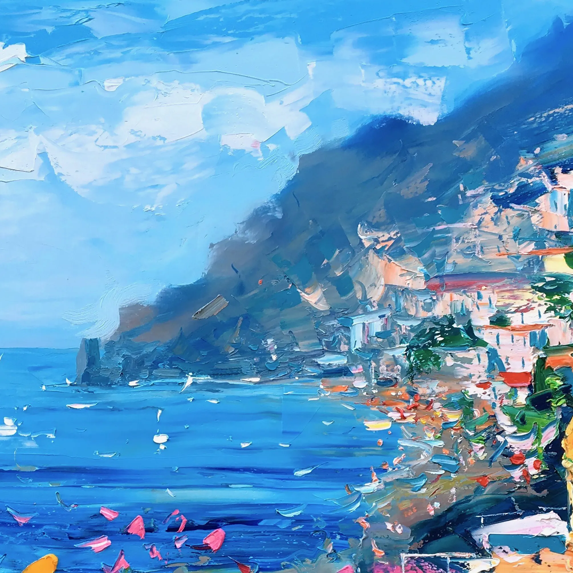 In extra large horizontal format, the painting takes shape through a textured art approach using the impasto technique with palette knife and brush. Thick layers of oil paint interact with light, enhancing surface movement and physical presence. This Amalfi Coast seascape painting brings freshness and character to refined interiors, making it ideal for coastal homes and collectors seeking expressive, ready to ship artwork.