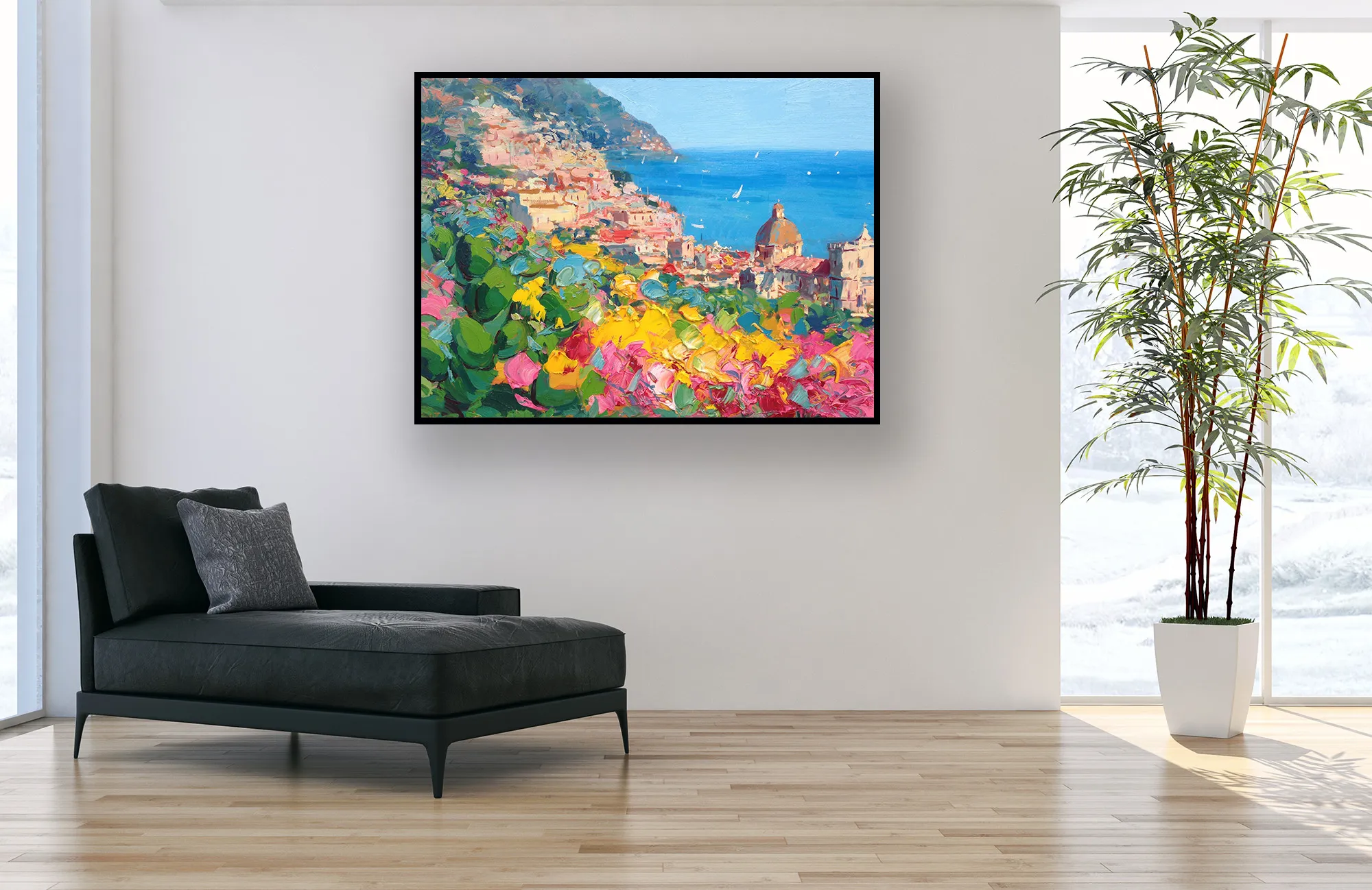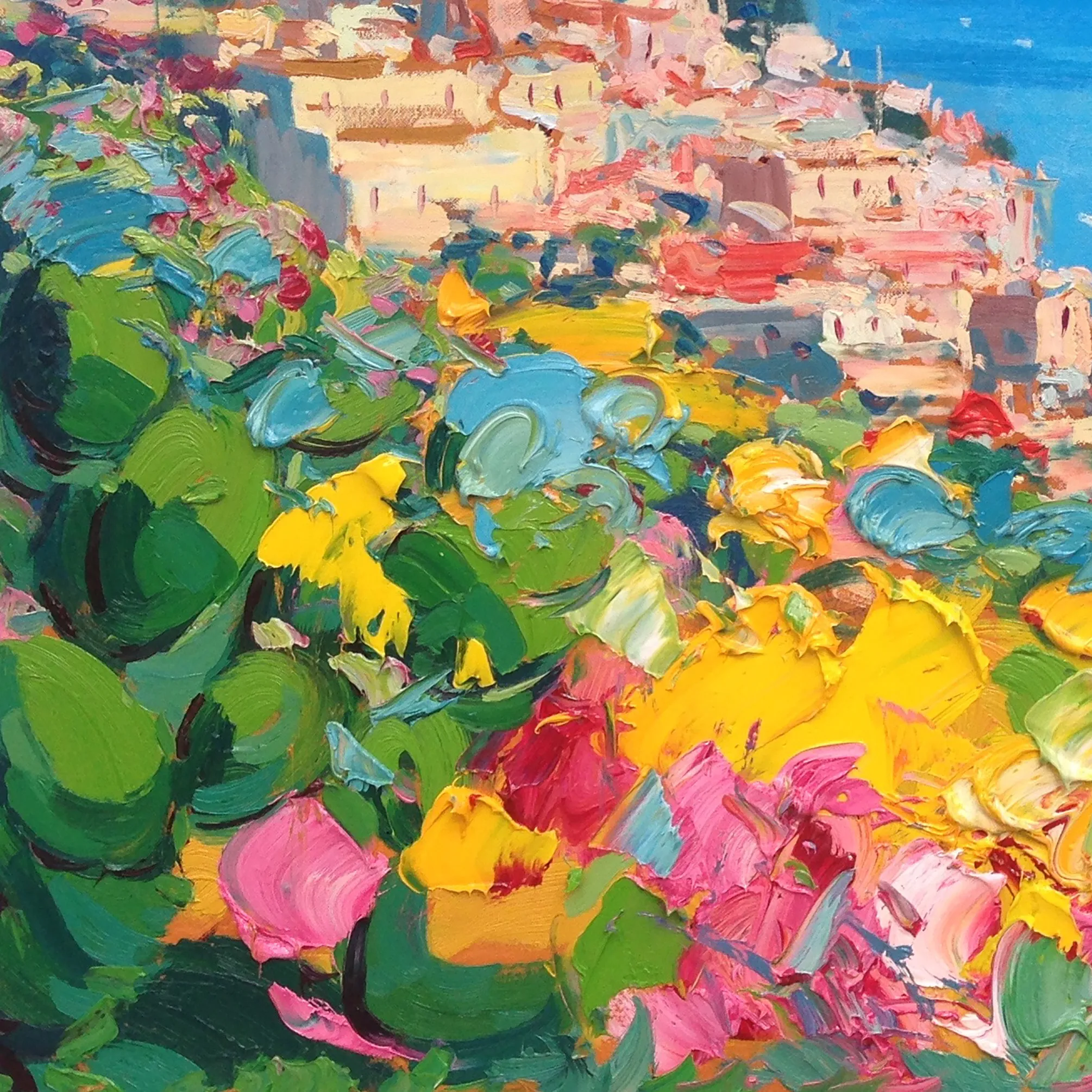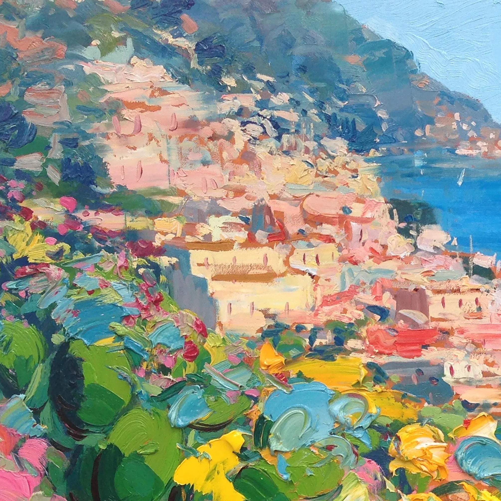 Positano garden view oil painting on canvas, hand-painted artwork created in a modern impressionist style. The composition captures lush Mediterranean vegetation in the foreground, with layered greens, warm floral tones, and vibrant coastal colors. Expressive brushstrokes frame the hillside village, while the deep blue sea appears beyond the garden. Light, movement, and chromatic contrast convey depth, freshness, and a serene coastal atmosphere.