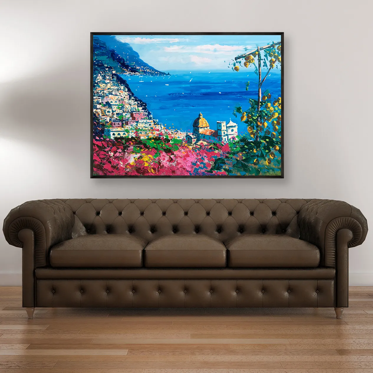 In a horizontal format, the painting takes shape through a textured art approach using impasto. Palette knife and brush build thick oil layers that interact with light and enhance tactile presence. This Italian coastal landscape oil painting adds character and luminosity to refined interiors. Ideal for collectors seeking expressive texture, Italian scenery, and contemporary impressionist language. The artwork suits living spaces where color, depth, and atmosphere are essential.
