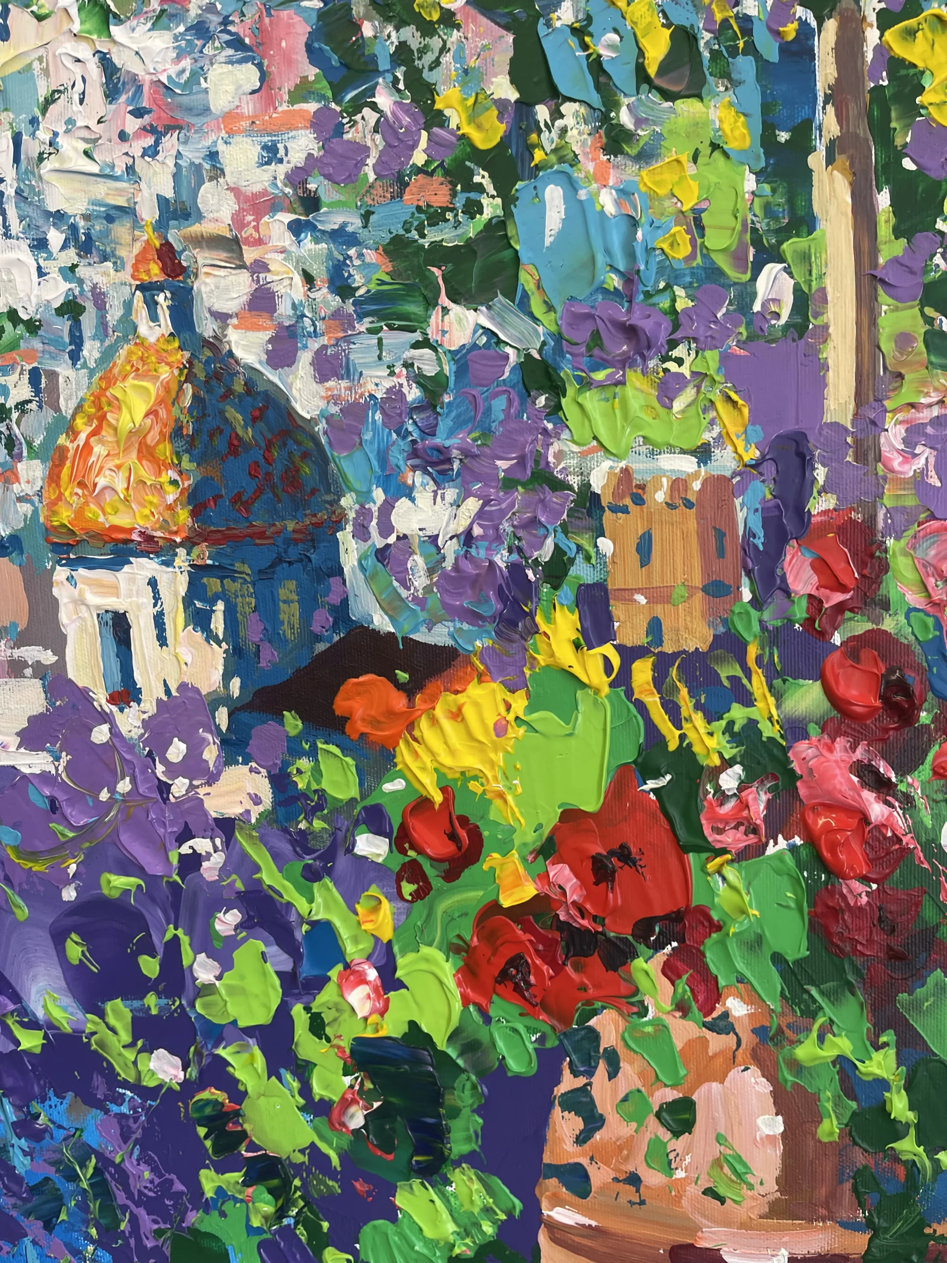 Positano Terrace View Oil Painting on Canvas, Flowers, Sea View, and Mediterranean Coastal Atmosphere
