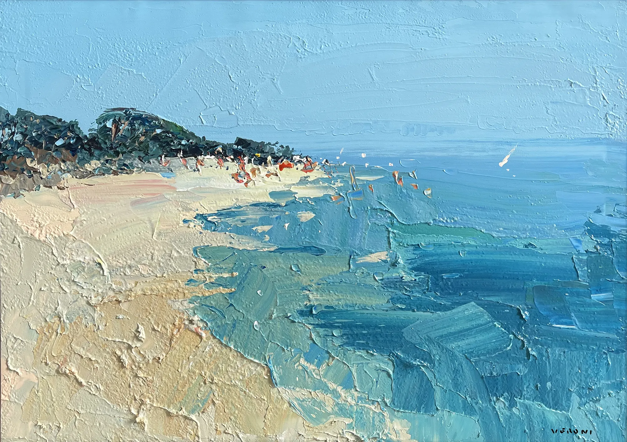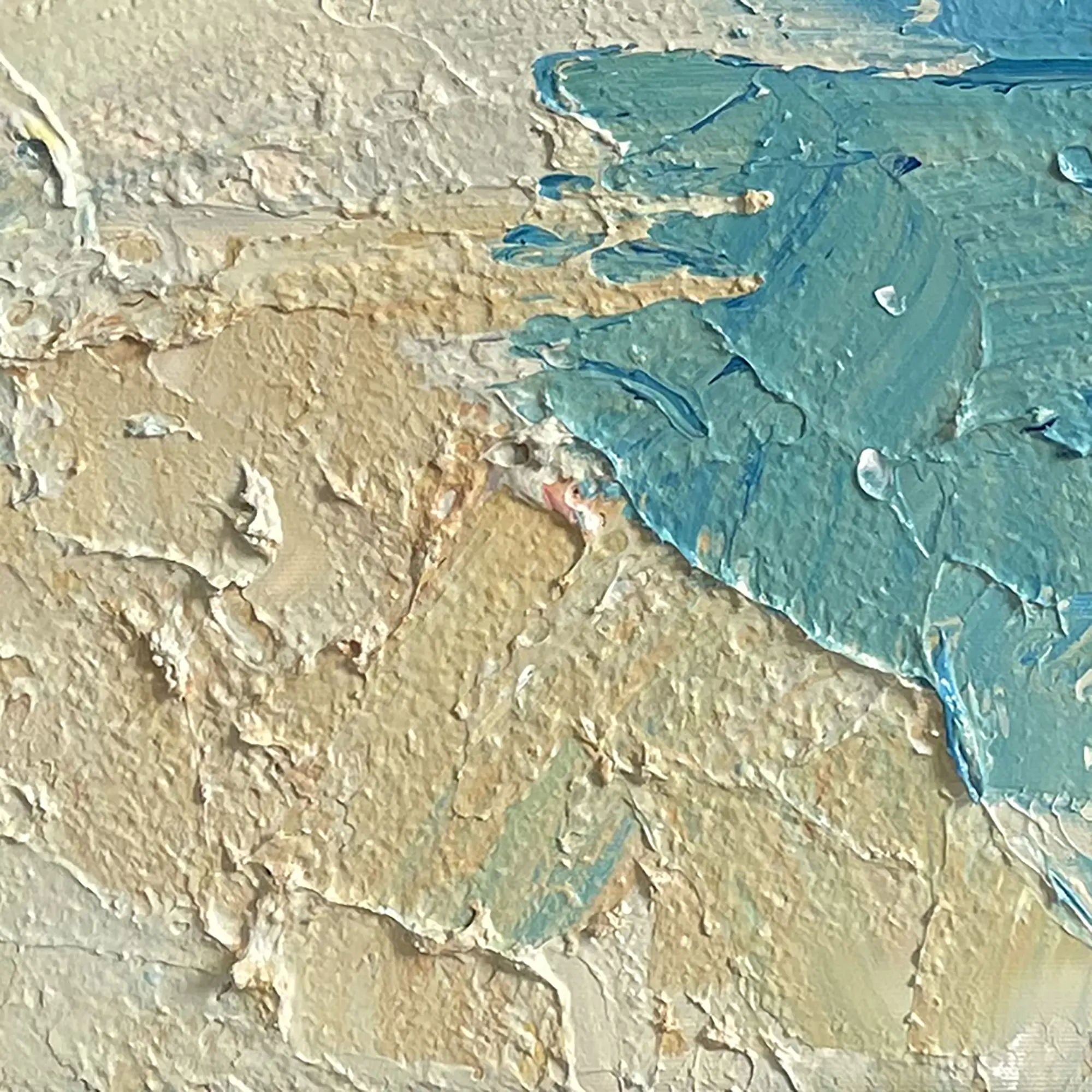 This work explores the Modern Impressionist style through a luminous palette. I used a palette knife to apply thick oil paint, creating a rich impasto texture that makes the waves and sand feel three-dimensional. This technique perfectly captures the shimmering light of the Italian Riviera. The contrast between the pale sky and the deep sea creates a vibrant coastal energy. Every stroke reflects the beauty of the Mediterranean coast.
