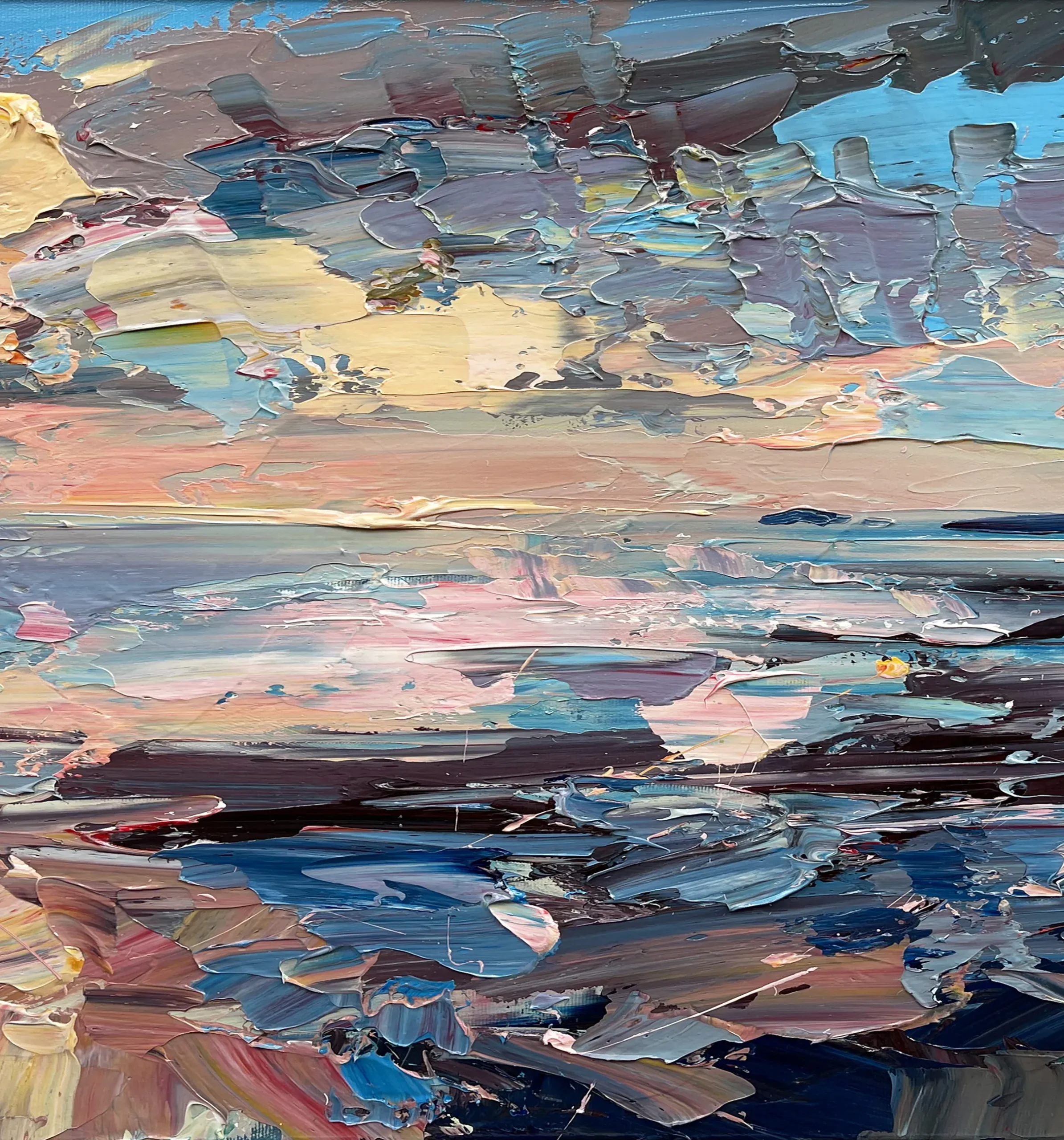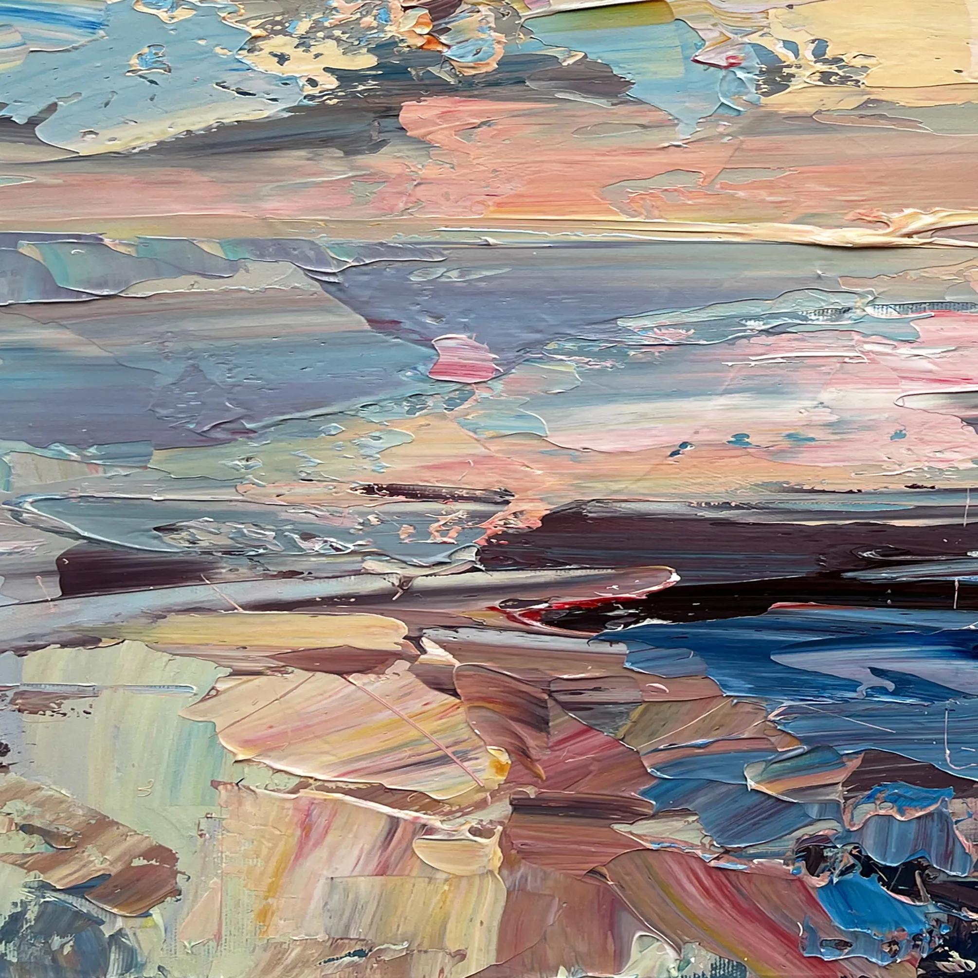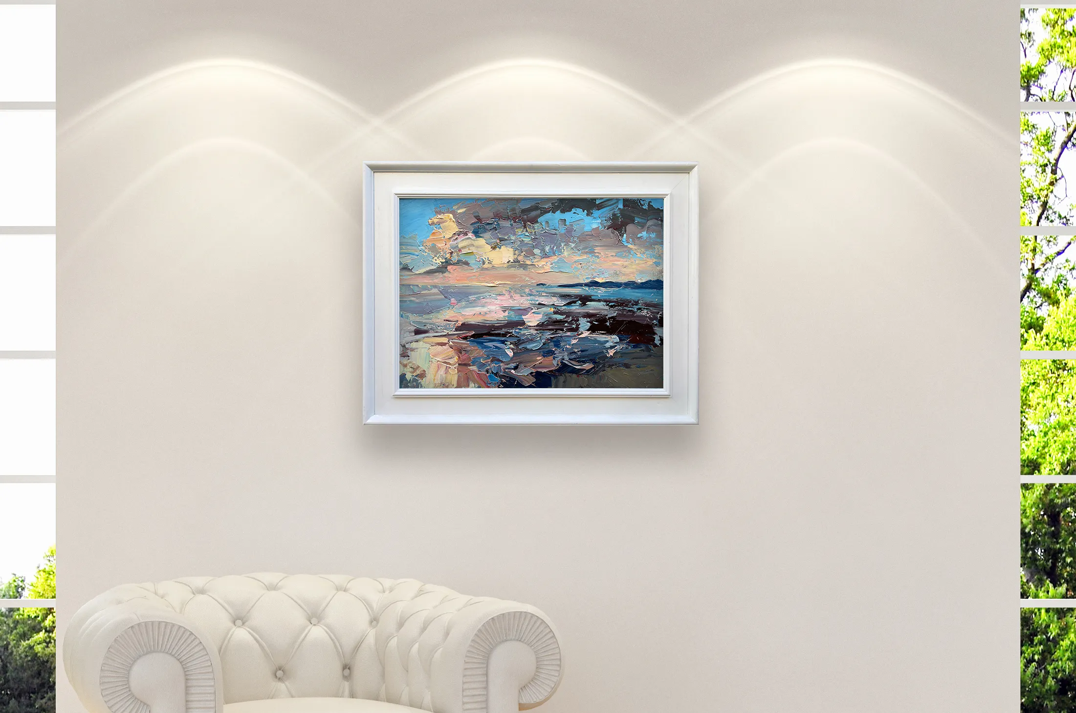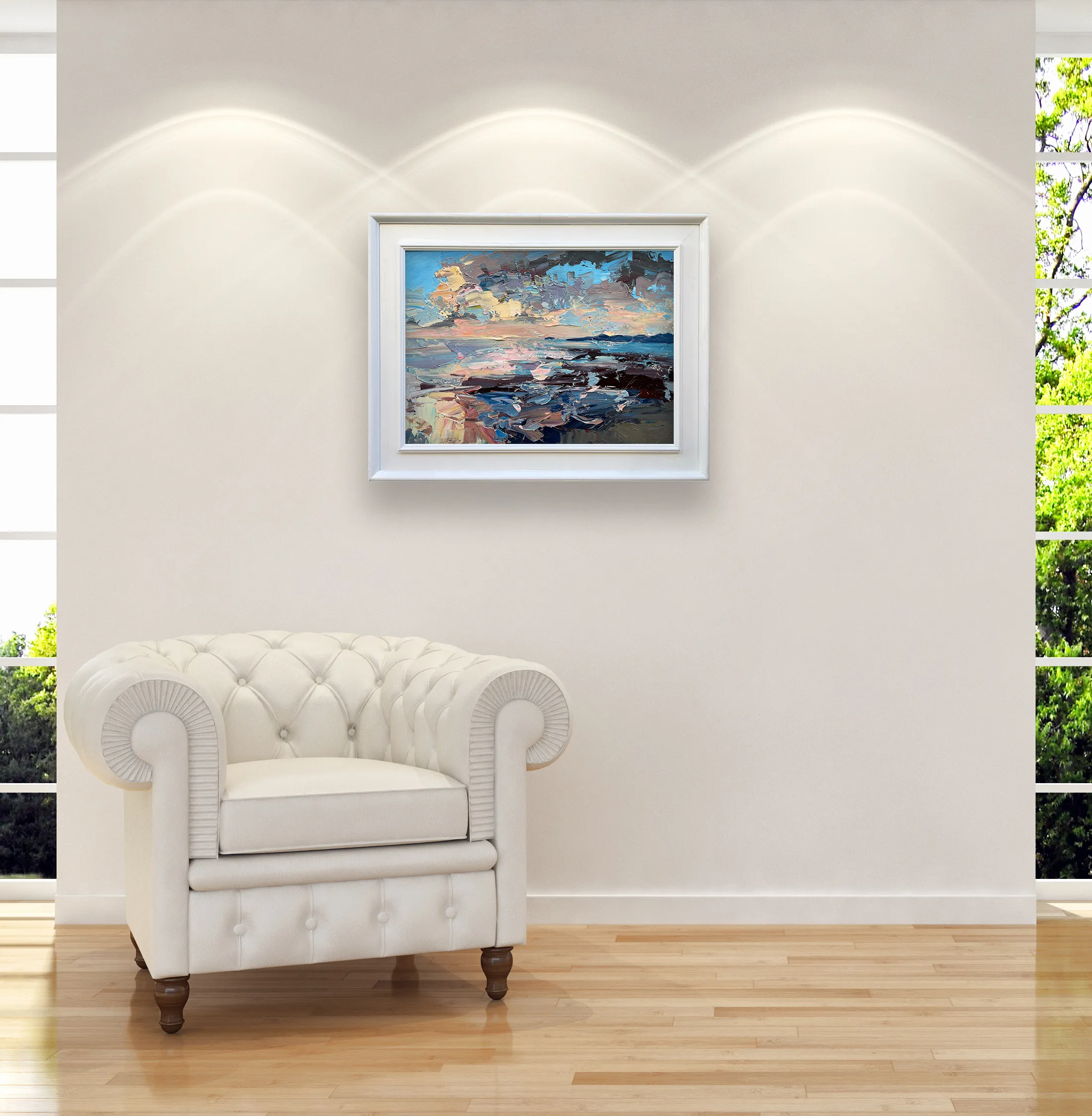 In a horizontal format, the painting takes shape through a textured art approach using the impasto technique with palette knife and brush. Thick layers of oil paint interact with light, enhancing depth, movement, and physical presence. This sunset coastal seascape painting brings warmth and visual harmony to interior spaces, making it ideal for refined homes and collectors who appreciate expressive, atmospheric oil paintings.