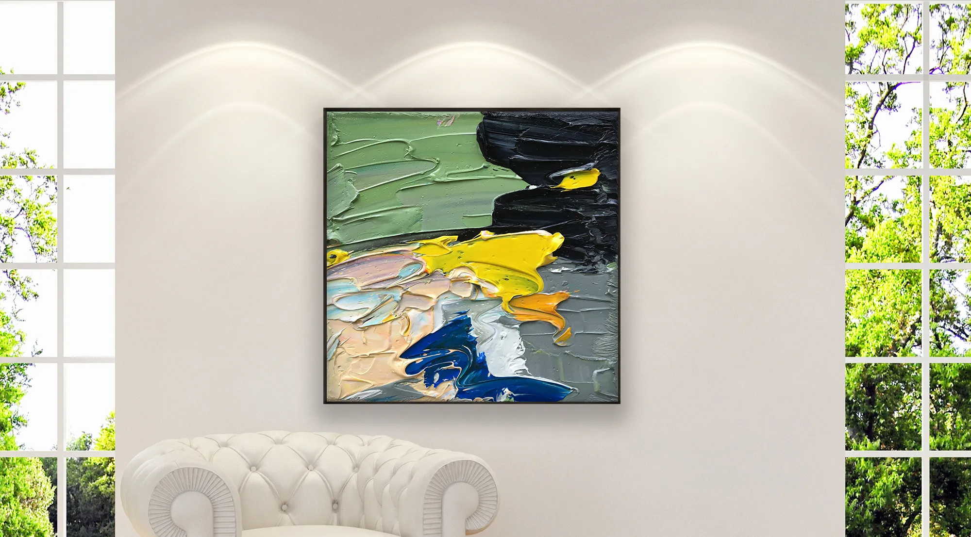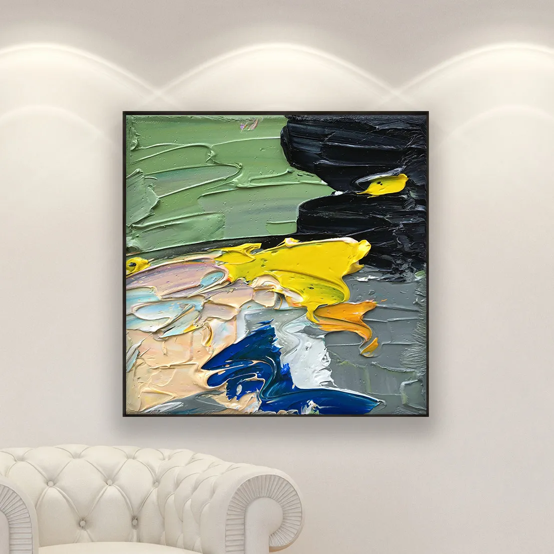 In this original abstract oil painting, I focused on the raw power of color and touch. Using a palette knife technique, I applied thick, rhythmic layers of oil paint (heavy impasto) to create a deep, three-dimensional texture. This modern expressionist style emphasizes the spontaneous contrast between vibrant yellows and deep blues, capturing a sense of movement that changes with the light.