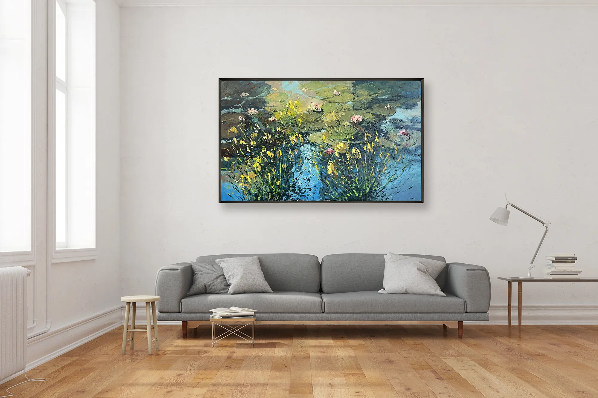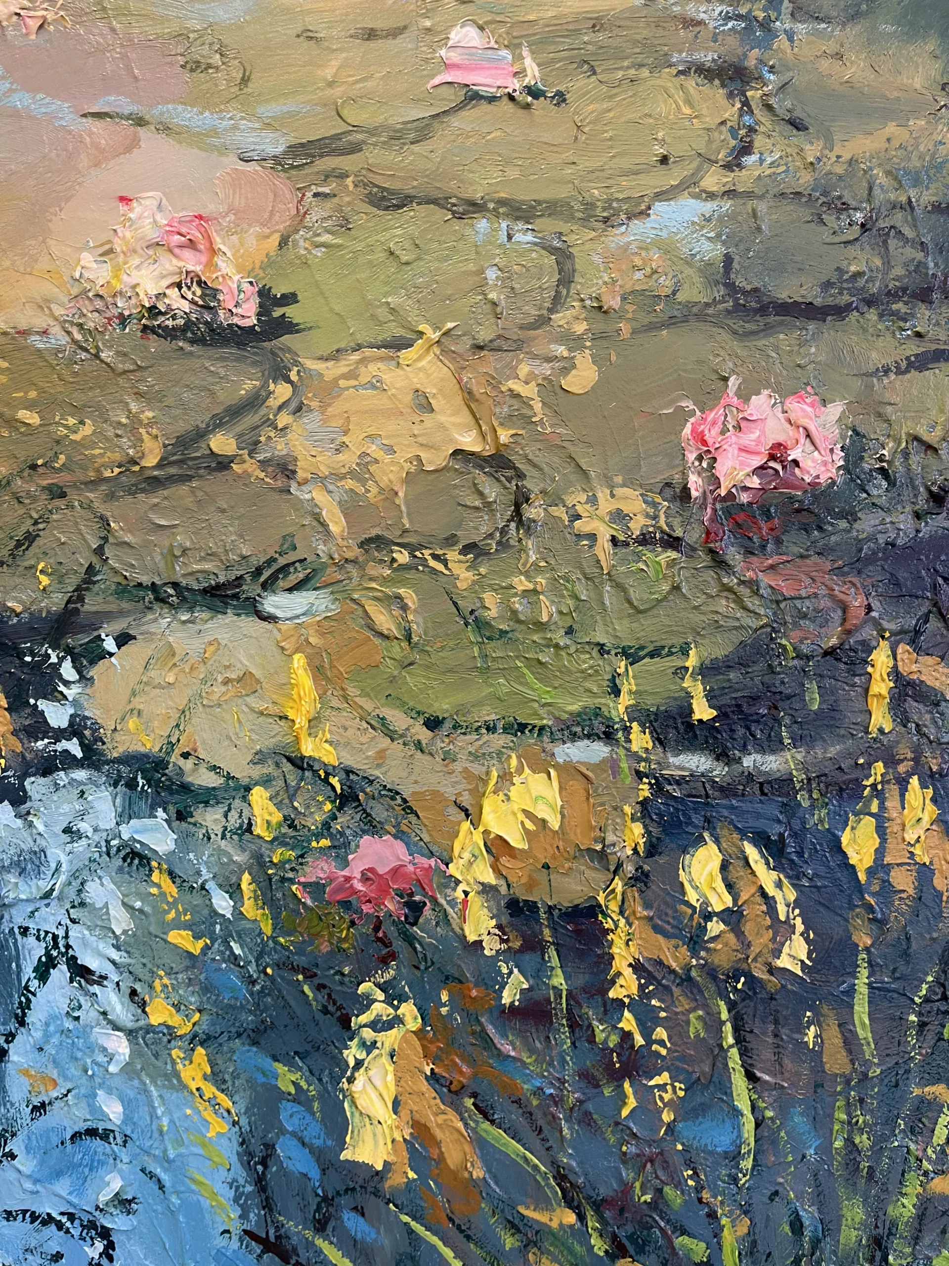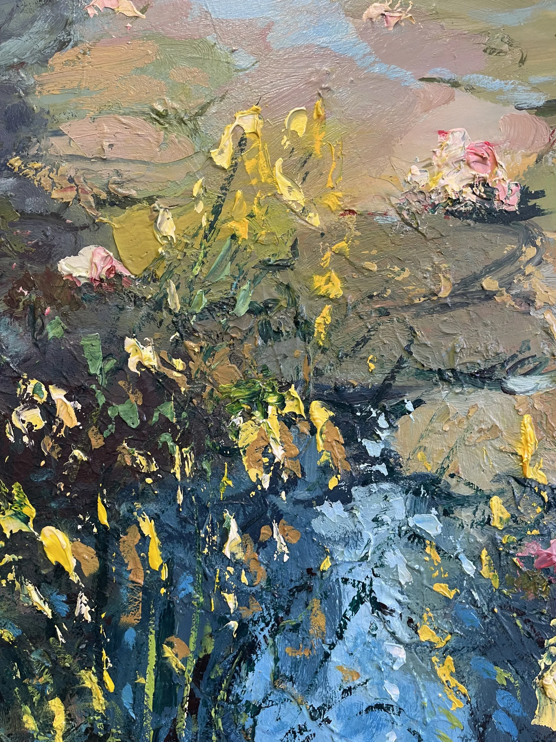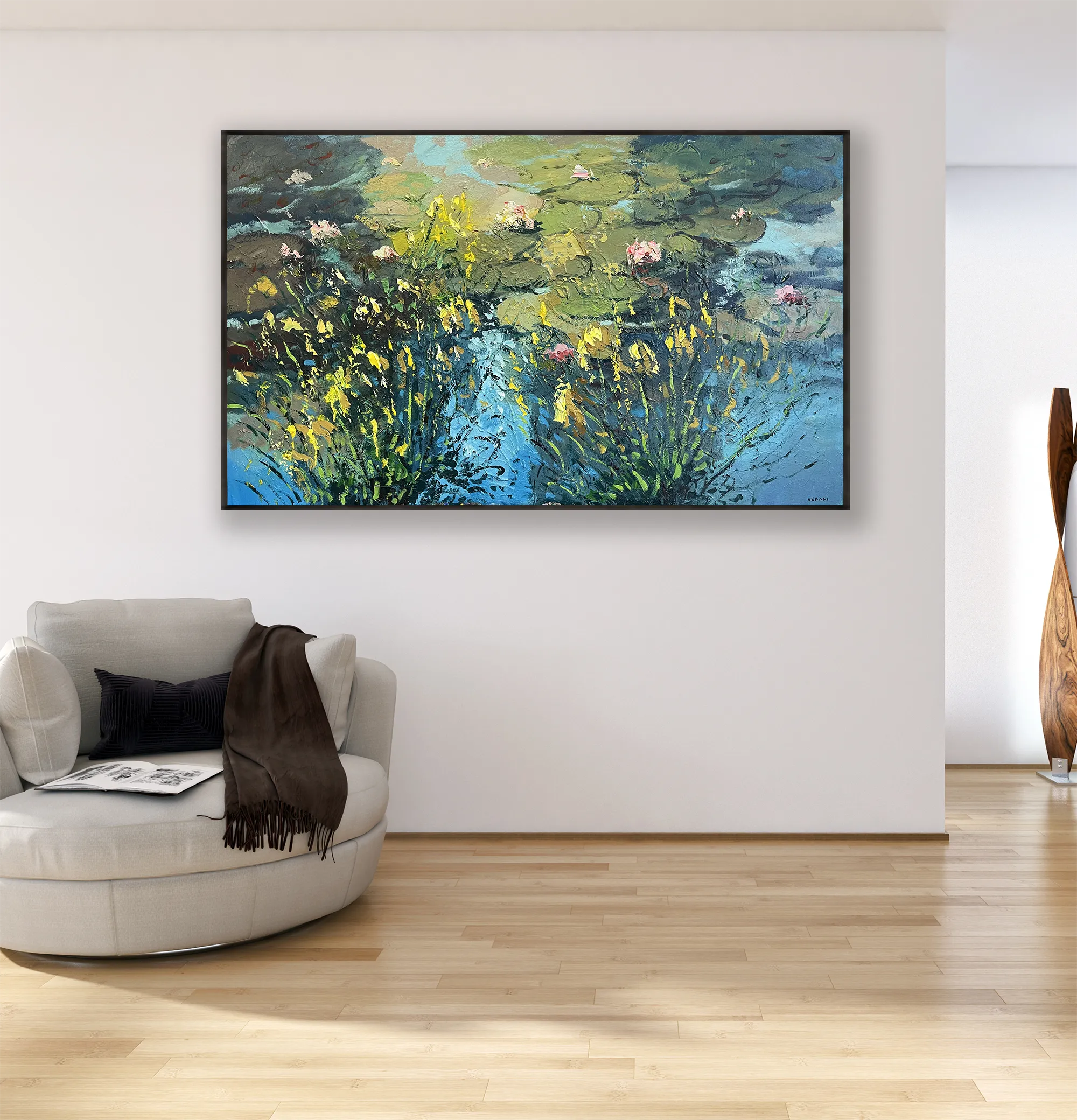 In a wide large horizontal format, the painting is developed through a textured art approach using a combination of palette knife and brush. Thick layers of oil paint interact with light, creating depth, movement, and a strong tactile presence across the surface. This impressionist floral oil painting brings atmosphere and refined elegance to interior spaces, making it ideal for sophisticated homes and collectors who appreciate expressive, nature-inspired art.